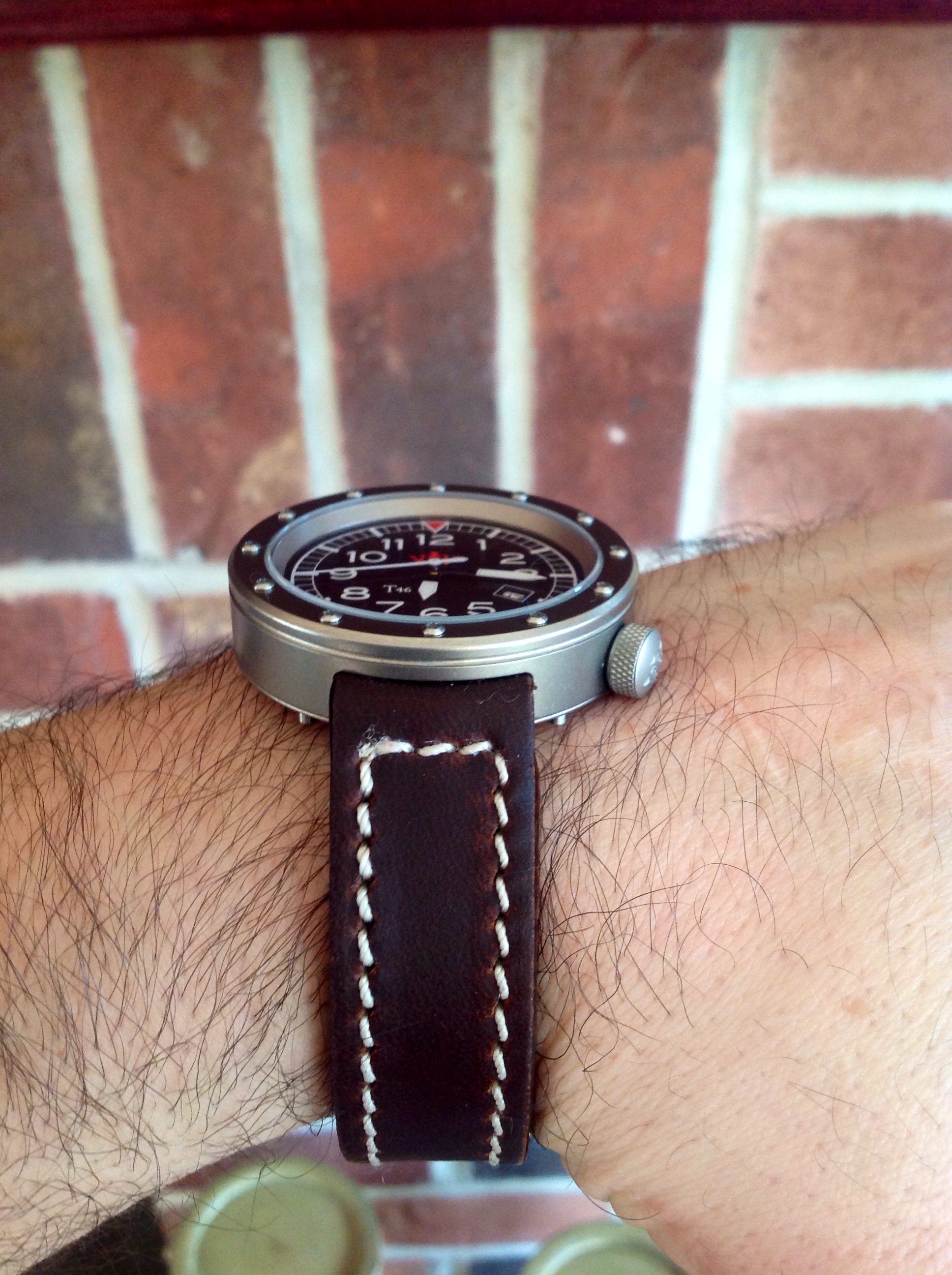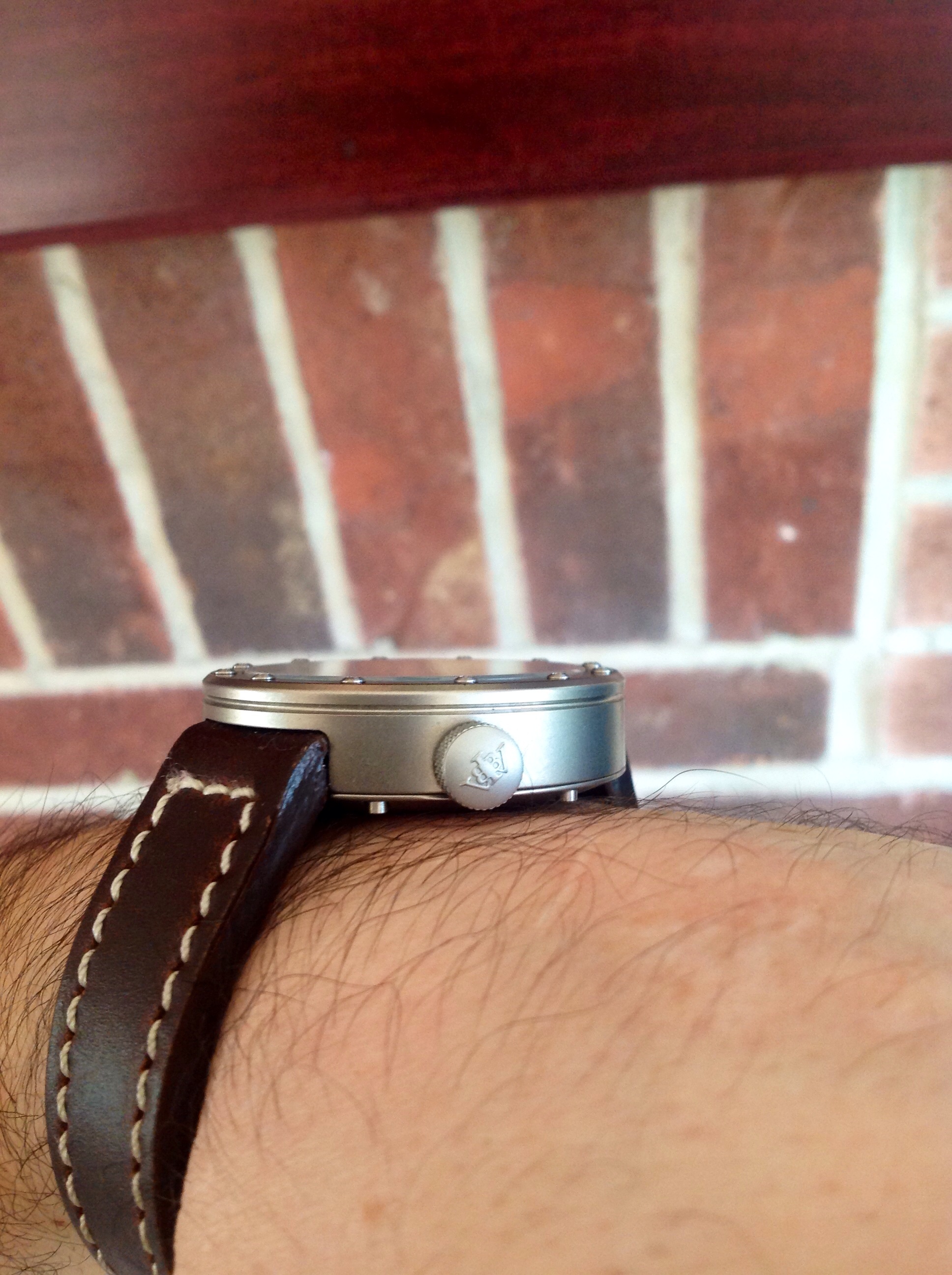 The strap is a Horween Chromexcell leather. It’s super soft and very comfortable. It has nice white stitching. I can wear this watch to sleep in that’s how comfortable it is. I bought both the black and the brown strap. The brown has to be my favorite of the two. The brown tones are so rich.