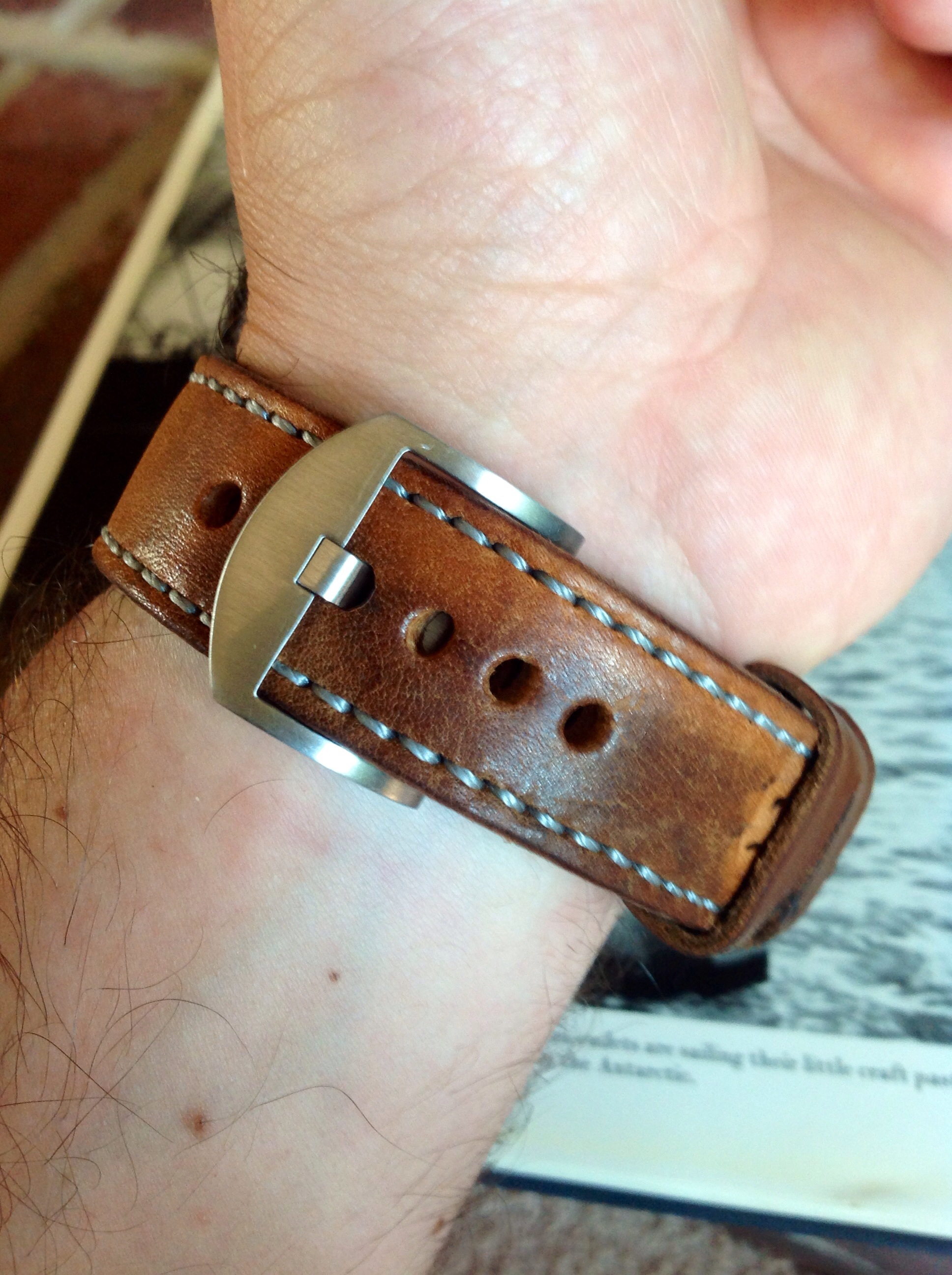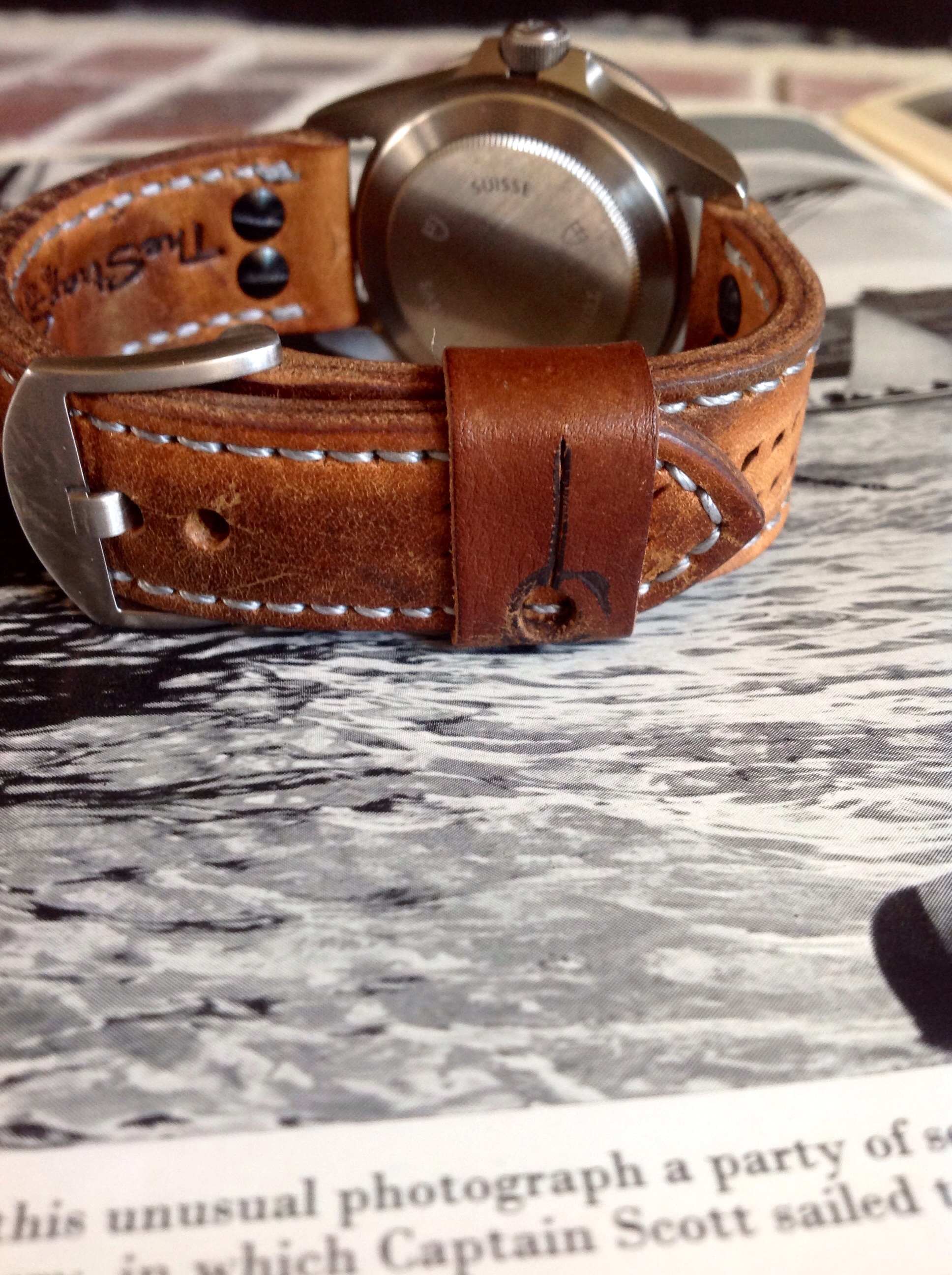 The strap arrived in a cool custom pouch with ‘The Strap Smith embossed on the outside front. As soon as I opened the mailer envelope I was instantly hit with the amazing smell of leather, 100 year old leather to be exact. Hence the name of the strap, “The Time Traveler”. There is also a hand signed card from Rob included in the package, which I thought was a nice touch.