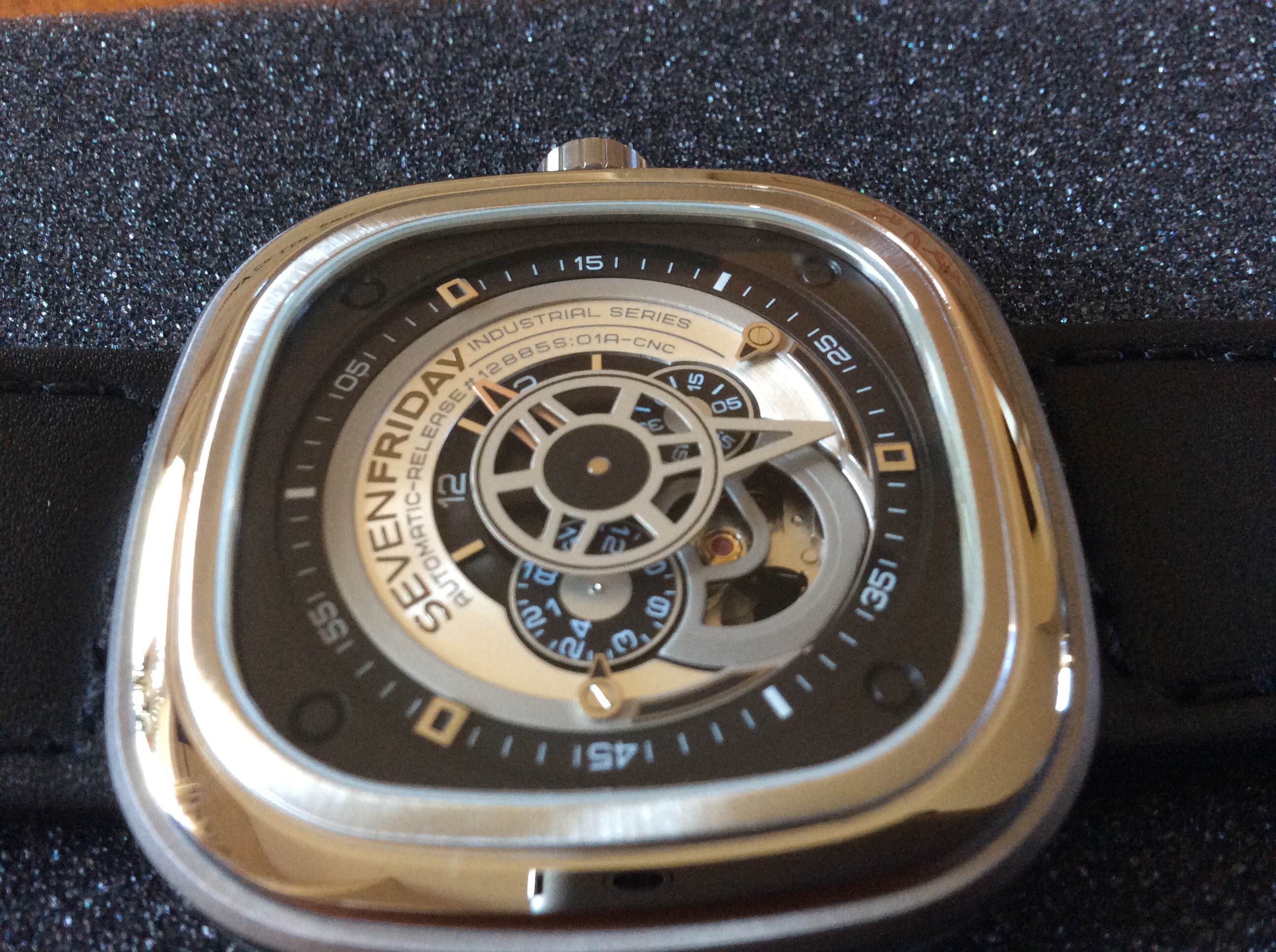 The square shaped case is a departure from the typical cases I usually am drawn to. It measures in at an impressive and attention grabbing 47.6mm x 47mm. I really like the P1-1 case design though, I don’t think a round case would do this watch any justice. The square shape is perfect for the design and feel to the watch. I don’t want to label this watch as a steam punk because I don’t really think it is, but it definitely has a retro, edgy look and feel. The sides of the case are brushed steel and around the dial it’s high polished steel. I like the case back on the P1-1 a lot, simple yet there’s nice details. Such as the small picture engravings that indicate the case size, the strap size, the water resistance and the movement, each with corresponding pictures and measurements. The SevenFriday name and logo are also on the caseback which I really like the press logo. The crown design ties in nicely with the dial as it features a engraved gear which nickel matches the ornamented gear style hands. The crystal is a hardened, anti reflective treated mineral crystal. This is my only complaint about this watch, I wish it was sapphire crystal. I think this should be automatic addition to any watch over the $500 mark. The SevenFriday name, along with automatic release, and industrial series are clearly printed on the dial, all balanced and not too big. Another nice attention to detail on the case is how each layer of the case has different finishing, brushed around the crystal,then polished and then brushed again, this adds great depth to the top down look of the watch.