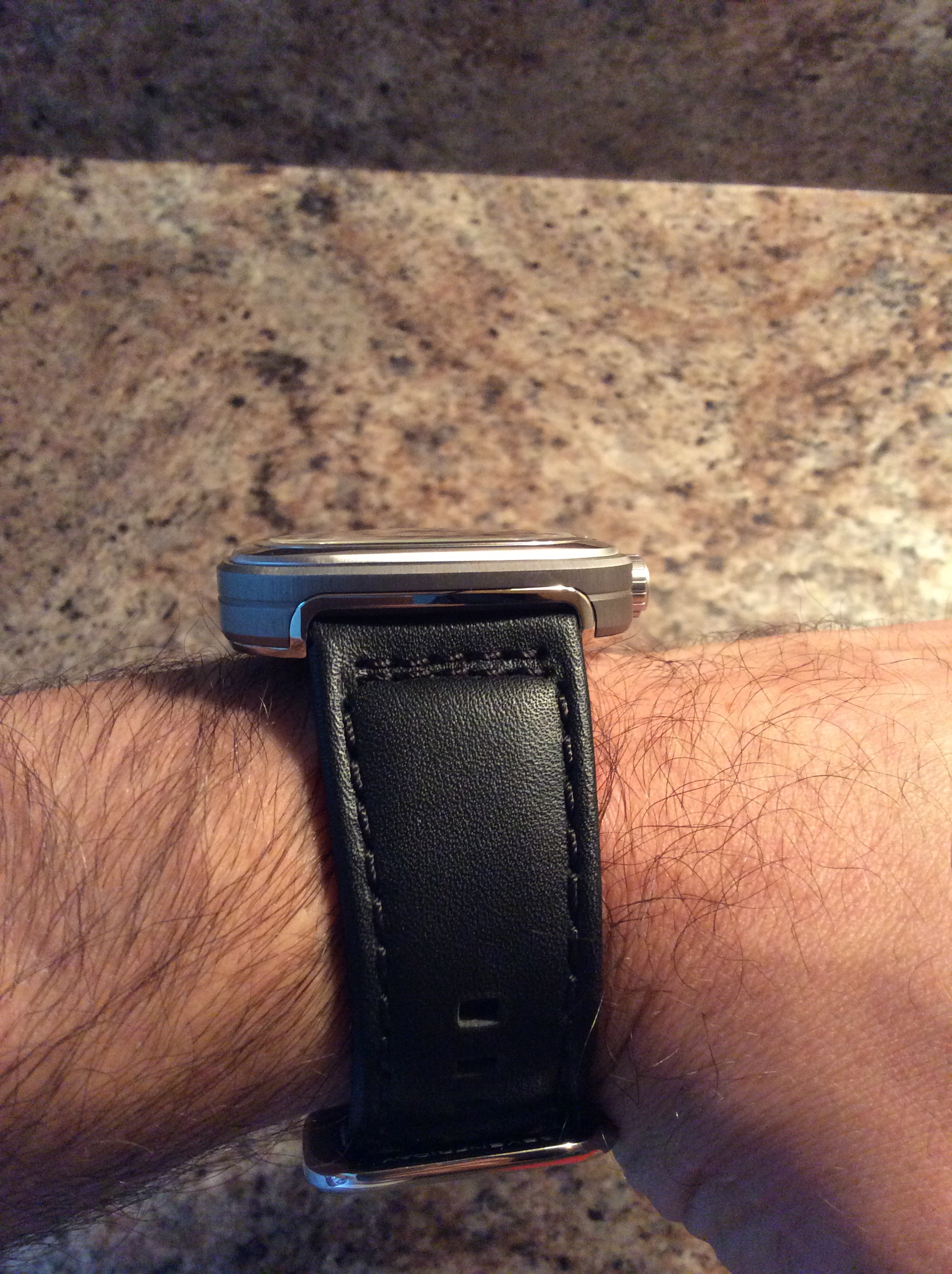 The strap is a straight forward padded black leather strap with a tang style buckle, which is signed underneath with SevenFriday. The strap attaches to the case via an integrated lungless case on the back side of the case itself. The strap is comfortable on the wrist and it measures at 28mm at the case and tappers to 24mm at the buckle. I would like to see a nice custom, distressed leather strap on this watch, I think with would really add to the overall look to this case.