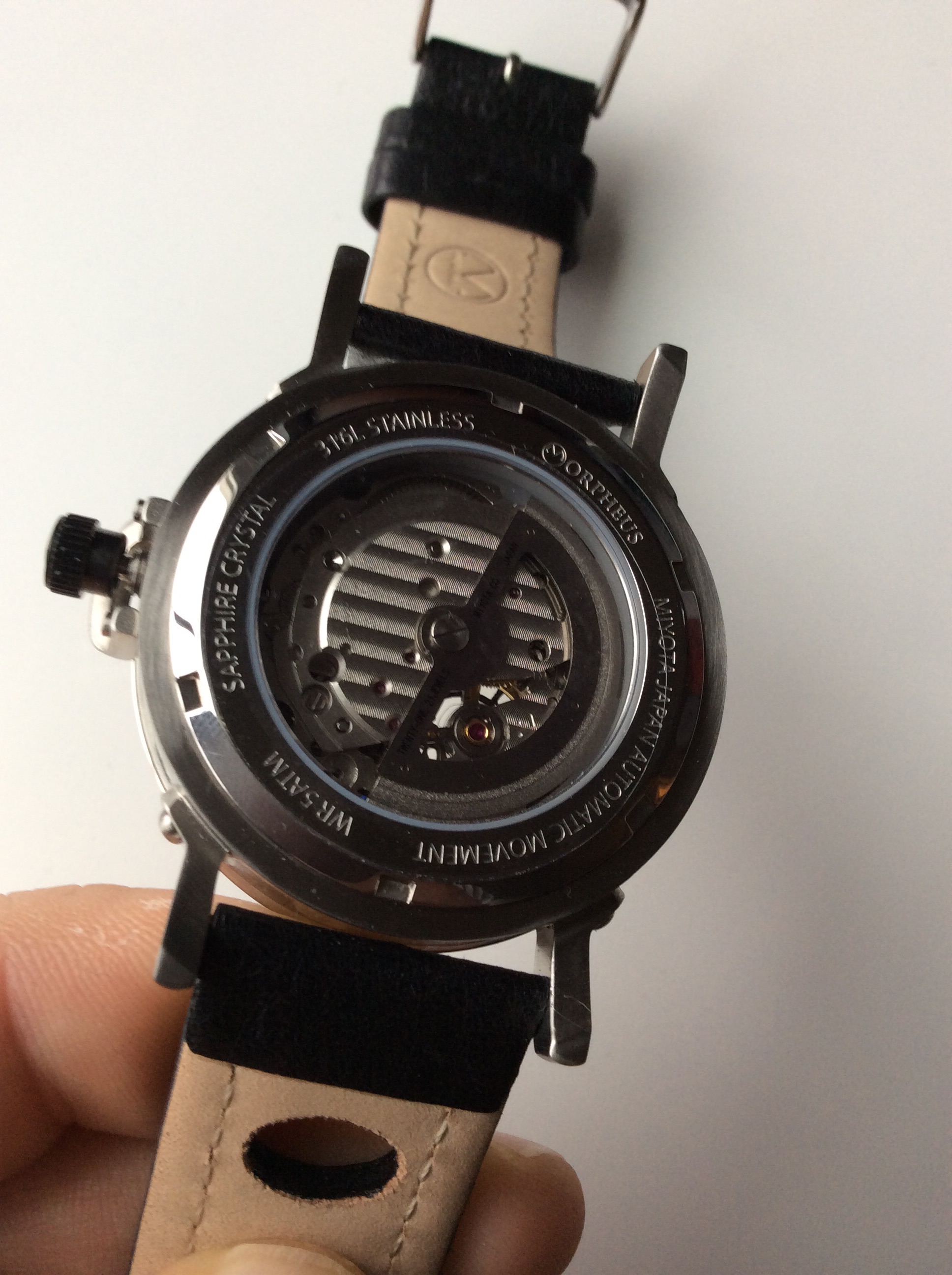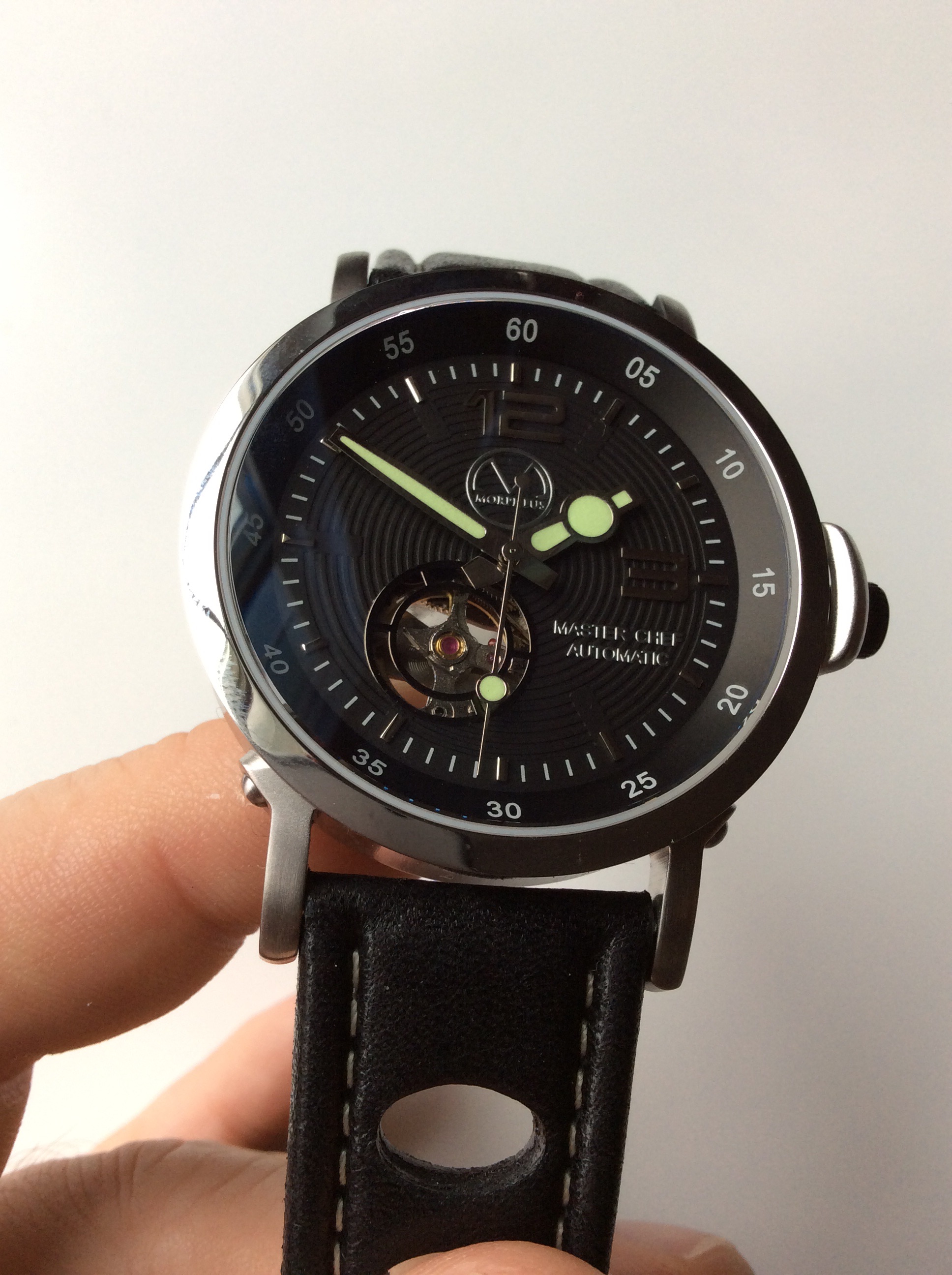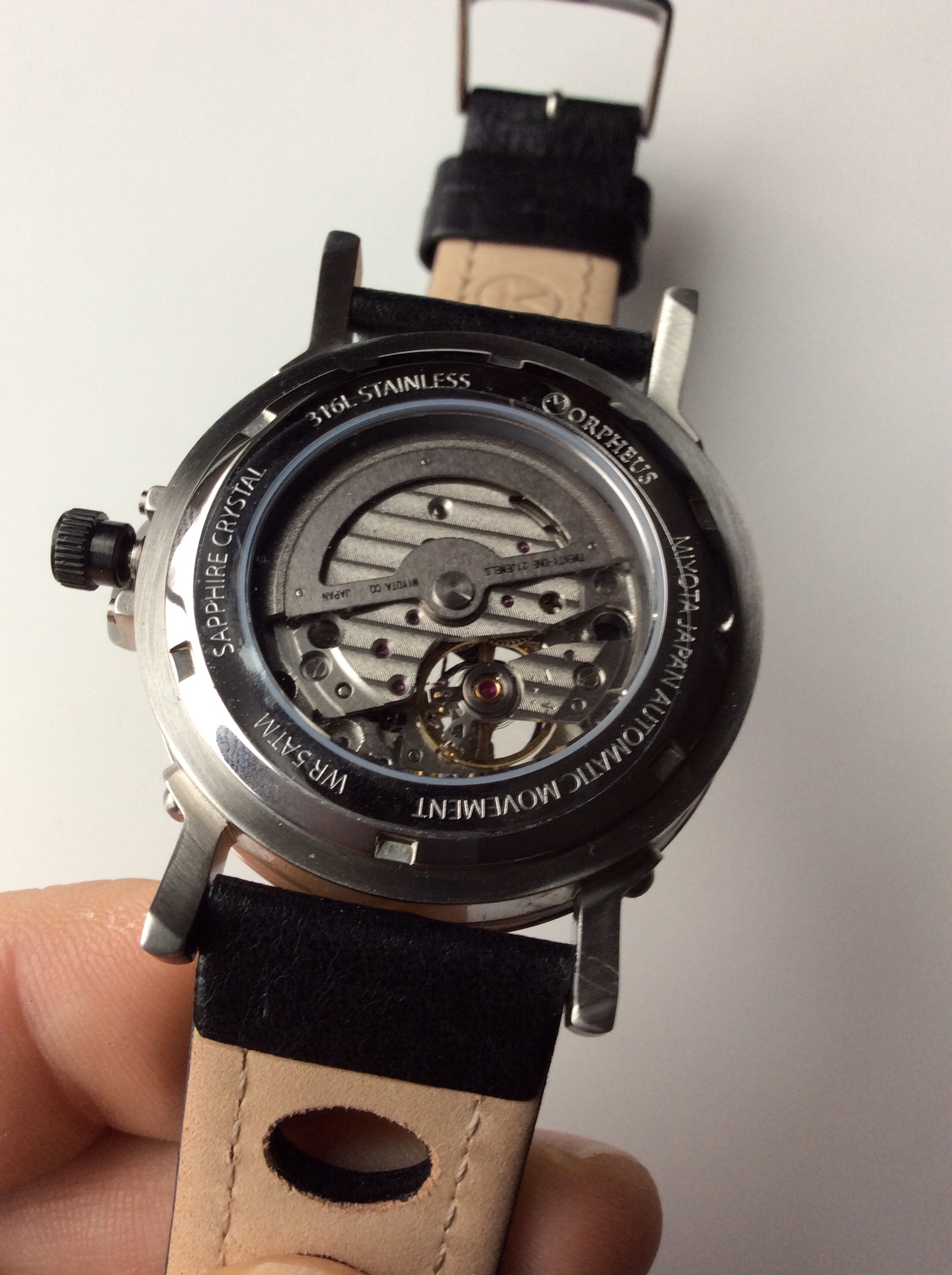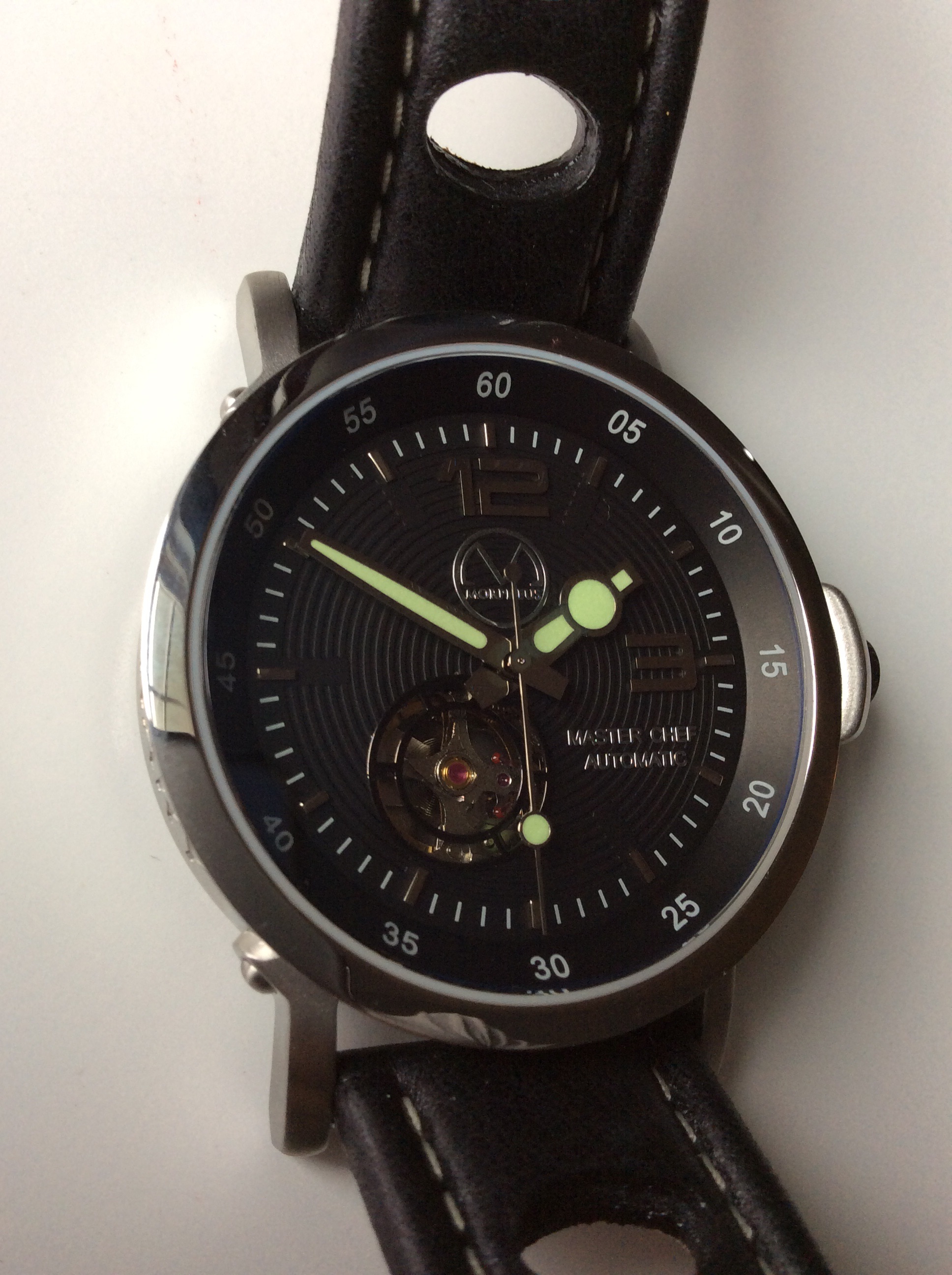 The strap is a racing style strap which features some holes which are perfect for those hot kitchen cooking moments allowing some breathability. The strap is made from lesther and is signed with the Morpheus name and logo. The buckle is unsigned and stainless steel and functions as it should. The strap is very comfortable to wear.