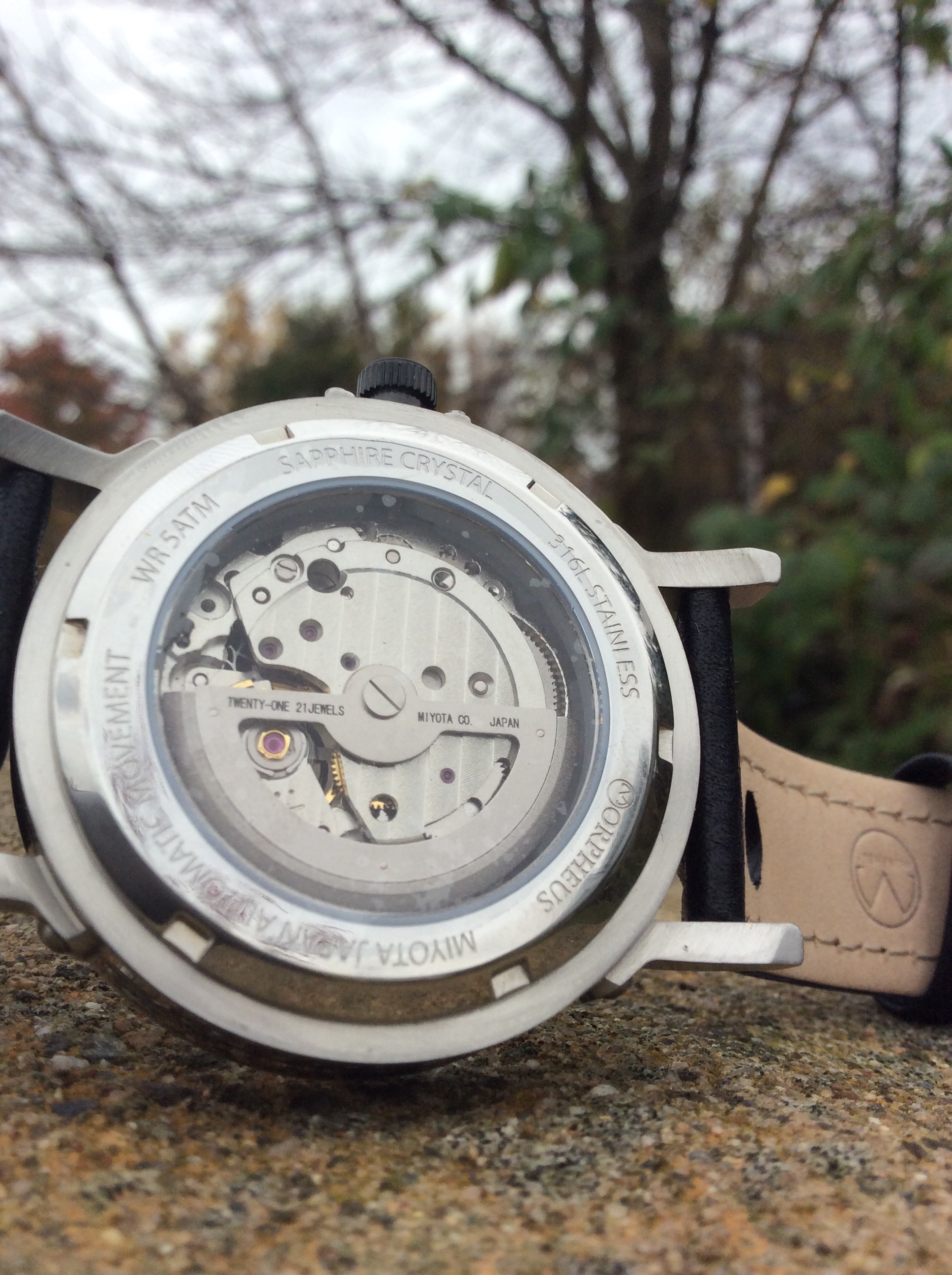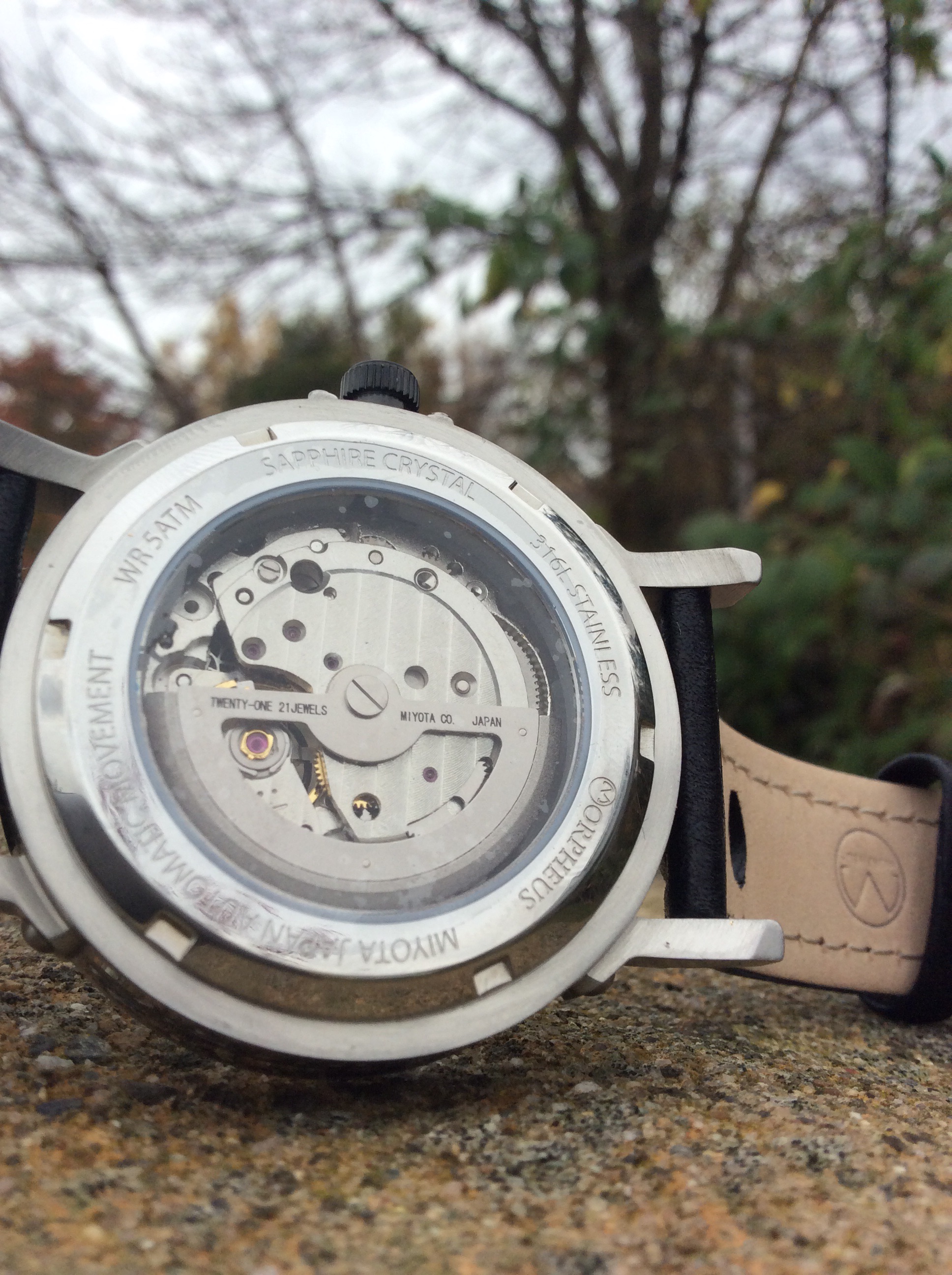 The movement is a Miyota 82SO 21 jeweled automatic open heart. It’s a very reliable and tough movement and a great alternative to the ETA auto movements. Keeps great time with a +/- 10 seconds per day from my wearing experience and time with this watch.