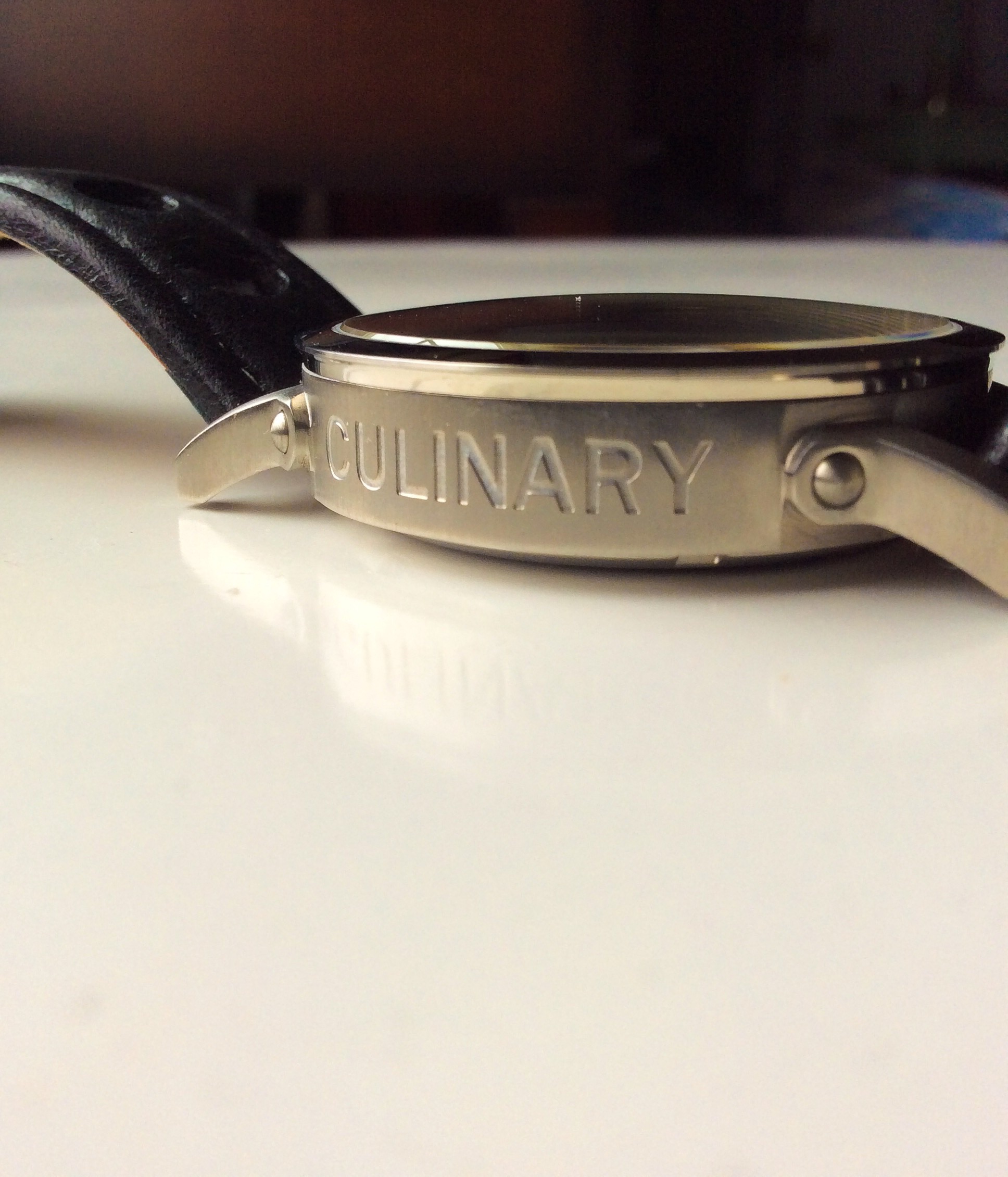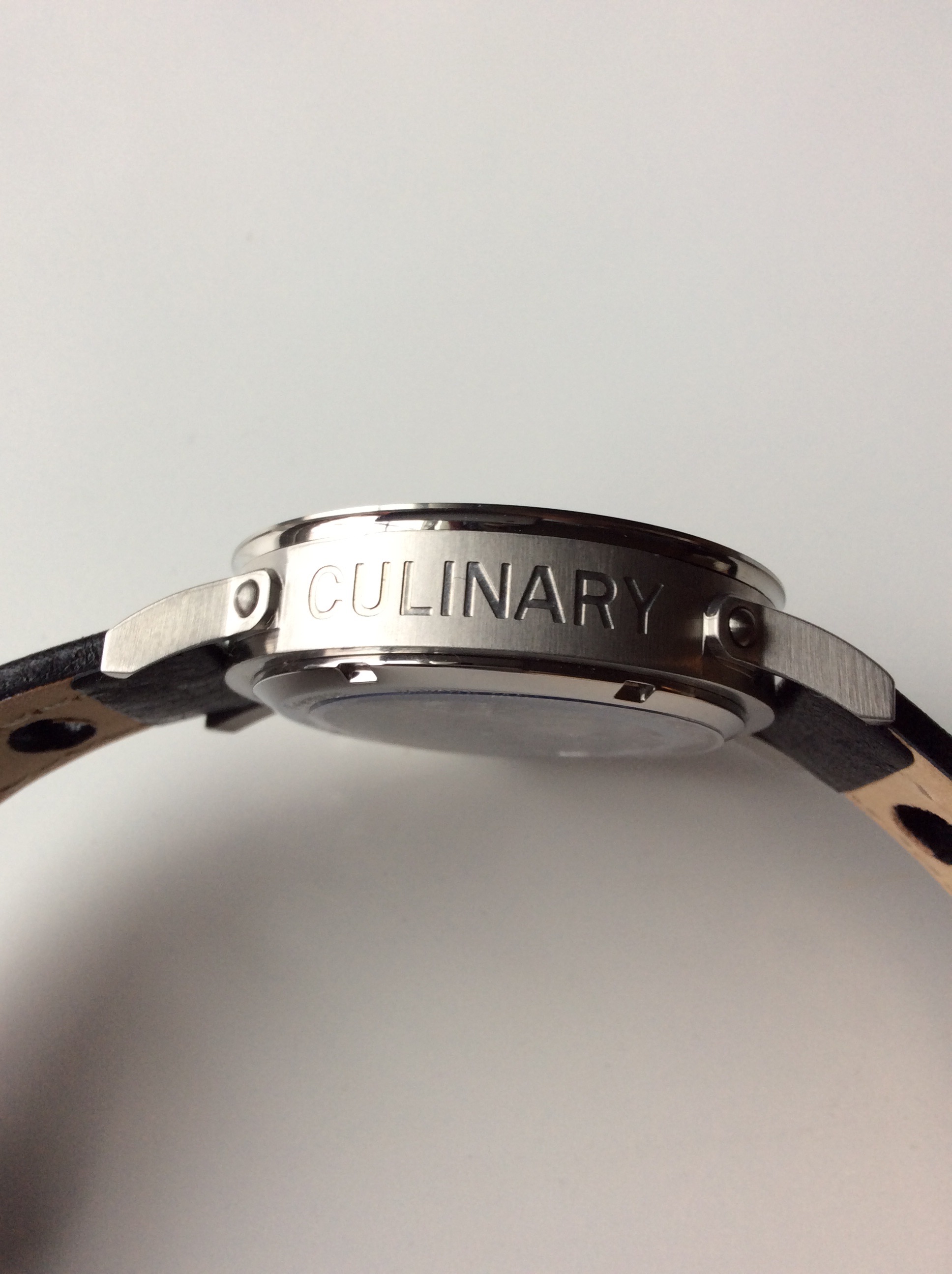The case is made of 316L hardened stainless steel with a combination of brushed and high polished parts, the sides of the case, lugs are brushed while the dial window and caseback are high polished. What I really like about the case is its dedication to the theme of the wacth itself, every little detail is well thought out and planned to making this a very themed driven timepiece. The lugs are attached to the case with a rivet just as handles on a frying pan are attached. On the crown side, the crown guard resembled a stock pot handle also attached with the same rivet style. The crown is a screw down style which are my preference over the traditional push/pull style crowns. The outer crown is plastic and is designed to resemble a stove knob, which is so clever. I grew up in the kitchen with my grandmother teaching me how to cook from a very young age, so I was drawn in by the aesthetics of this clever watch. The caseback is a display back with sapphire crystal so you can view the movement of the watch. The non crown side of the case features the word ‘CULINARY’ I really like how well done this engraving is done. It adds so much to this case in terms of uniqueness and just an overall cool feature.