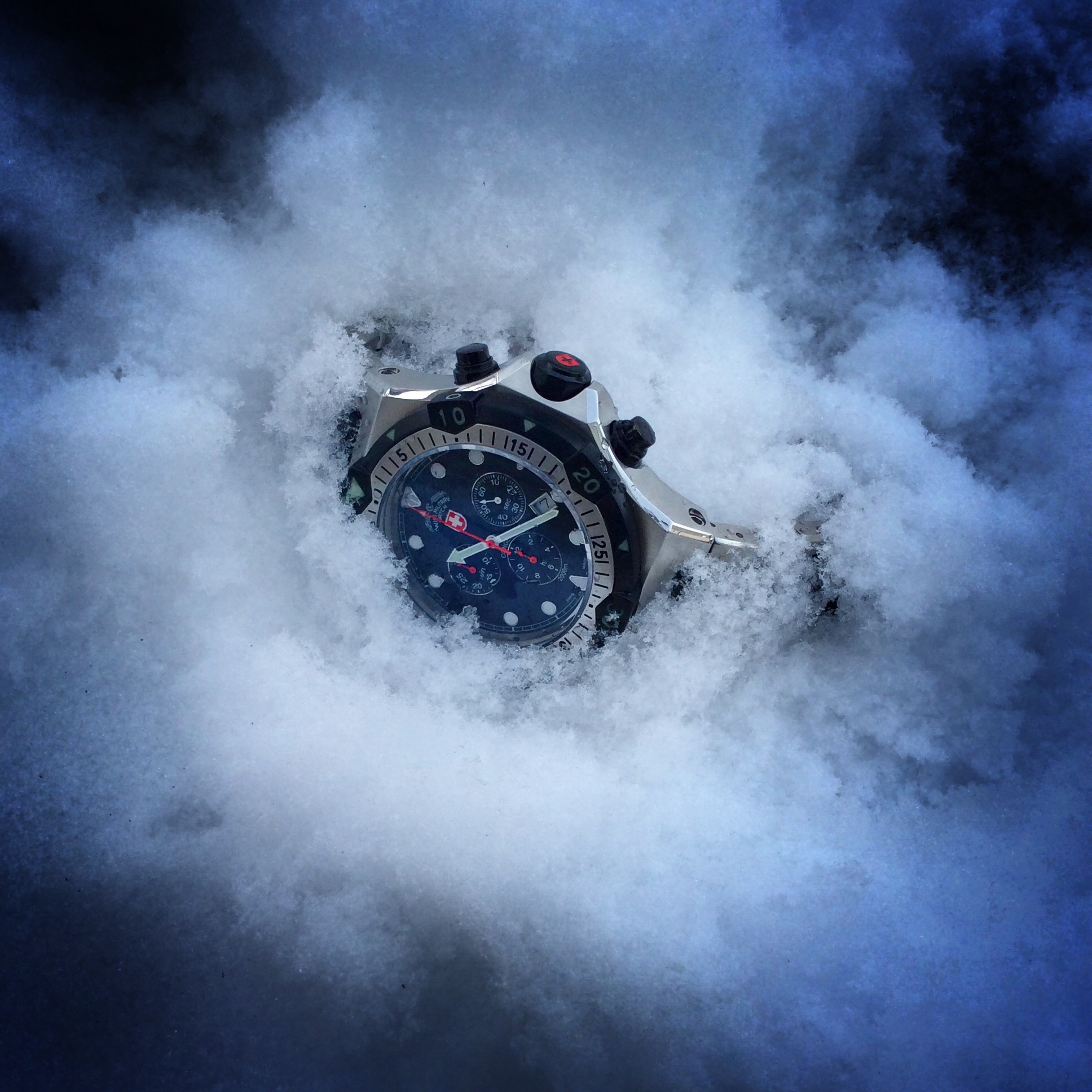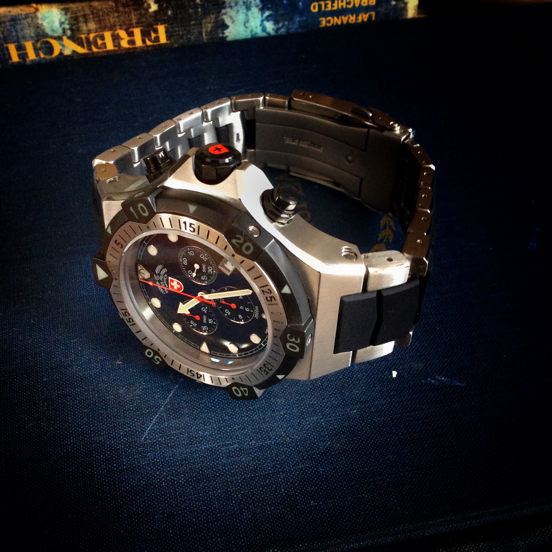 We all have our what we prefer on a watch and watch we don’t prefer it’s normal and completely natural. It would be pretty boring if we liked all the same things, if that were the case there would be one standard watch out there and that’s it. With that being said, I traditionally gravitate towards non Chrono, three hand dial watches. I didn’t know how I would feel about the CX Chrono. What I noticed first was the black dial, it is absolutely stunning. Everything on this dial was well planned out and is completely balanced. I personally prefer numersls for hour markers, but the raised applied round hour markers are beautiful and make perfect sense. If numerals were used for this dial, it would make the dial way too busy. The raised markers add a touch of dressy class to the overall ruggedness of the CONGER this is due in part to the hour markers being encircled with a high polished steel ring. Around the outer edge of the dial is “train track” style minute/seconds markers which I personally love that simple detail. At the 3, 6, 9, and 12 hour markers are triangles coated with lume and at the other hour markers are circles. Just under the 12 hour marker features the CX Military name and red shield with the white cross logo just below. The dial features just the right amount of text and logo to keep a nice clean balance with the sub dials and hour markers. This dial is very well balanced. Above the hour subdial is the model of the watch name CONGER and below the sub dial at the 6 o clock hour, reads ‘SWISS MADE’. The hour hand has a nice large triagle tip which makes it really easy to read the time in low lit or under murky water when the lume is charged. The large red seconds hand has a arrow shape almost like a harpoon and it has a nice lumed triangle at the point and it ticks as most Quartz movements do.