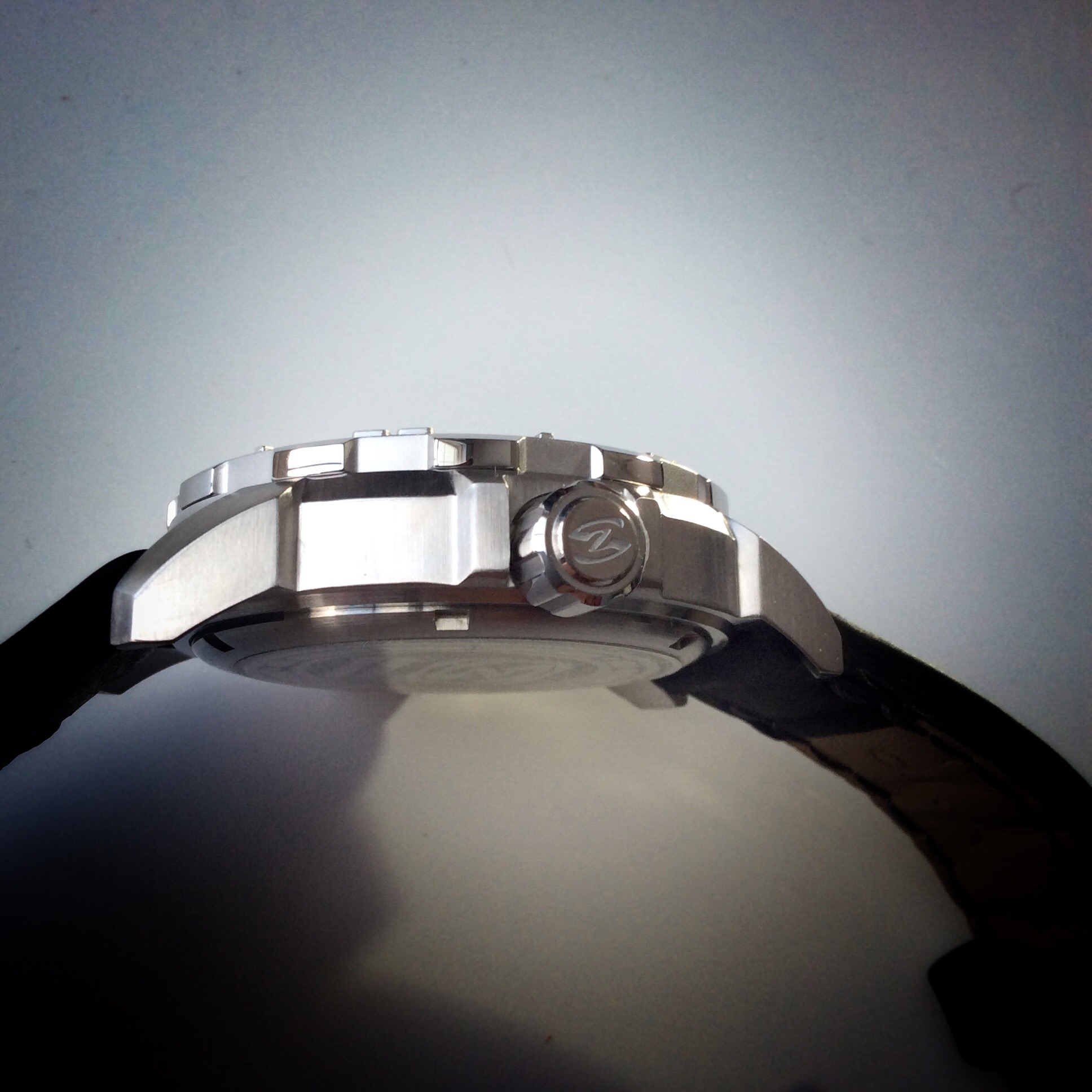 The 46mm case features a combination of brushed steel and polished steel. The design of the case is a nice combo of vintage meeting modern. There are little details that I wouldn’t ordinarily expect at this price point. On the side of the bezel there are sections of high polished steel and with brushed sections in between. What I really like is that on the crown this alternating brushed/polished detailing is continued. Though it’s a small detail, it shows a great deal of thought into the overall design aestetics.