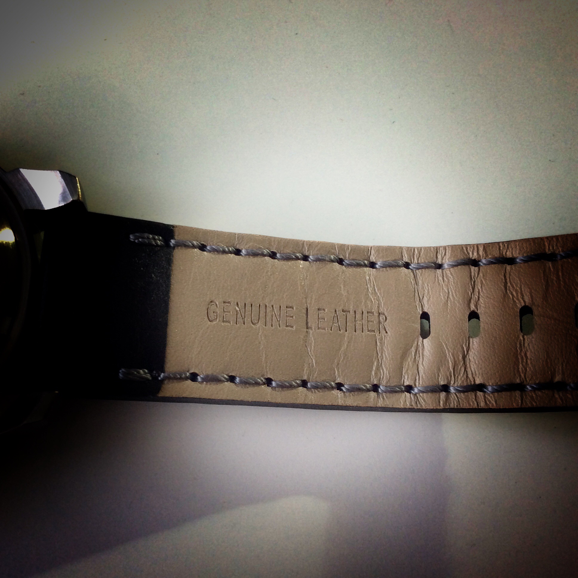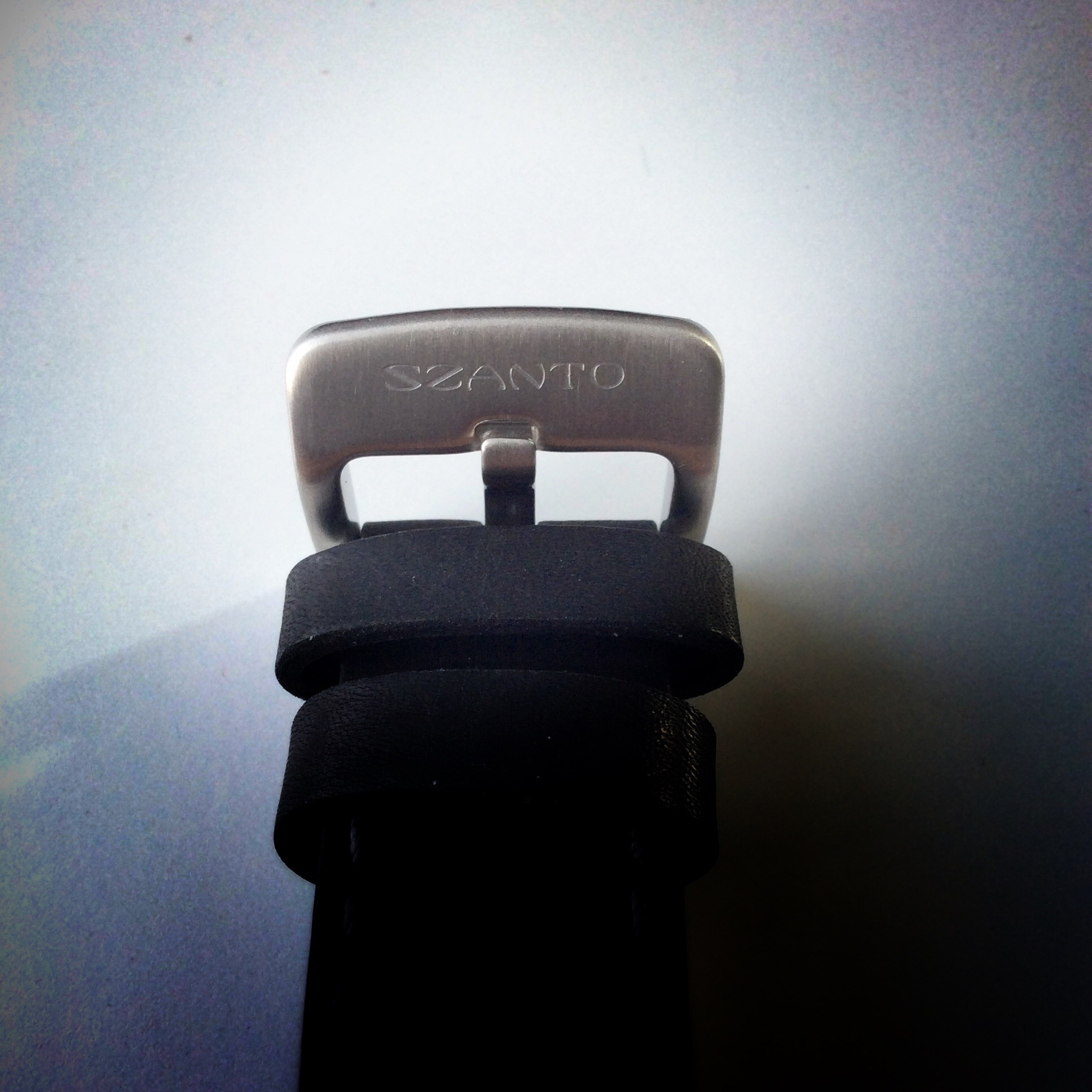 The water resistant leather strap is nice and thick, with the overall feel of a custom made strap. It’s very soft and conforms to the wrist nicley right out of the box. Sometimes a new leather strap is stiff and hard which makes the breaking in period very uncomfortable, but that is not the case with this strap. The stitching is a grey in color and nicely matches the brushed aspects of the case and buckle. The buckle is brushed stainless steel and is signed with Szanto. There are two keepers on the strap, one is fixed and the other is free moving. The under side of the long portion of the strap is stamped with genuine leather and the short portion is stamped with Szanto. I really like this strap for a number of reasons, such as the thickness which is about 4mm, the grey stitching, and how soft it is. Nicely done Szanto.