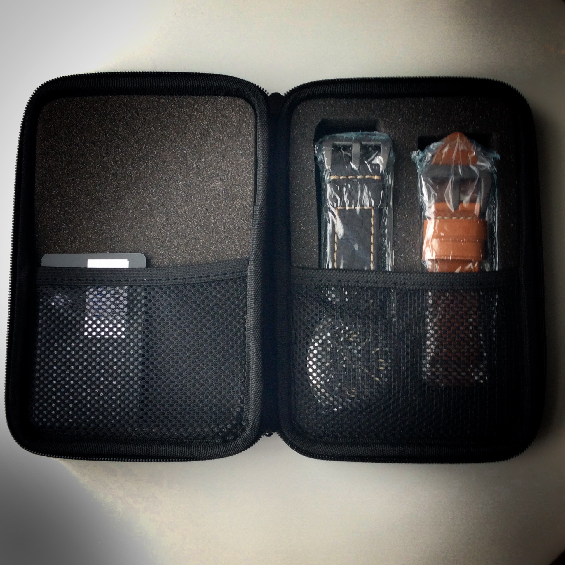 The packaging with the Vanguard is simple, but oh so cool and unique. I absolutely love the white skull logo on the all black case. It adds a badass feel to the impact resistant travel case style packaging. The travel case is closed by two zippers and opens up like a book. Inside there is soft grey foam padding and mesh netting that helps protect the contents and keeps them secure in place. Immediatlely you get a look at the Vanguard, the straps and the warranty card. The contents are also wrapped in plastic wrapping protection. It’s a practical and it can be used as a carry travel case for other items not just your watch. I like packaging like this that is simple, yet uniuque and can actually be used instead of ending up in the closet.