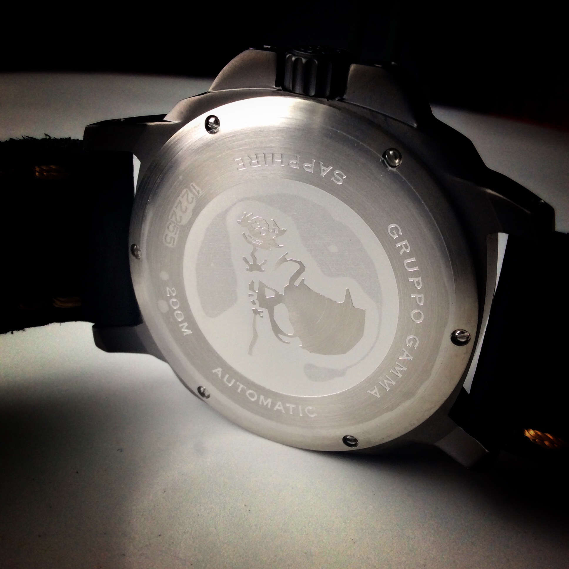 The caseback is super cool on the Vanguard, featuring an engraved skull logo that matches the travel case. The engraving is very nice, simple and well done, a detail about this watch that I love. I used to be a huge fan of exhibition case backs, a detail in my opinion that is over done anymore. It’s actually refreshing to see a solid caseback. The back is held in place by 6 screws. The caseback also features the words, SAPPHIRE, AUTOMATIC, GRUPPO GAMMA, 200m and 12255. The caseback is brushed stainless steel.
