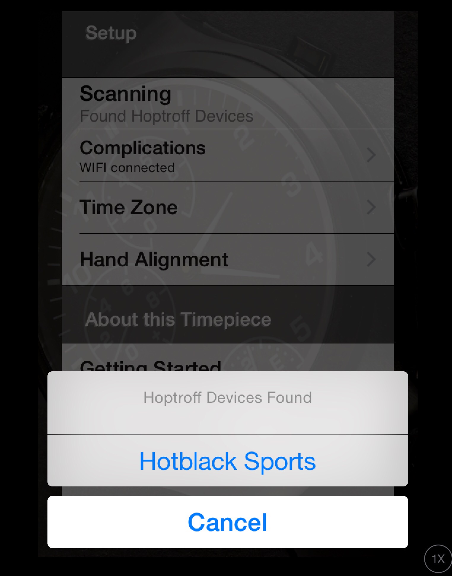 To connect your watch to your device make sure your Bluetooth is turned on your phone or tablet, then select the new connection option in the Hoptroff app. On your Sports watch press the top pusher at the 2 o’clock position. A sub menu will appear: