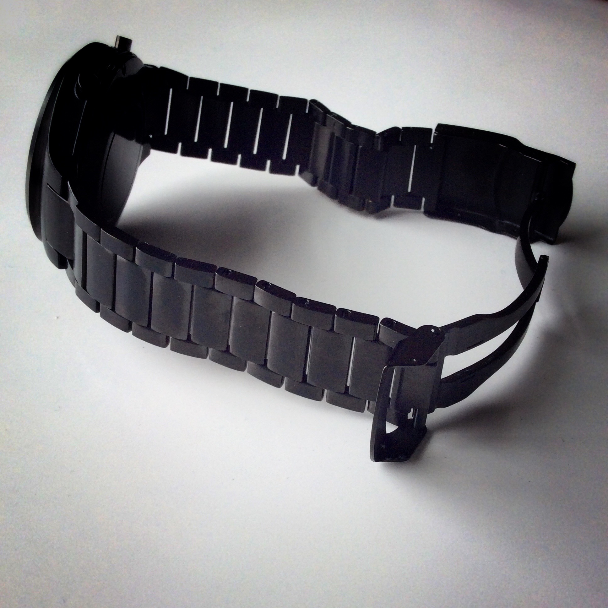 The black PVD coated bracelet matches the case perfectly. It features the traditional folding clasp style with micro adjustment for those inbetween wrist sizes. The clasp is very easy to operate and the clasps locks into place without any play. The clasp is engraved with Hotblack London. The bracelet links are pretty thin which helps with the overall weight and wearing comfort of the watch. The removable links are held in place by screw in style pins, which I am becoming a fan of the more I review watches with them.