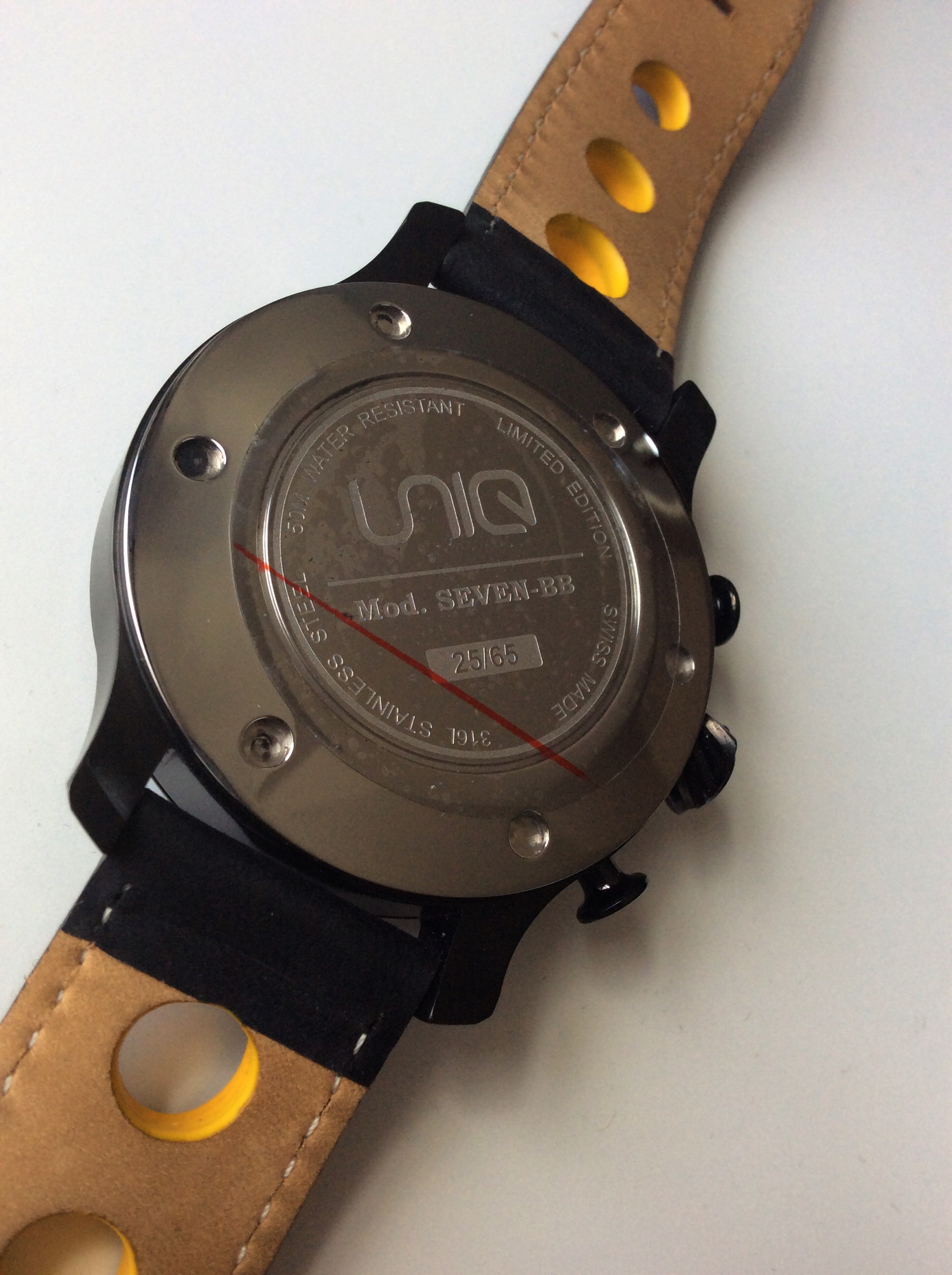 The case back is uncoated stainless steel and is signed in the center with UNIQ Mod. Seven-BB. It also has the following info: stainless steel 316L, Swiss Made, 50M water resistant, and limited edition. It would have been a cool detail to see a engraved Caterham 7 on the caseback, but UNIQ still gets the job done with the caseback here on this watch.