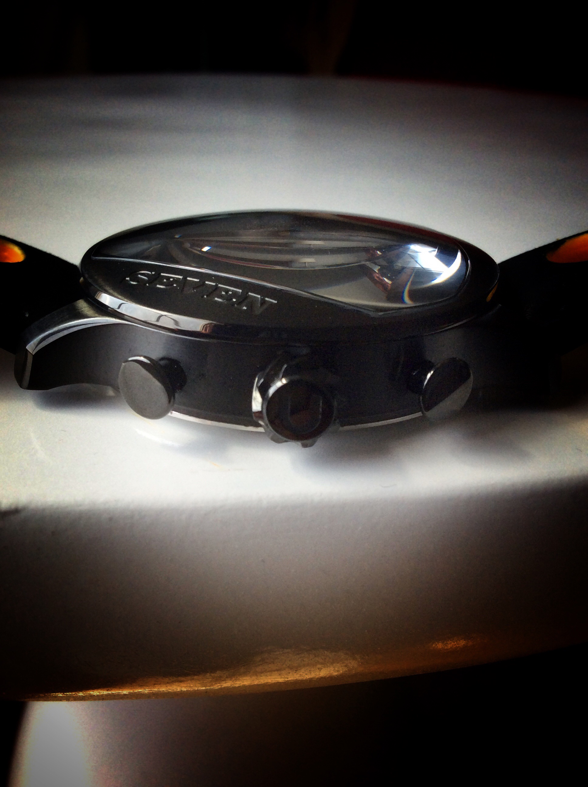 The limited edition version of the Seven watch comes in black stainless steel but is also available in a brushed stainless steel version. The black is very slick, and with the sexy curves of the UNIQ 7 reminanceninint of the curves of a car. The black has a very sharp gloss finish and is applied very even. I really like the engraved ‘SEVEN’ on the dial side of the case, it’s a nice detail. I’ve never reviewed a watch that dial side wasn’t taken up by straight crystal and a bezel. With the added space where there is no crystal was used in a great way by UNIQ. They kept it simple, but a great detail that adds character to this watch. The Caterham 7 influence in design can be instantly recognized when looking at the case of the UNIQ 7. The cut out for the crystal is the same shape as the front grill on the Caterham 7. The 46mm case is a good size for this watch and I don’t think that the watch would have the same feel if the case was smaller. The short curved fenders, I mean lugs, are a good length to allow the watch to sit comfortably on the wrist no matter your wrist circumference.