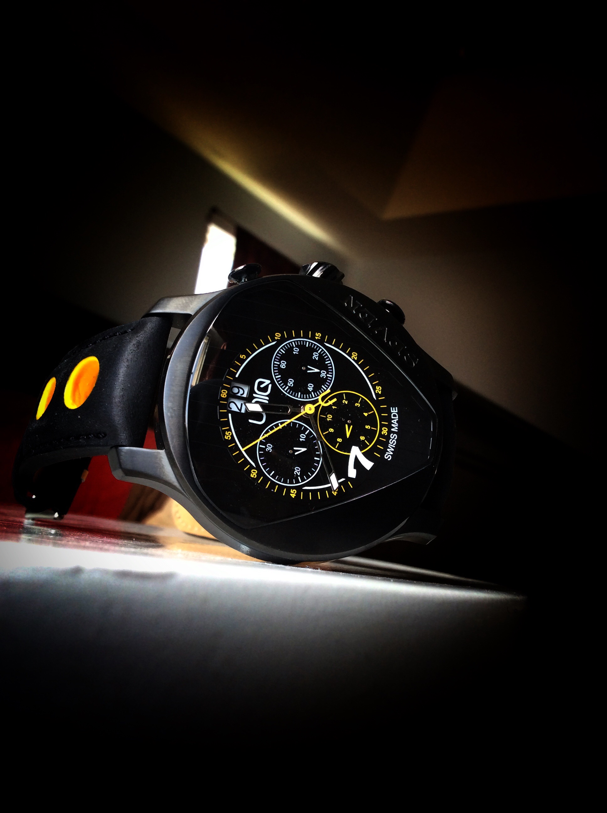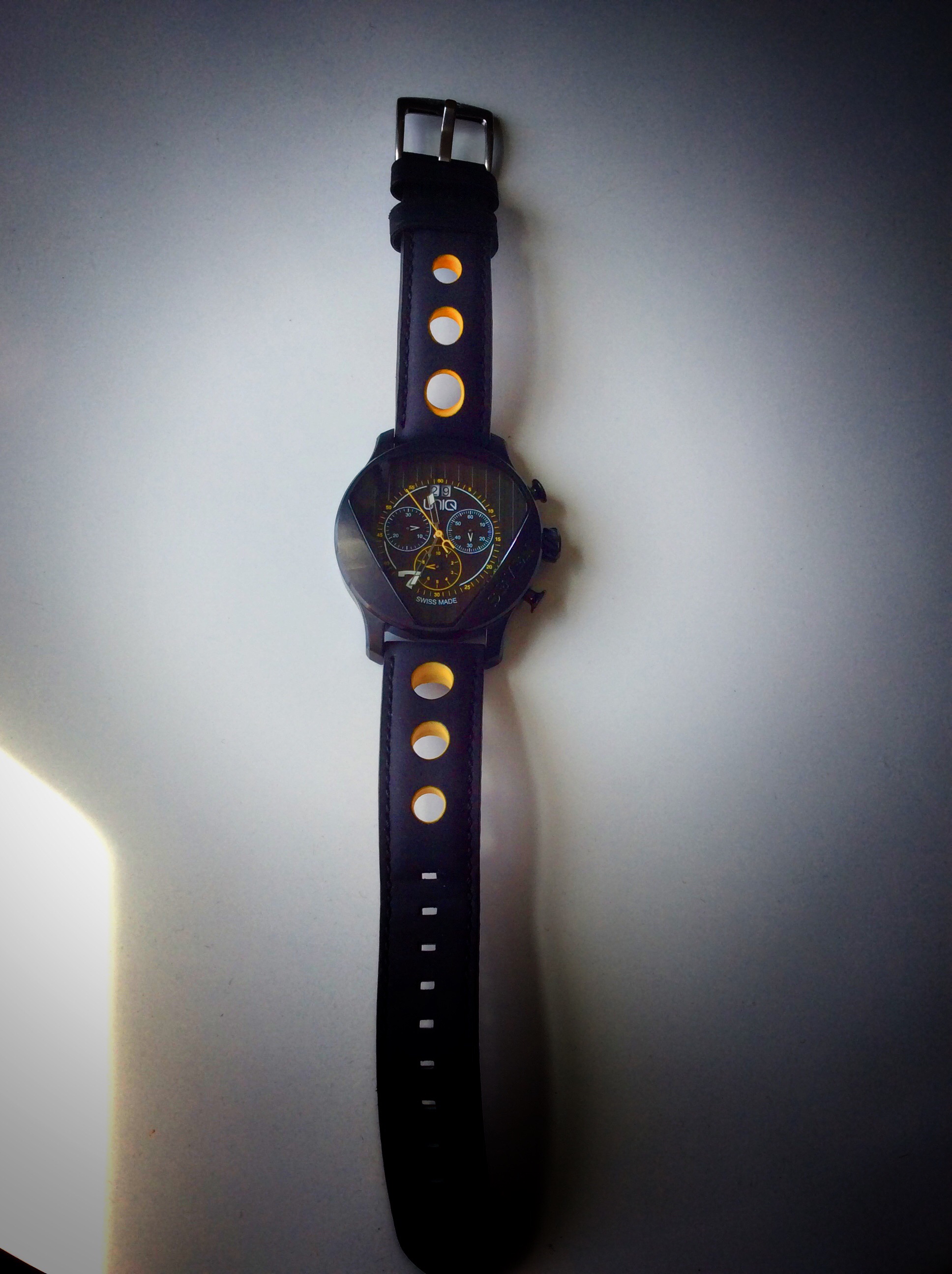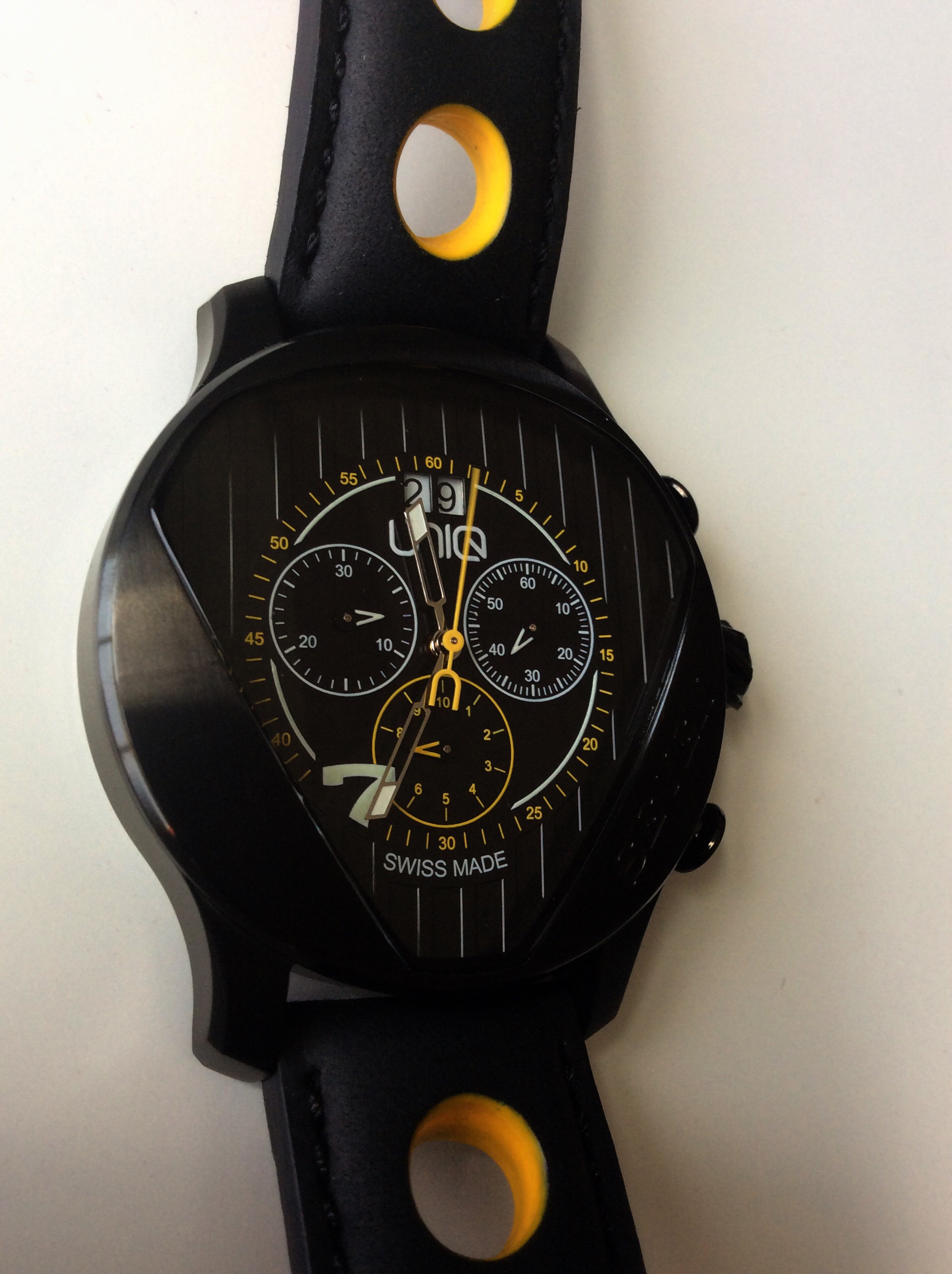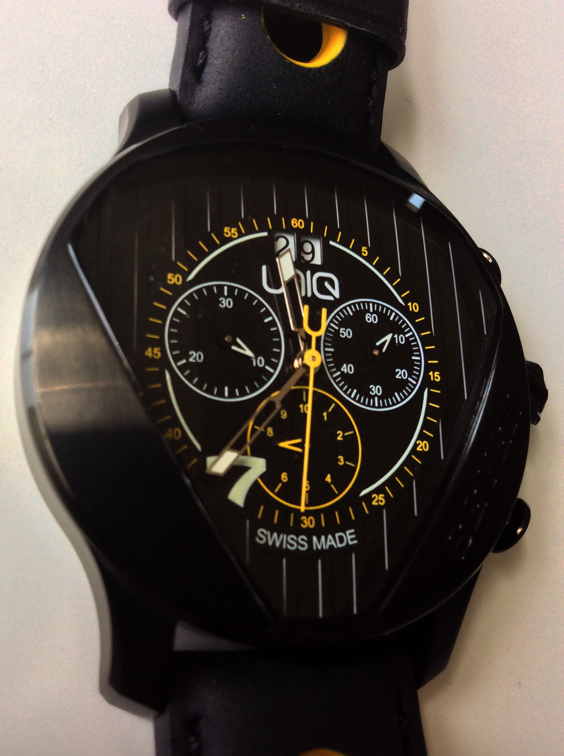 The dial on the UNIQ does not disappoint and it stays true to the design that UNIQ was trying to accomplish here. The dial itself has really nice 3-D detailing with thick vertical lines that match the lines of the grill of the Caterham 7. The mineral crystal is shaped like the outline of the number 7 that is also on the grill of the Caterham 7. The yellow, black and white color choices for the dial all really work well together. The large yellow hand is the center stop second hand and features a ‘U’ at the end. It doesn’t continuesly move unless activated by the pusher, and rounds the dial counting the outer number/minute hash marks and numerals. The hour and minute hands are silver and feature lumed tips. I really like how the hour and minute hands are cut out so that they don’t obstruct the views of the subdials. The only hour number that is featured on the dial is the appropriate number 7. At the 12 o’clock position on the dial is a date display which is a white wheel with black numbers making the display very easy to read. The dial features the text UNIQ and Swiss Made, and consequently the number 7 also serves as the model name as well. The dial features 3 sub dials which are responsible for different features which come in handy for timing events such as racing. The pushers that activate the subdials are easy to press and operate the functions and the operating manual does a great job explaining how to operate and calculate the functions.