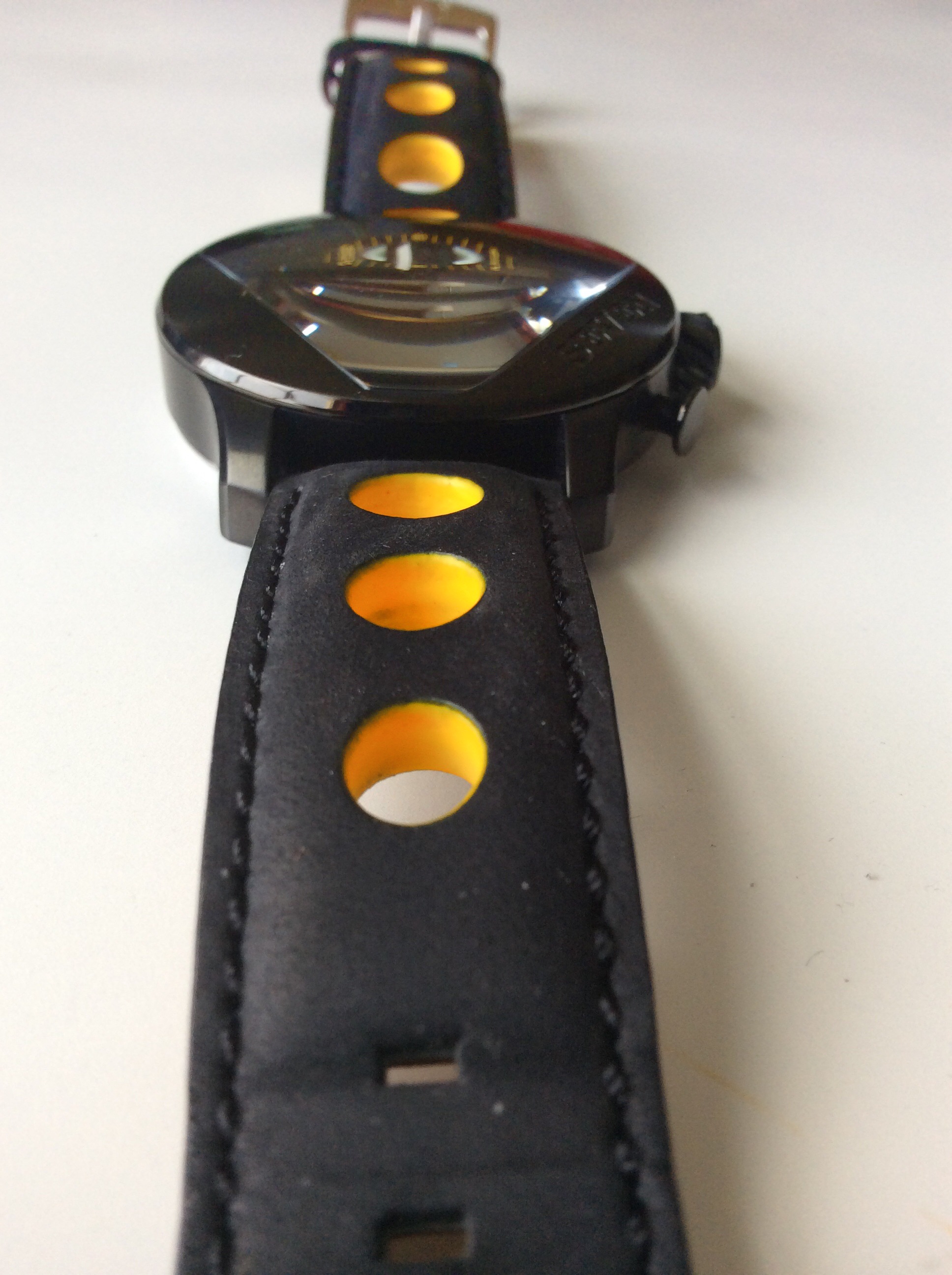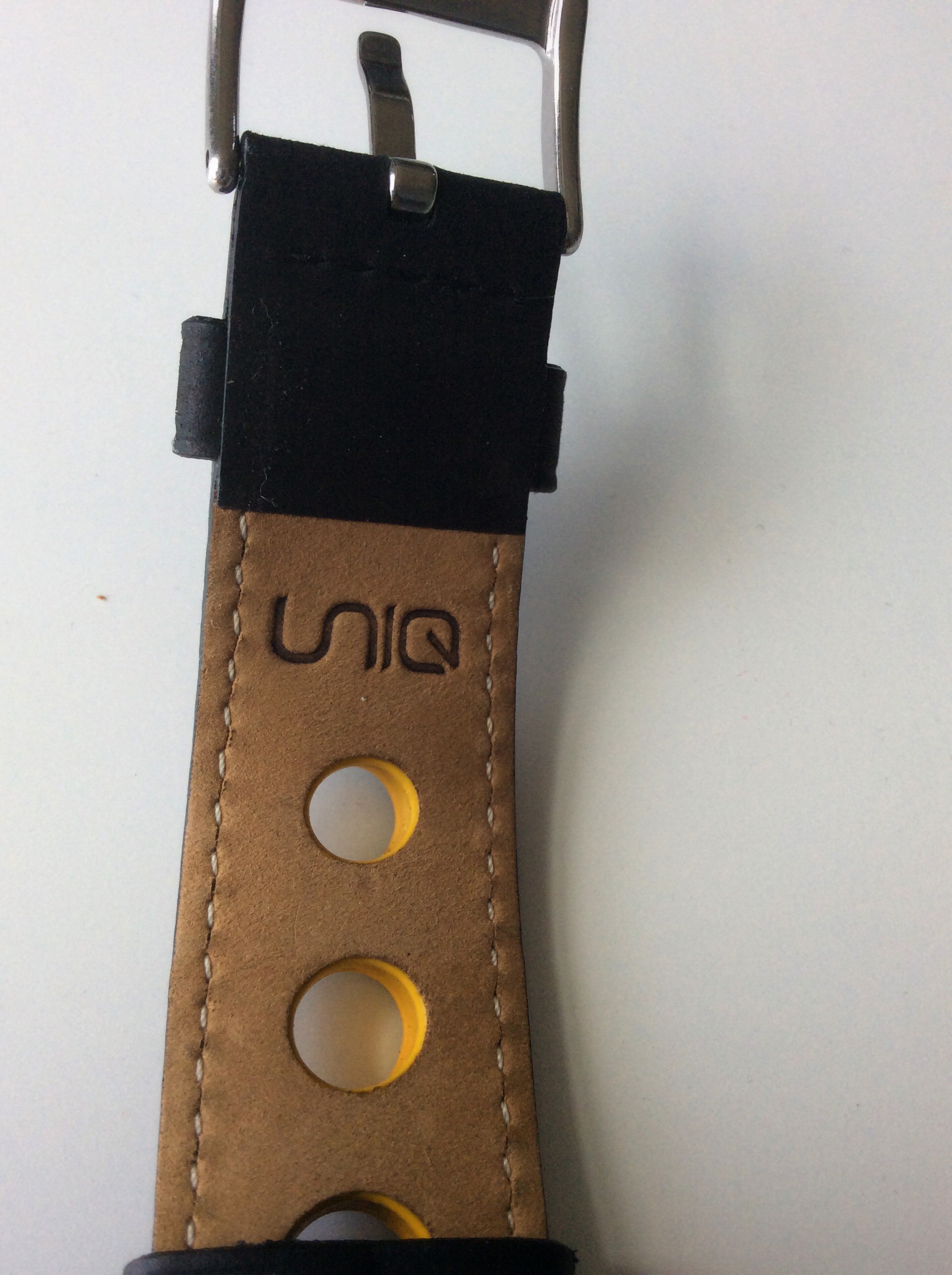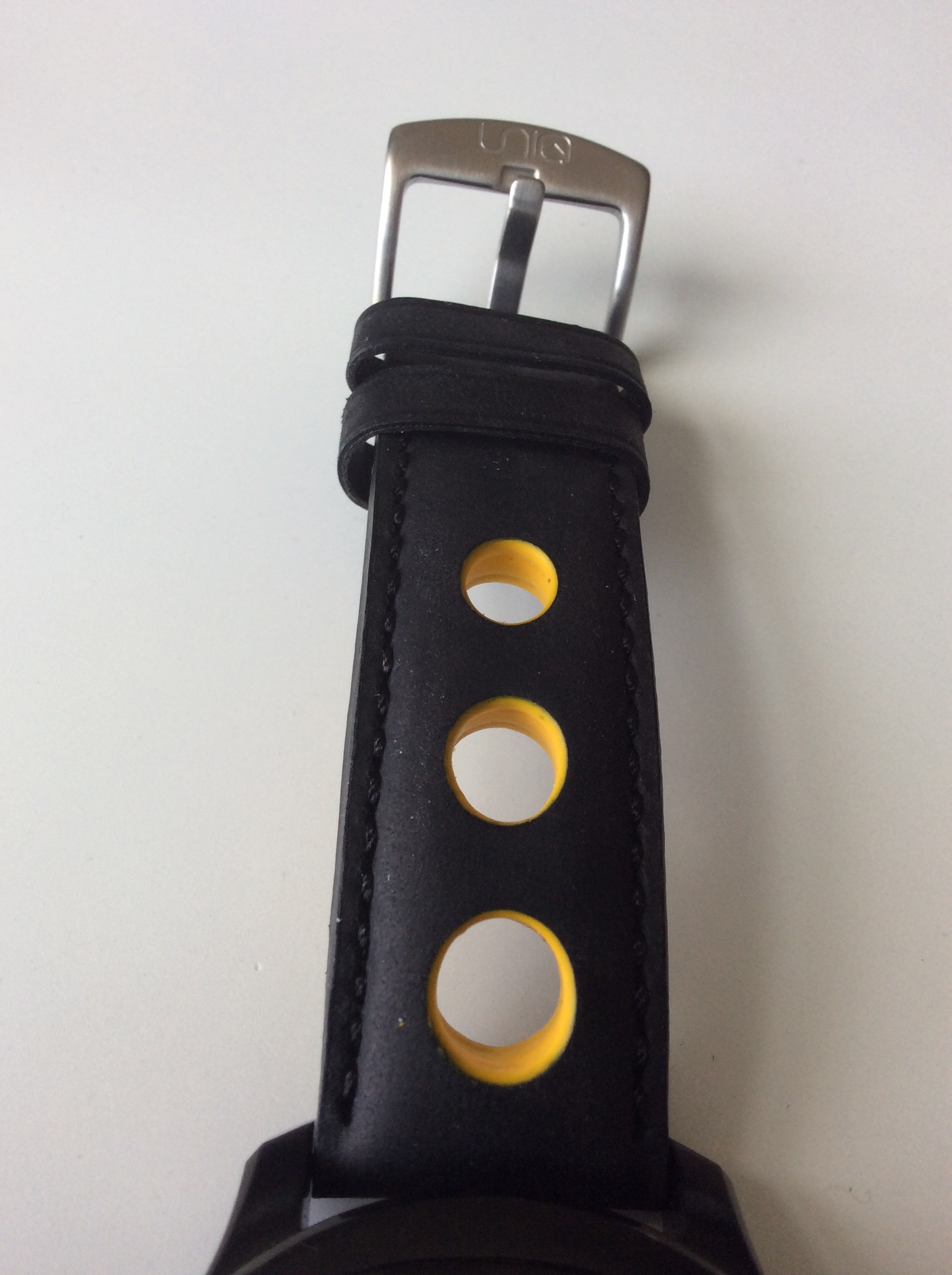 The padded leather strap is a racing style strap featuring cut out holes that are painted yellow to match the yellow accents on the dial. The strap has a traditional buckle style clasp and is signed with UNIQ. The wrist side of the strap is stamped with UNIQ and genuine leather. The strap is very soft and comfortable with some pretty thick padding which makes the watch nice to wear in terms of overall comfort and wearability. The strap really continues nicely with the racing/car theme of the Seven watch model. It’s so soft in fact that it almost feels like suede. UNIQ did a really nice job on the strap.