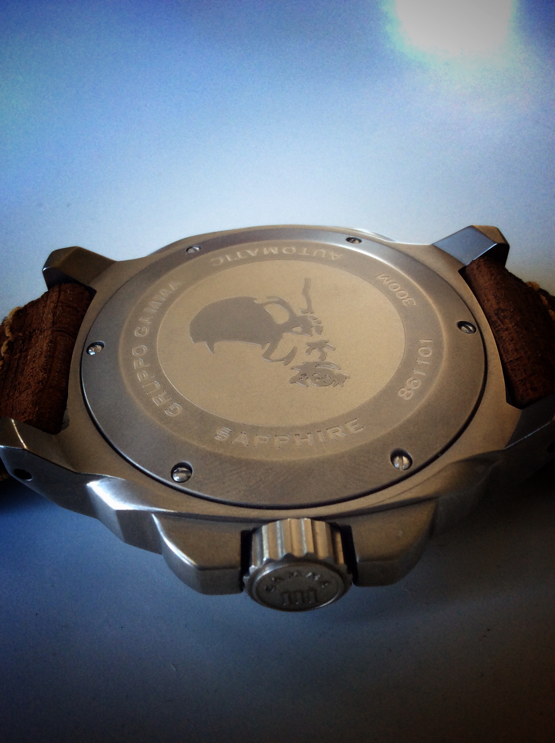 The caseback is super cool on the Vanguard, featuring an engraved skull logo that matches the travel case. The engraving is very nice, simple and well done, a detail about this watch that I love. I used to be a huge fan of exhibition case backs, a detail in my opinion that is over done anymore. It’s actually refreshing to see a solid caseback. The back is held in place by 6 screws. The caseback also features the words, SAPPHIRE, AUTOMATIC, GRUPPO GAMMA, 300m and 861101. The caseback is polished titanium .