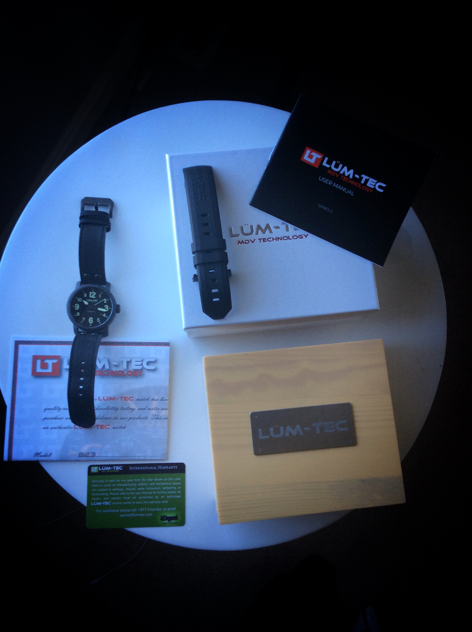 The straight forward packaging is well done and simple with a hidden surprise that took me about a week to discover. The B-23 comes in a white Lum-Tec outter cardboard box which is labeled with the Lum-Tec name and inside the cardboard box is a nice blonde wood box. The wood box is nicely done with thick wood and a extremely smooth finish. The wood box has a small metal Lum-Tec sign on the hinged lid. Inside the boxes is the B-23 watch, the papers, warranty card and the hidden surprise that was an awesome surprise I had no idea about. On either side of the watch is two hidden departments that are designed to hold extra straps, and inside the one is an extra rubber strap. I was really blown away by this small, but amazing detail.