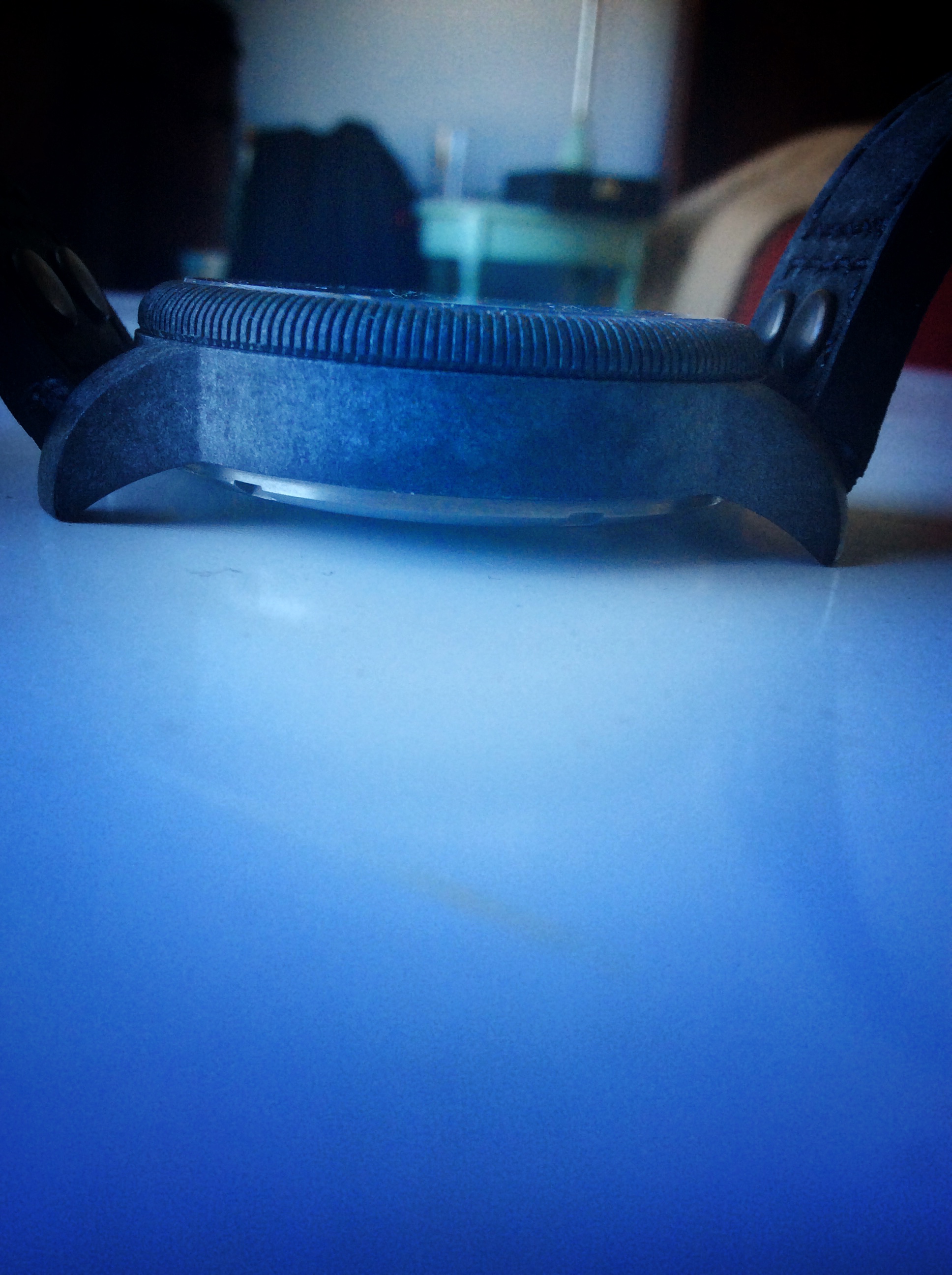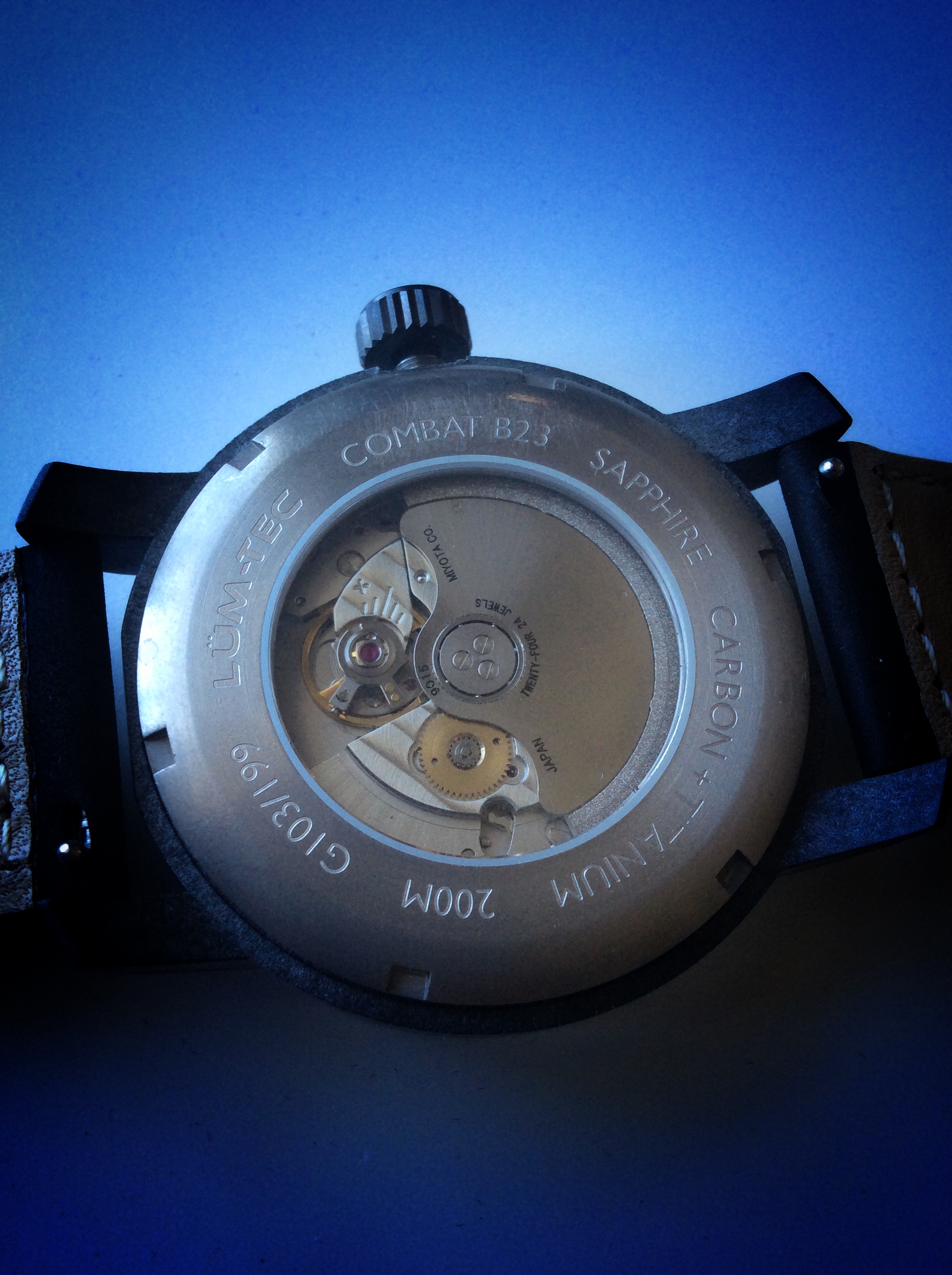 The first thing you will notice when handling the B-23 is how light it is. The outter part of the case is a gun metal carbon composite material and the carbon almost has a stone look to it. It is a very cool case that has to be seen in person to truly appreciate. I really like the color of the case and how smooth the carbon is. It gives the watch a great military feel to it. Underneath the carbon shell is a titanium case which adds to the overall durability of this tool watch. The signed crown features Screw-lock with double diamond sealing system which is very easy to grip and operate with the gear like edges, and makes setting the time and date very easy. The coin edged bezel is fixed which means no rotation. I personally would have liked to see a lumed triangle at the 12 o’clock position on the bezel and had the bezel itself unilaterally rotating. I use timing things quite a bit in my everyday work and personal life so that always comes in handy. The lugs are curved to perfection allowing the watch to hug the wrist very comfortably. The exhibition case back allows you to view the automatic movement inside the case and features the text Lum-Tec, Carbon Titanium, Sapphire, the production number, 200m.
