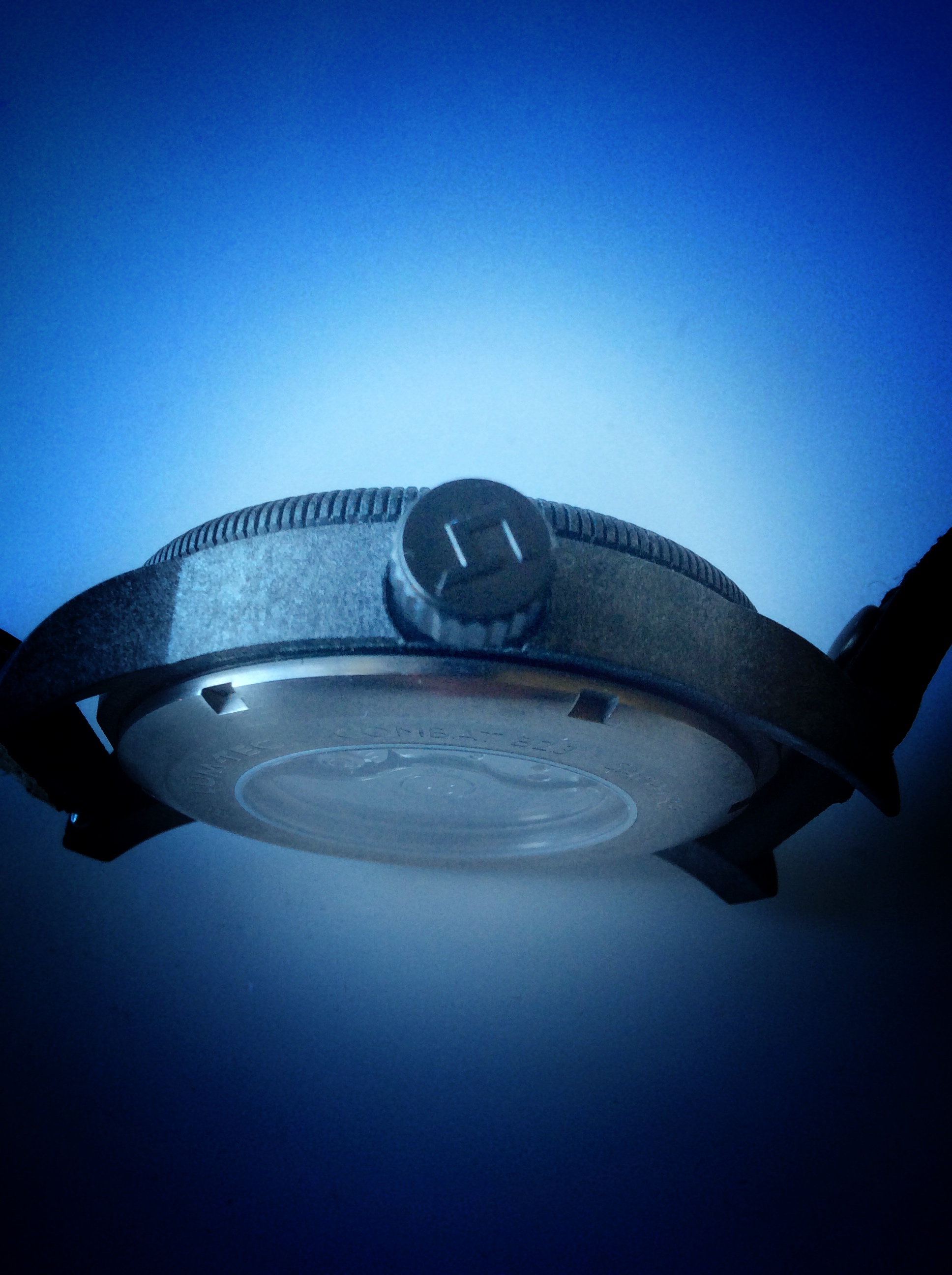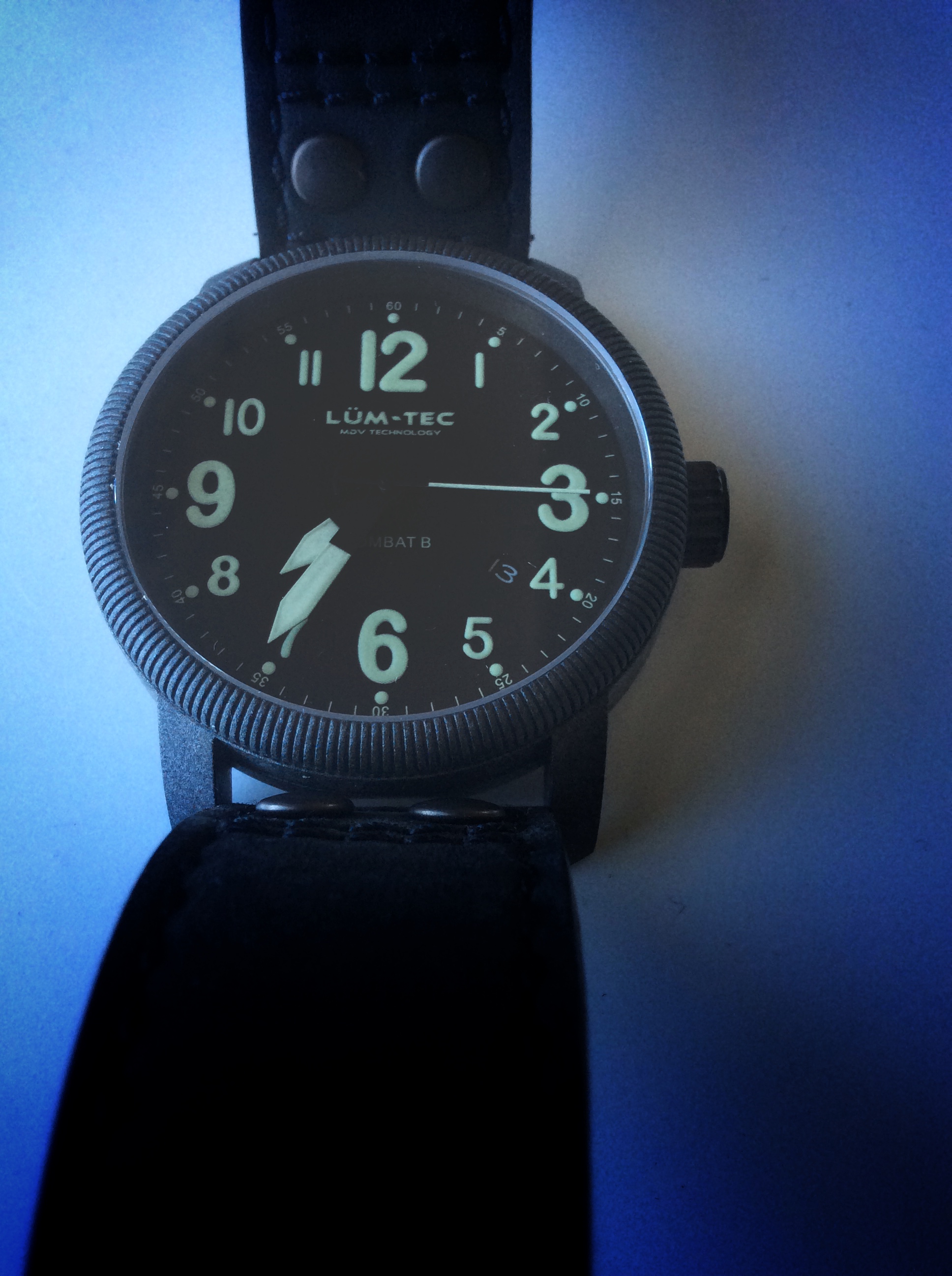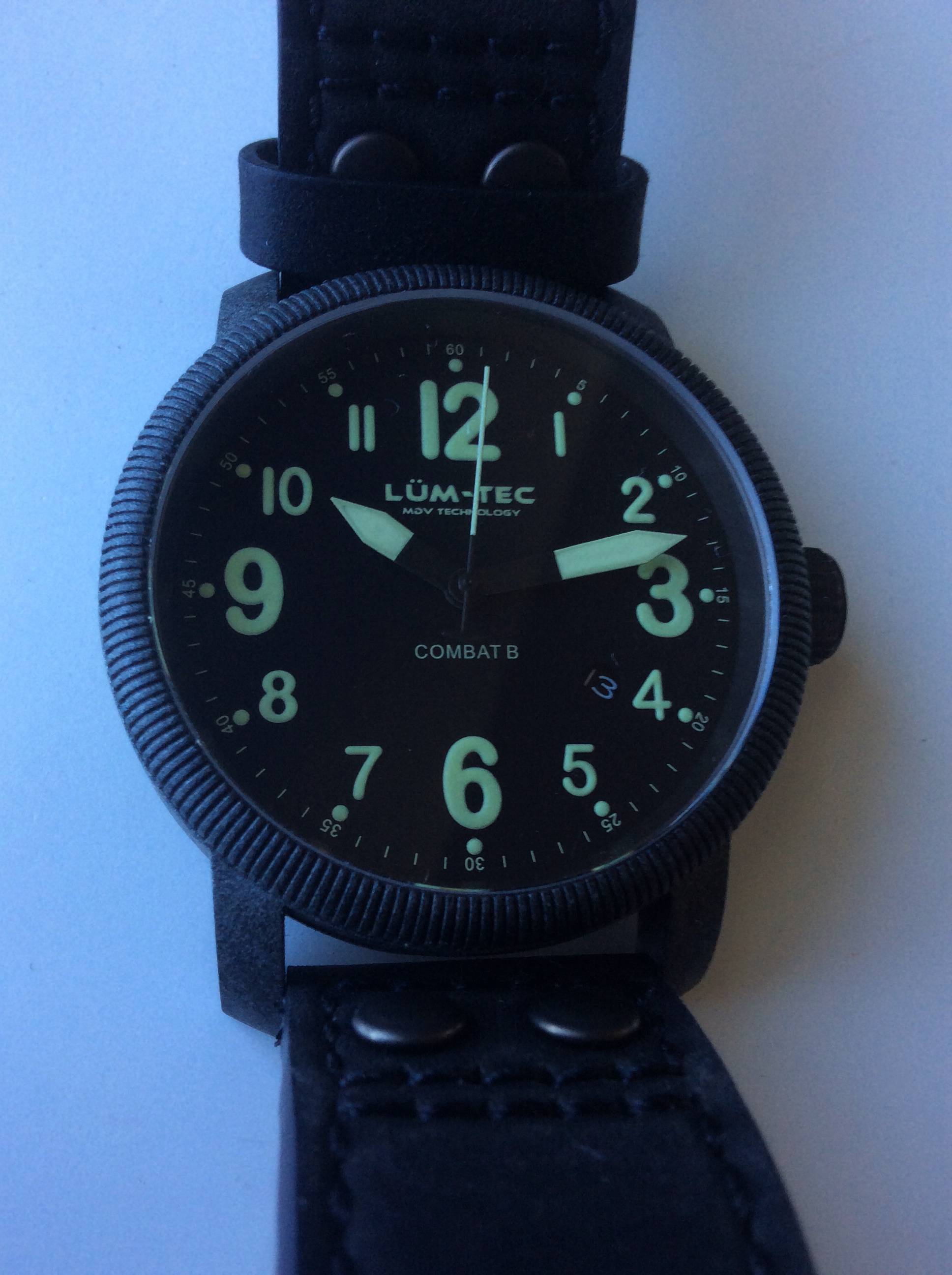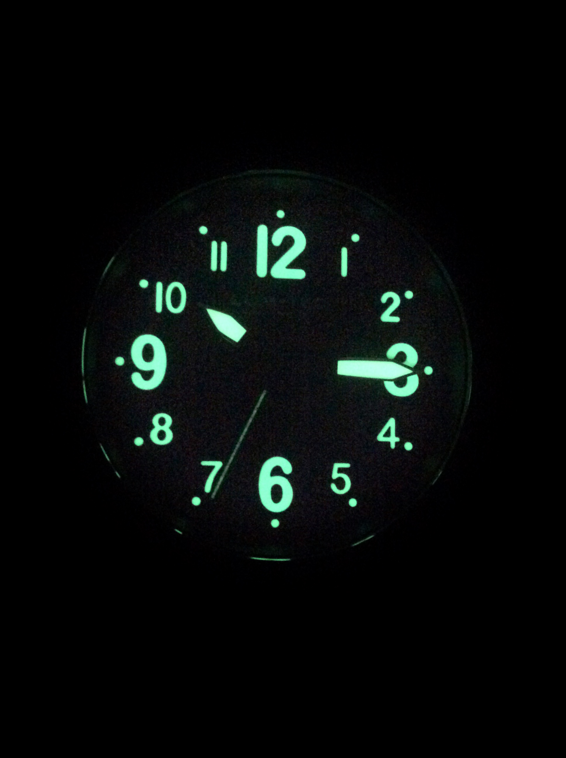 The dial is beautifully executed in every detail, it is what really makes the B-23 stand out when on the wrist. Working from the top down, the first thing you will meet is the AR treated thick sapphire crystal. Not only is it nice and clear, but the thickness helps maintain the 200m water resistance. The dial itself is matte black with green tinted printed numersls that are extremely easy to read in the day and night as you can see by the lume shot.(which is not altered in anyway, it’s that bright) All the numbers are represented here 1-12 with a date window off to the side of the 4 o’clock position. I like this feature that they chose to keep the numeral 4 inplace and offset the date window. It really maintains the balance of the dial. The date is printed in white set on a black date wheel. The 12,3,6, and 9 are larger that the rest of the numerals a little added detail that really works here and gives that pilots instument feel to this watch. Works perfectly with the overall theme of the watch. Speaking of pilot instrument panel, the hands on the B-23 are the traditional pilot style shaped hands and when you set the time the seconds hand is hacking which allows a more precise time setting. The numerals, hands and numeral circle markers are all coated with lume. And with the name Lum-Tec, it surely does not disappoint. It’s bright, lasts a long time and is evenly coated with perfect application. The text on the dial is minimal and it doesn’t over crowd the dial, it includes the text Lum-tec MDV technology below the 12 o’clock marker and combat B just below the hands peg. The seconds hash marks align with the hands, and to note the hash marks are not lume coated. Which is a good thing, because I think it would be overkill with the hands, the numbers and the number circle markers being lumed. I charged the lume for about 10 minutes and it stayed pretty bright for 8 hours though the night.