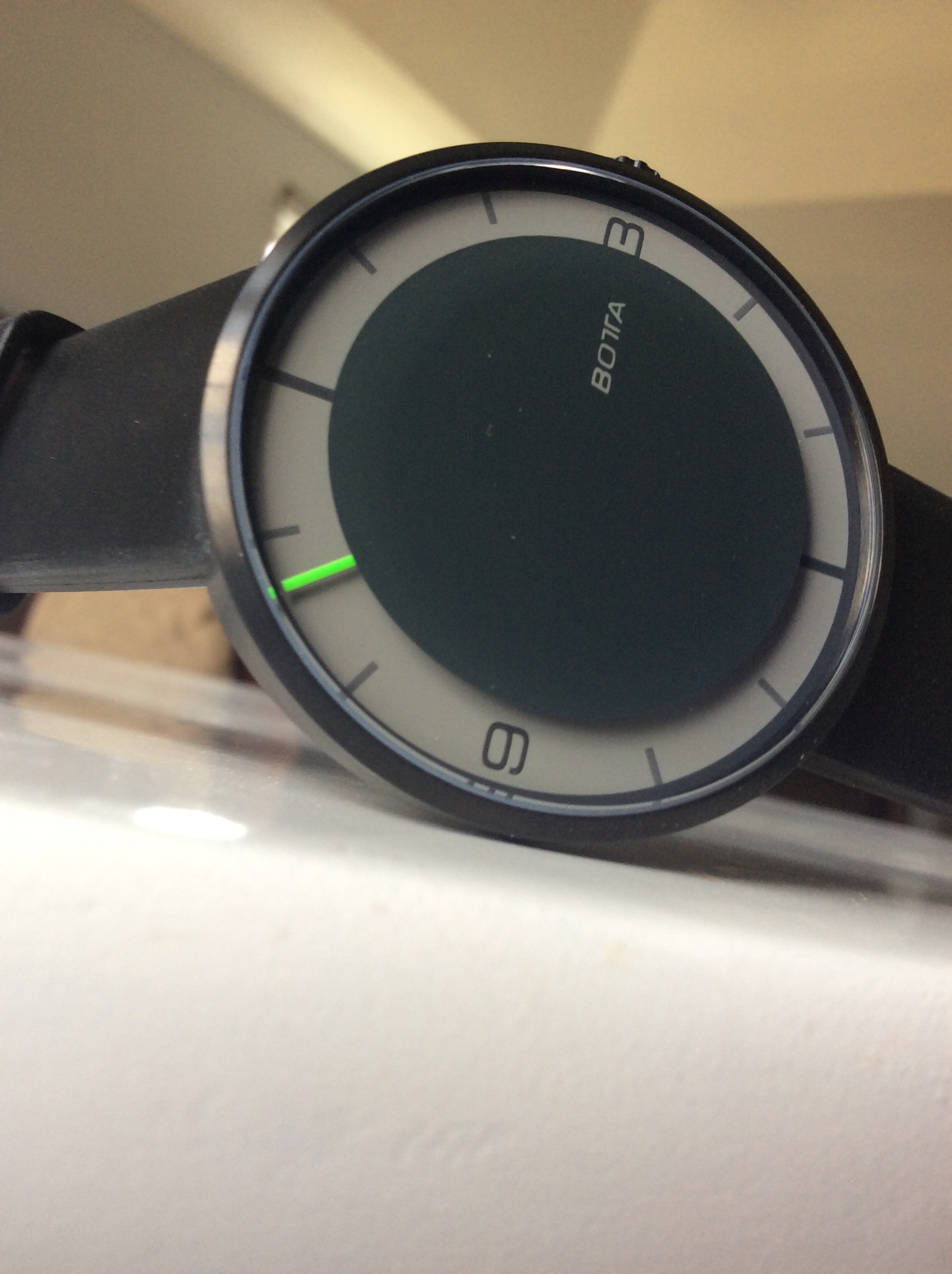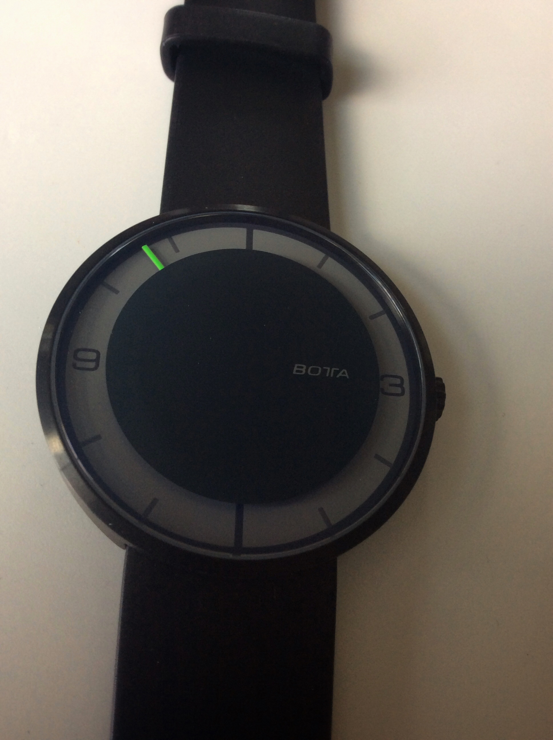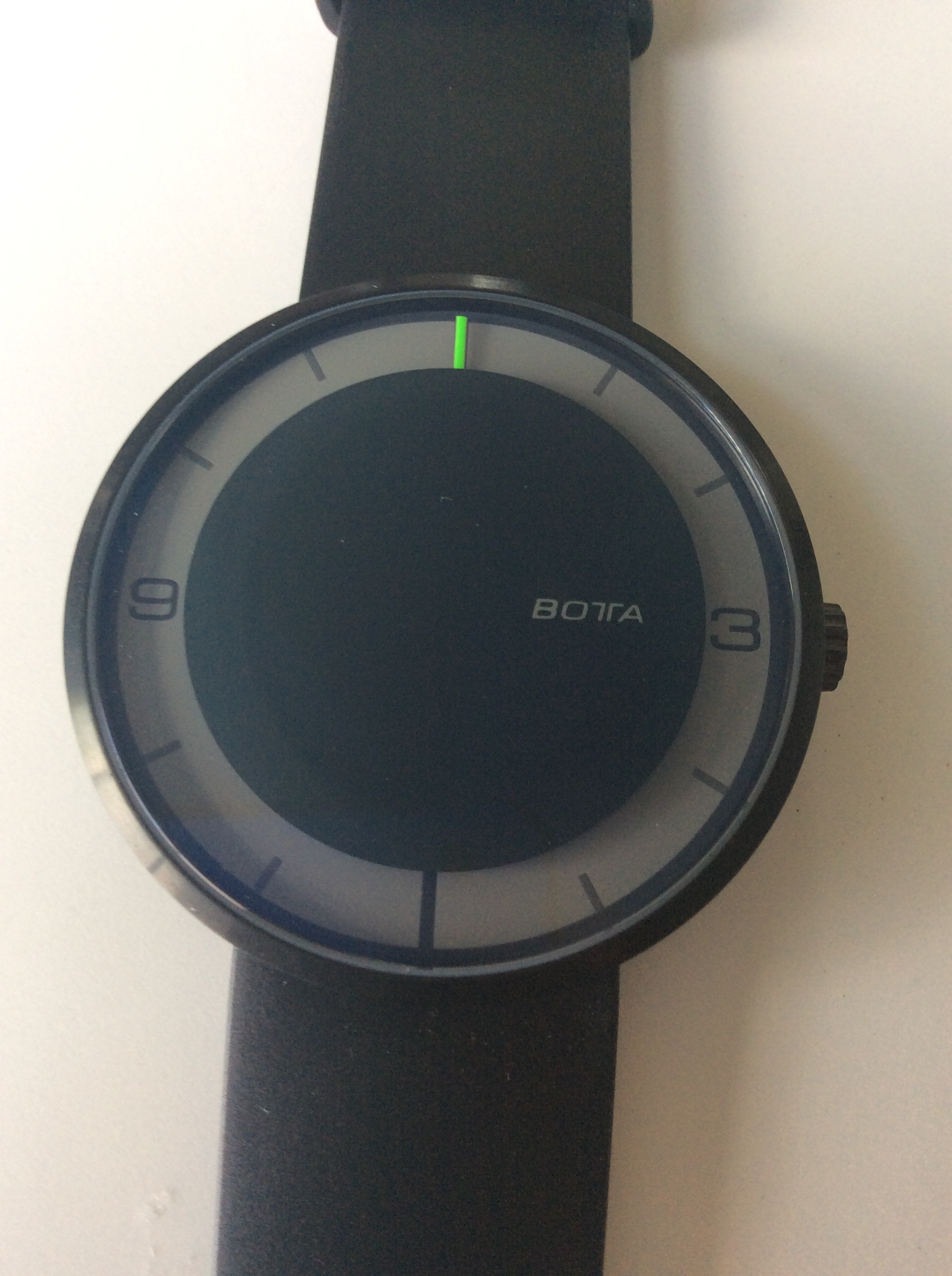 The dial is very minimalistic in design and its the first thing you will notice when you look at it. The single hand is bright green and stands out nicely set against the black and grey dial. The central part of the dial is covered by a opaque black which is applied to the underside of the saphire crystal and signed with the Botta name. The dial only features the numbers 3 and nine and the other numbers are represented by lines. The 12 and 6 o’clock positions are represents by thick, bold lines and the other hour positions are represented by slightly slimmer lines. It does take some time to get used to telling time on the Nova Carbon, and I will share a trick on how I got used to getting pretty accurate with telling the time. For the first week I wore the Nova Carbon I also wore another watch with the traditional 3 hands style set up. This allowed me to see exactly where the Nova Carbon hand sits when it’s inbetween hours and figuring out the minutes in position when the single hand is inbetween the hour markers. You will be surprised on how accurate you can tell time with a single hand once you get used to it. Though if you picked this watch you are not picking it to use as a precise time measuring device. The dial on the Nova Carbon is so simple in design, but yet it has a ton of character and is a watch that will definitely get noticed when it’s on your wrist.