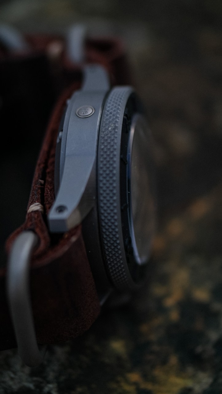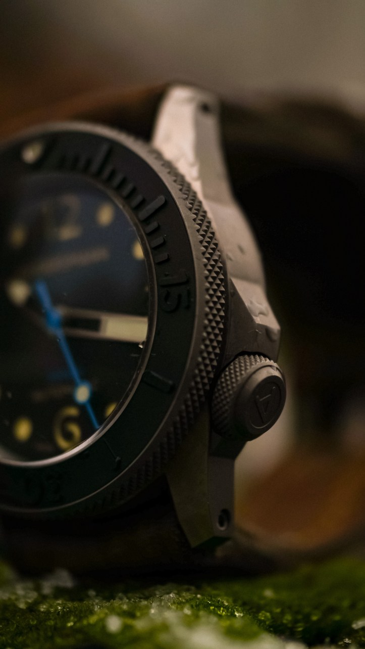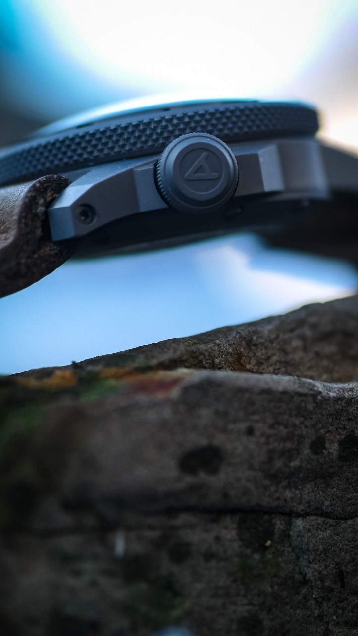 On the non crown side of the case is the helium release valve. Not only is this functionally useful for diving for releasing/regulating the pressure inside of case but it also looks good. It looks good because Andersmann signed the valve with the periodic tables symbol for helium He. I love this detail on the Deep Ocean. The drilled lugs house the screw bars that hold the various included straps in place. The lugs are slightly curved and are on the medium length side. It is hard to show this detail in pictures but the top of the lugs are polished. Polished titanium is a very hard look to achieve because of how hard of a material titanium is. Andersmann’s passion of watches shines through this detail for sure.