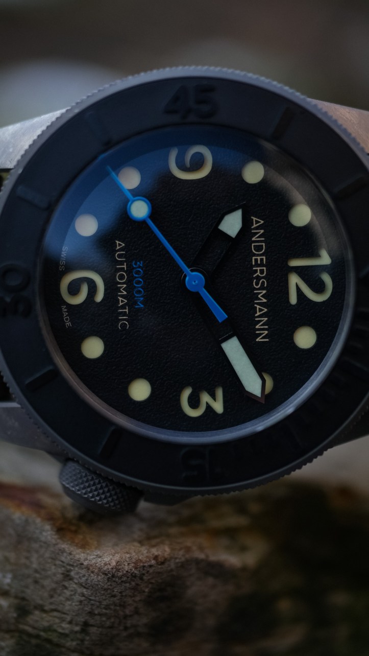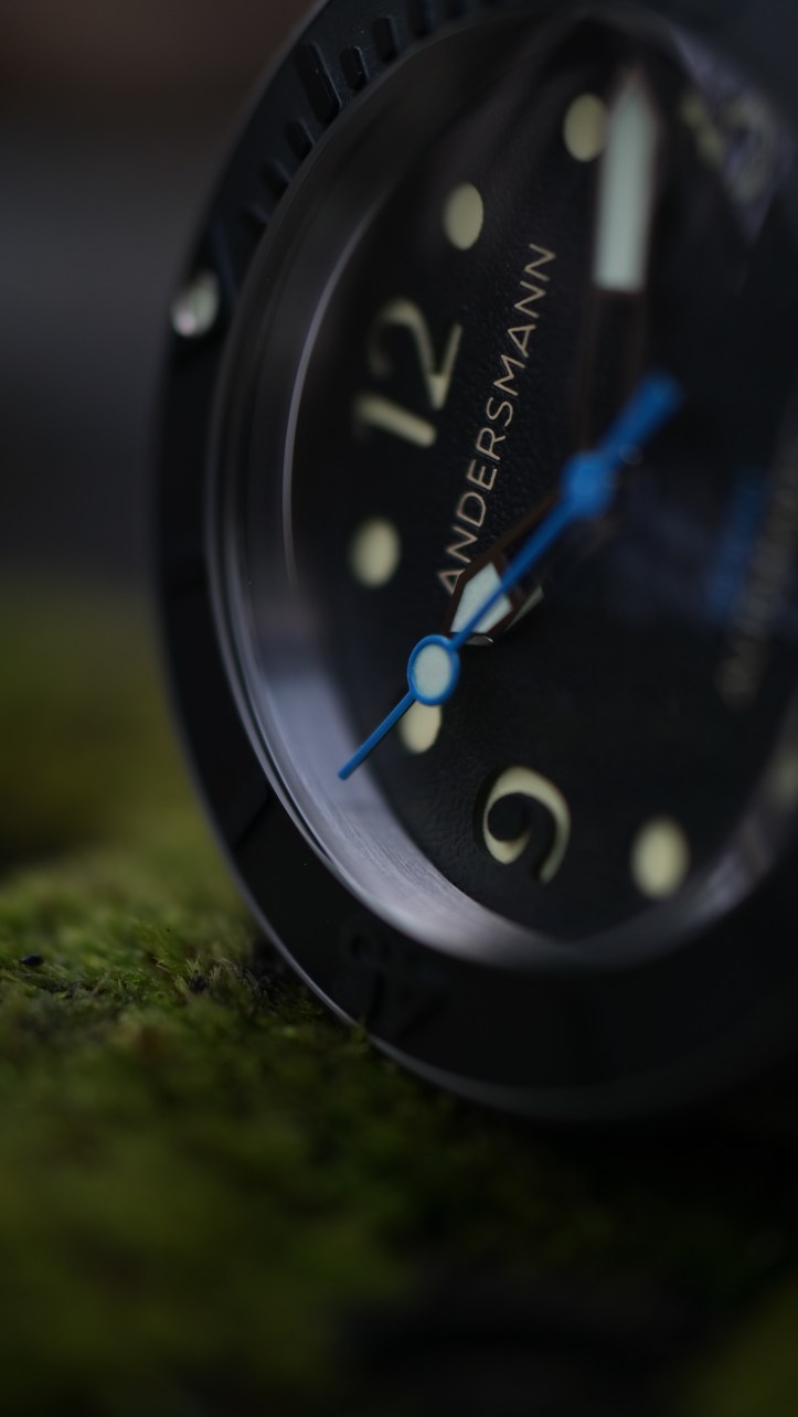The printed text on the dial is simple, Andersmann, 3000M, Swiss Made, Automatic. It is exactly what you need. The text is also sharp, no wonky edges what so ever! The dial is well protected by the double domed sapphire crystal that beautifully rises above the bezel.