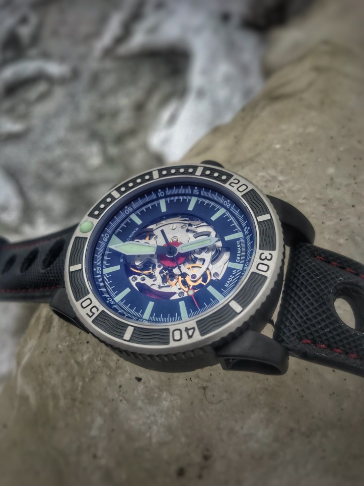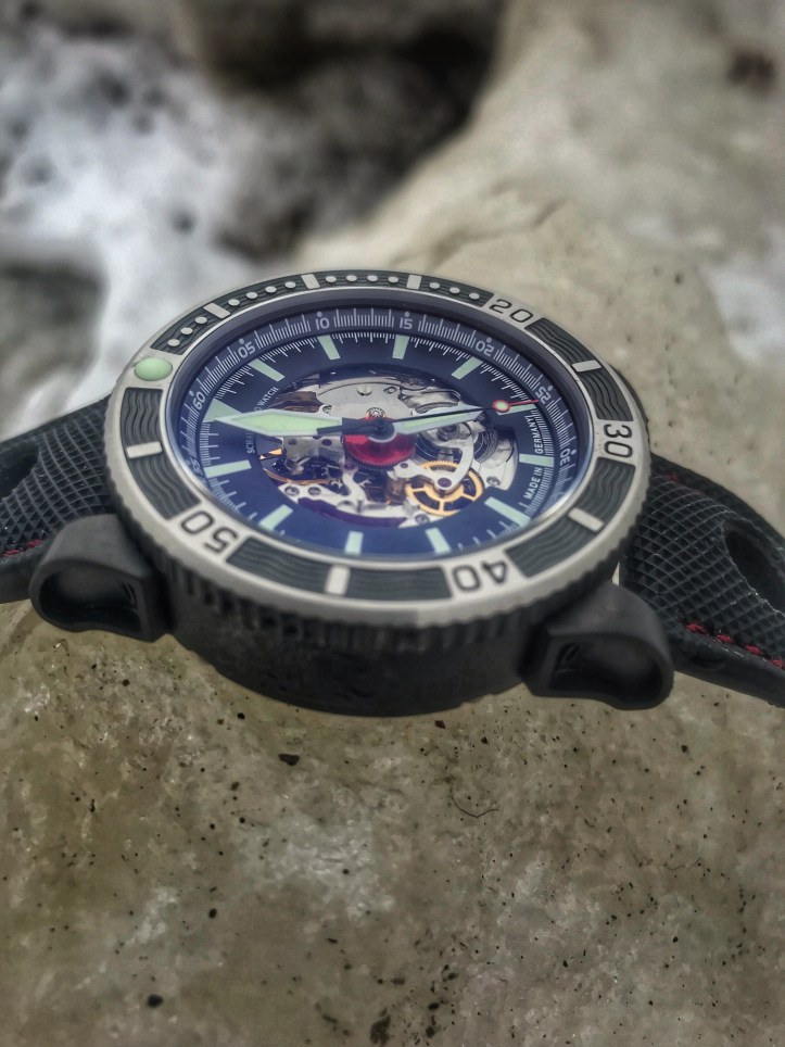 Anything out of the norm intrigues me more so than ever this year which made me want to see this piece in person ASAP. But the other 50% was……If you look at the first pictures within this review maybe you may already know what my 50% hesitation was about. In case you don’t know, I will gladly explain. The skeleton dial was what initially caused the hesitation to swirl like a whirlpool within my head when Schaumburg told me their plans. We all know that I can’t stand a sapphire crystal exhibition case back on a diver, so when the information presented that the experience will now be on the Viperfish’s dial I wasn’t keen on this design choice. But you say, “Stephen you tell us all the time that different is a good thing”, and you are definitely right to want to throw that into my face like a cream pie.