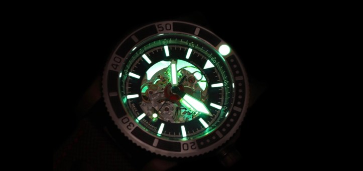 Ok I will end the trip down memory lane here for all of you interested in the quality and execution of this watch. The moderately 45mm x 14.8mm PVD steel case has nice heft to it where it doesn’t feel cheap yet still remains comfortable on the wrist. The matte black sandblasted finish gives the case a magnificent appearance to the Viperfish. In my opinion it creates the perfect set up for allowing the dial to be the center of attention. You may wonder why this model is named the Viperfish. Well, use the picture below as a clue why and also use the Viperfish itself for another clue. This feature was extremely pleasing to the eyes at night, which was so relaxing to watch the beating heart with a soft glow. That beautiful glow is extended onto the hands of the Viperfish with the center of the minute & hour hand that is coated with Superluminova and bordered with brushed steel. Schaumburg insured dial legibility in low lit environments by also coating the generous sized markers and on the lollipop style second hand. After all this is a dive watch so underwater legibility is important to those you will actually dive with this watch.