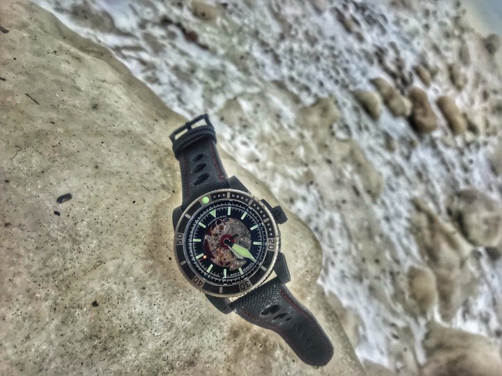 Schaumburg had a few magic tricks up their sleeves, not gaudy like a certain mind freak but more liKe tongue in cheek Penn and Teller style. What Schaumburg did with their dial is definitely different, but they also insured that they gave us the wearer something that is worth looking at. They didn’t just give an off the shelf movement with nothing “pretty” to look at. I never understood the point when companies boast about having an exhibition case back but just use an off the shelf movement with nothing done to it. What’s the point right? The whole point in my opinion of the crystal peering “window” is to give you something interesting to look at. This is what Schaumburg’s achievement was here, which in my opinion was done well. Schaumburg added a real nice pallet of color on the movement which begins nicely smack in the center. The red immediately pulls the eye into the dial and into the movement. I admit that watching the movement in action did remind me of the magic of my grandfather’s pocket watch. That pocket watch was the start of my fascination with watches. So having that reminder here on the Viperfish held an extra bit of personal magic for me.