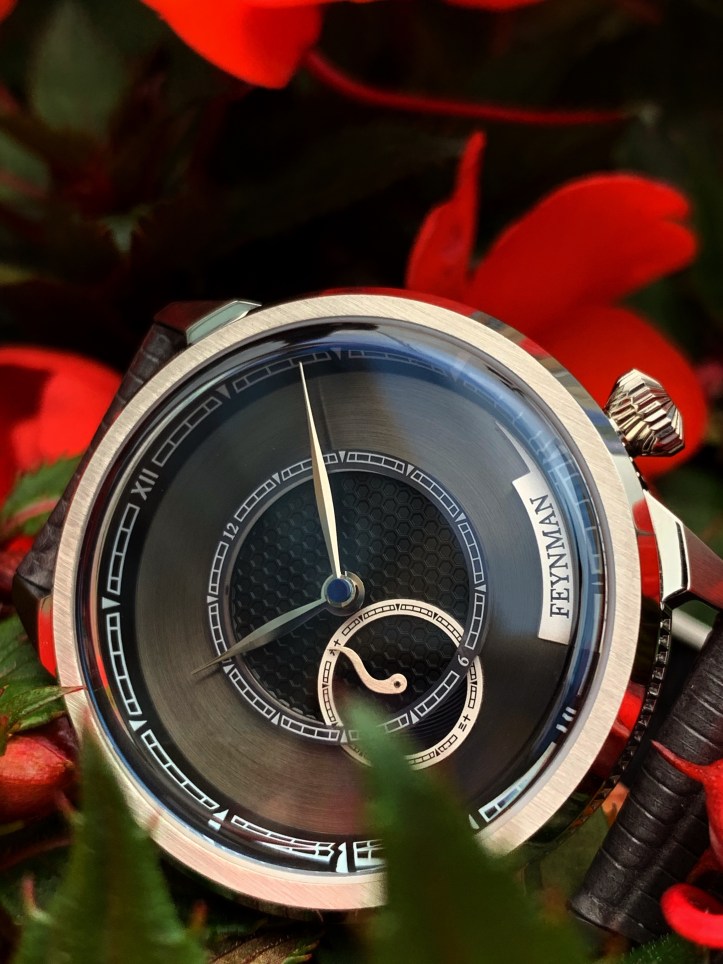 Feynman allowed the textured details to create the overall unique beauty of this dial instead of packing it full of unnecessary printed details. There are very simple printed numerals on the very outer minute/hour track and on the inner track as well. Simple Roman numerals representing 12 & 6 on the outer track and Arabic 12 & 6 on the inner track. The exclusion of a date window helps keep the chi to flow throughout this dial brilliantly. One detail that is responsible for the initial grabbing of my attention is actually the small plaque at the 4/5 o’clock positions on the dial that has Feynman simply printed in black. I also appreciate the contrast in printing the second track in black on the silver backdrop and the white printed track on the dark gray backdrop on the dial and the chapter ring.