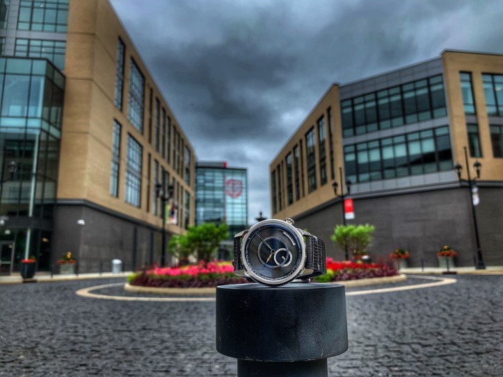 The dial of the OC is made up of textures and layers, giving the dial depth despite it’s overall simplicity. The black honeycomb style of the lowest section of the dial creates a nice backdrop for the sharp, silver steel hands. The hour and minute hands are sized perfectly for this dial allowing for ease of legibility and for overall aesthetics. The seconds are counted by their own sub-dial which is located at 7/8 o’clock position. The position of the sub-dial is a welcome break from the typical and symmetrical choice of placing it directly center at the 6 o’clock position. The curvature of the second hand is quite a small yet beautiful detail. The gray and black color scheme of the dial is broken up with the welcome addition of the blue pinion cap.