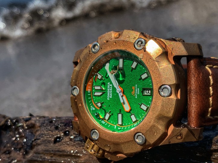Stella comes on a brown leather strap with a standard pin style buckle. The strap has a good amount of padding to it which adds to the comfort of Stella when on the wrist. The patina/off white stitching on the strap is a nice little accent of detail that pulls together the strap and watch with continuity. I like that companies such as Fonderia Navale continue to bring out bronze/brass watches because variety is much appreciated. What is also appropriated is Fonderia Navale’s commitment to improving quality with each of their releases. Stella is by far their best piece to date in terms of overall quality and overall design. Stella keeps beating thanks to her heart which is a Citizen Miyota Parashock movement. This piece would be darn near perfect in my opinion if the date window was eliminated. My favorite details are the ones found on the case itself. The thick, drilled lugs, the bold fixed bezel, the oversized crown, the caseback, all work perfectly together. For just under $500 you definitely get your money’s worth here.
