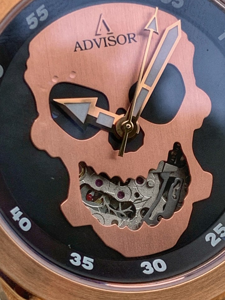 Advisor could have taken this dial one step further by adding lume to either the eyes of the skull or to behind the movement in “the mouth” of the skull. The details of the hands were done extremely well in terms of shape and overall execution. Both of the hands are segmented, almost in a cathedral style which adds to the completed look on the Ascent’s dial. The triangular tip of the hour hand, the sword shape of the minute hand and the arrow shaped second hand, all these details all the three to nicely accentuate each other. This dial is kept pretty clean as the text was kept to a minimum with just the Advisor logo and name located just under the 12 o’clock position.
