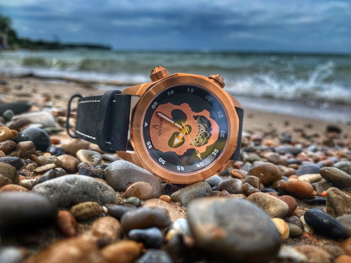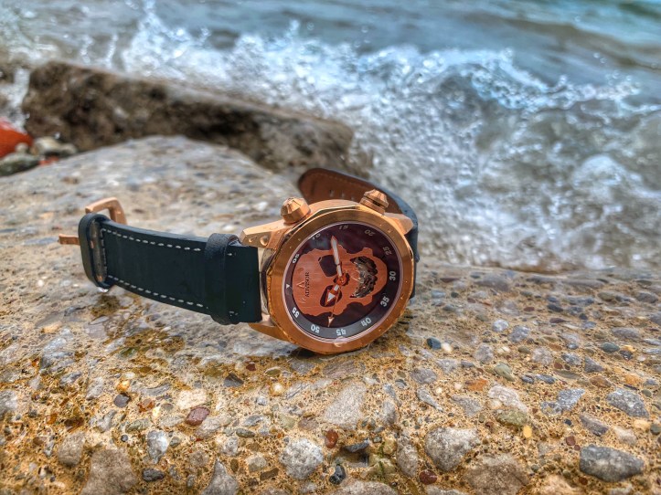 Without a doubt for me the open-heart layered skull dial is the attention grabbing center of attention on the Ascent. The brushed skull is set against a black background adding to the dials 3-dimensional appearance. The open heart is perfectly placed within the mouth of the skull. I am typically not a fan of skeleton dials or open heart but it works brilliantly here on the Ascent. Advisor kept everything else on this dial simple to allow the skull to be the obvious focal point. The gold hands are great accent details to the Ascent’s dial and case. The hands are not only perfectly sized to the dial but they are also coated with BGW9 lume. Protecting this dial and adding to the legibility is the scratch resistant sapphire crystal that is treated with an anti-reflective coating.