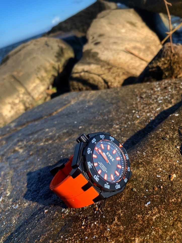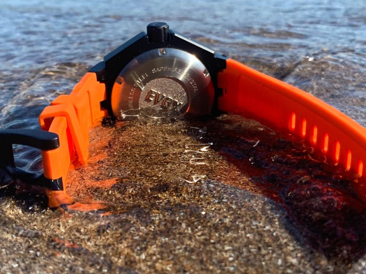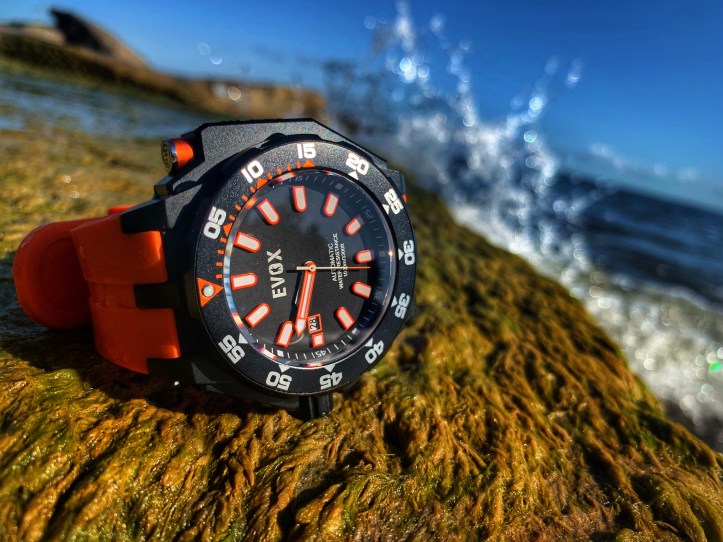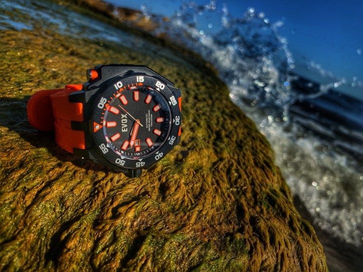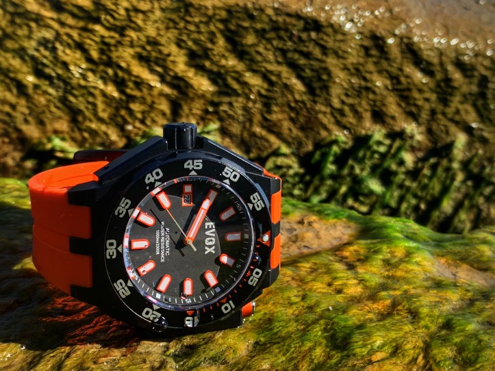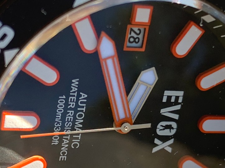 The DV1-05 is a nice debut piece for this new brand. Right now and for the next two weeks this watch can be purchased from http://www.evoxtime.com for $347 USD. There are a few areas for improvement in my opinion. The hour and minute hands are a nice size, shape and design while the second hand is undersized, has no lume and is mismatched to the hour and minute hands. In my opinion all watches that are specifically geared towards diving should have a lume coated second hand. My other area that would improve this watch in my opinion is to have eliminated the 1000m that is on the side of the case located where the helium escape valve is.