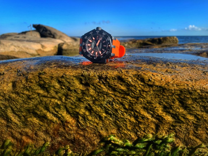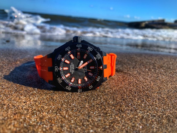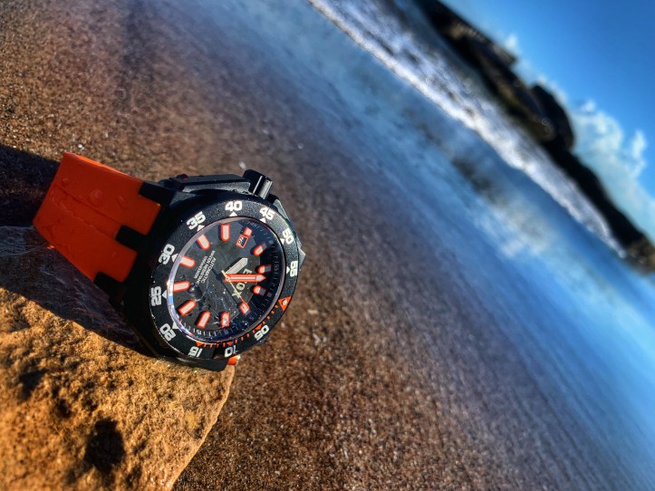 I do think that the watch features some details that make it a watch worth looking at, especially for those on that under $500 budget. The watch features a sapphire crystal, a large unique case, oversized screw down crown, and the 1000m depth rating. The bezel functions with precision, it’s easy to grip and lines up perfectly with the dial. At the 12 o’clock position on the bezel inlay is a lumed pip which is definitely helps when using the watch for diving or just timing in general.