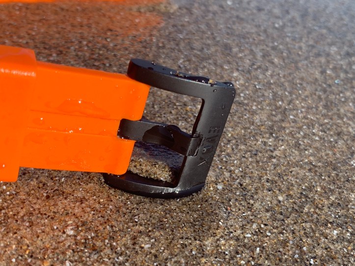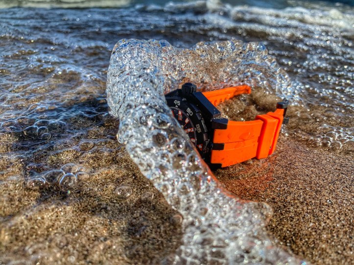 The DV1-05 comes on an extremely soft orange silicone strap that is fitted with a case matching (signed) black buckle.