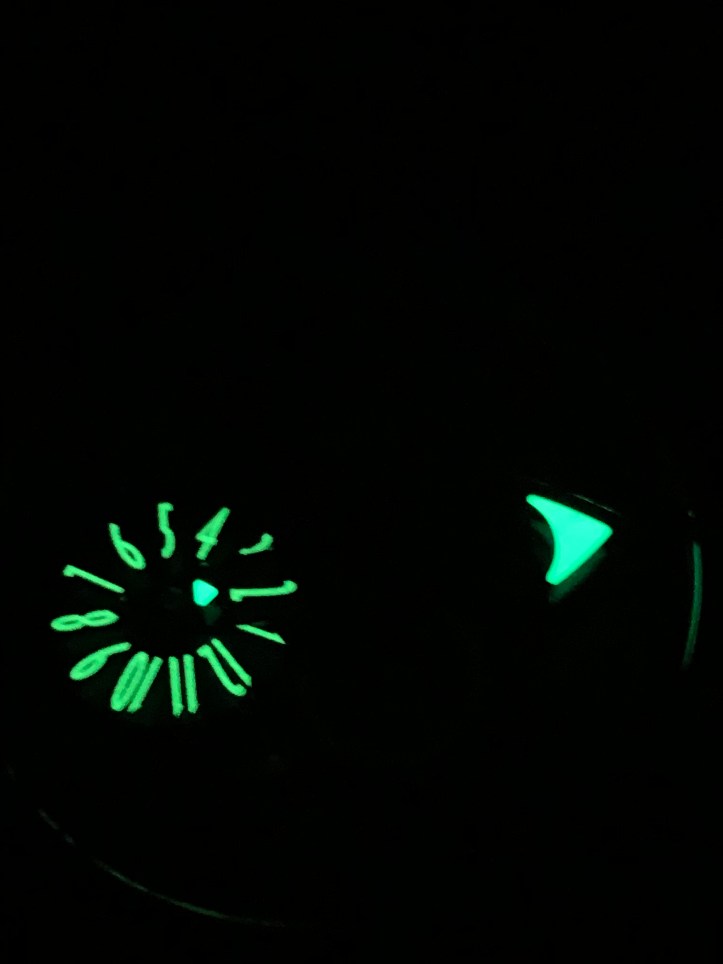 Telling time on the Mystery is done via one oversized minute hand that is attached to the hour wheel. The printed hour numerals are coated with superluminova as it the oversized arrow shaped minute hand.