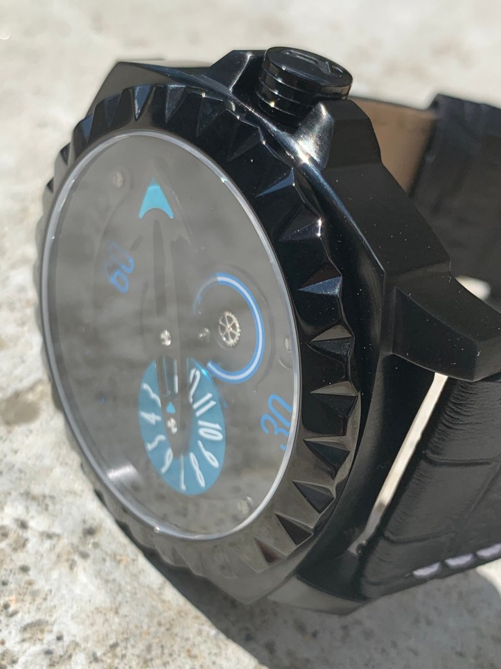 Zoid absolutely nailed this dial, I love every detail on this dial. The consistency of the using the electric blue as accentuating detail on the hands, numerals, minute markers and the arrow/circle. The blue looks absolutely stunning against the matte black dial.