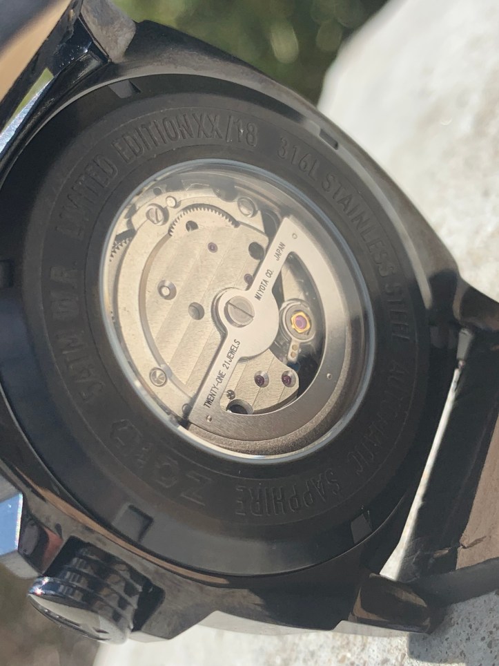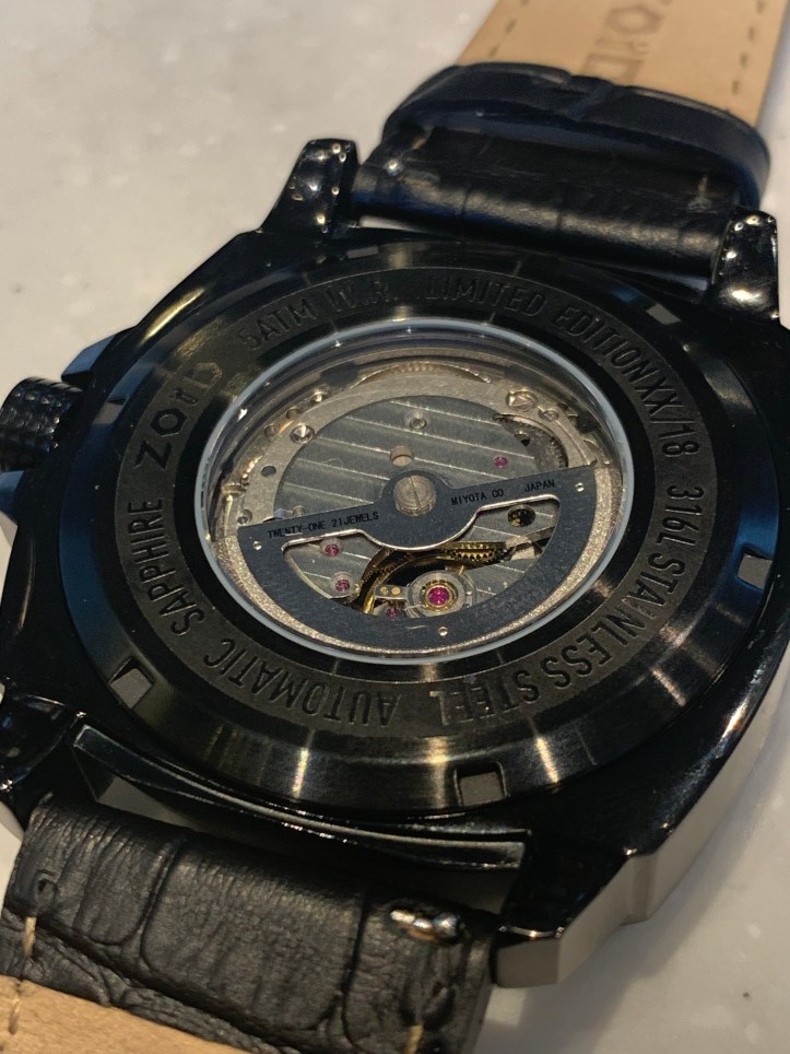 The Zoid Mystery caseback is done in the exhibition style allowing a look at the modified miyota movement.