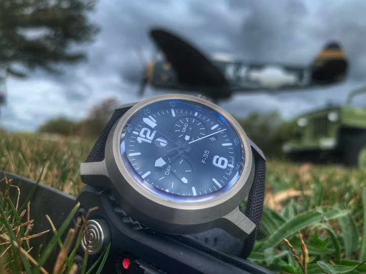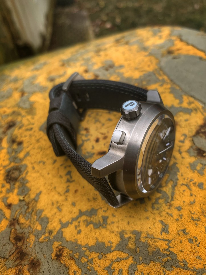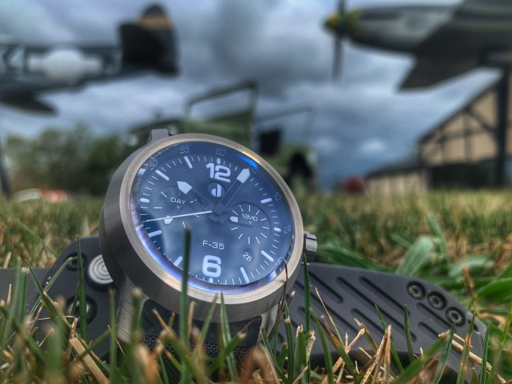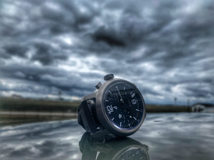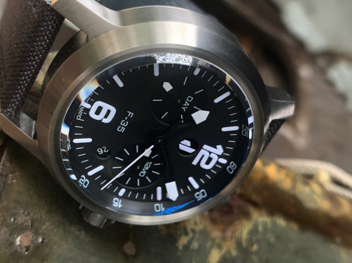 The F-X5 is the sophomore release for Australian brand Duzu which is headed by the passionate Wayne McCay. Wayne was nice enough to send me the F-X5 prototype so that I can take it for a spin, actually for a flight. Just like Wayne’s dive watch, the F-X5 definitely impressed me. The solid piece of titanium that makes up 75% of the case is executed with precision. I love the simplicity of this case and it’s no unnecessary added bullshit attitude. The only area that didn’t impress me on the case is the button pusher that changes the month sub dial. I would have preferred a subset button that required a special tool to change the month. This would have added even more of a clean/simplistic look to the case. Making this change would also allow for a larger crown thus making it that much easier to grip and operate.