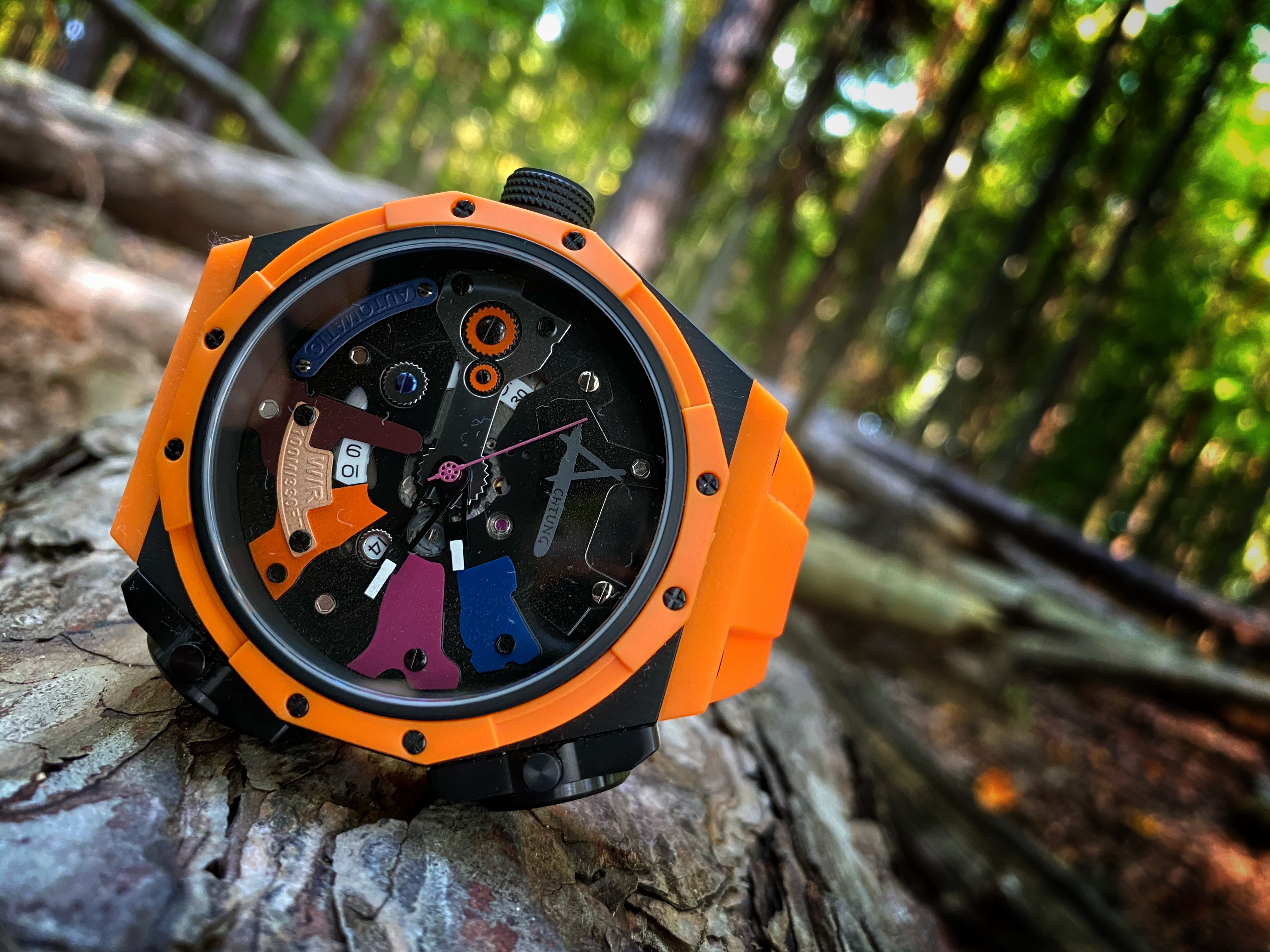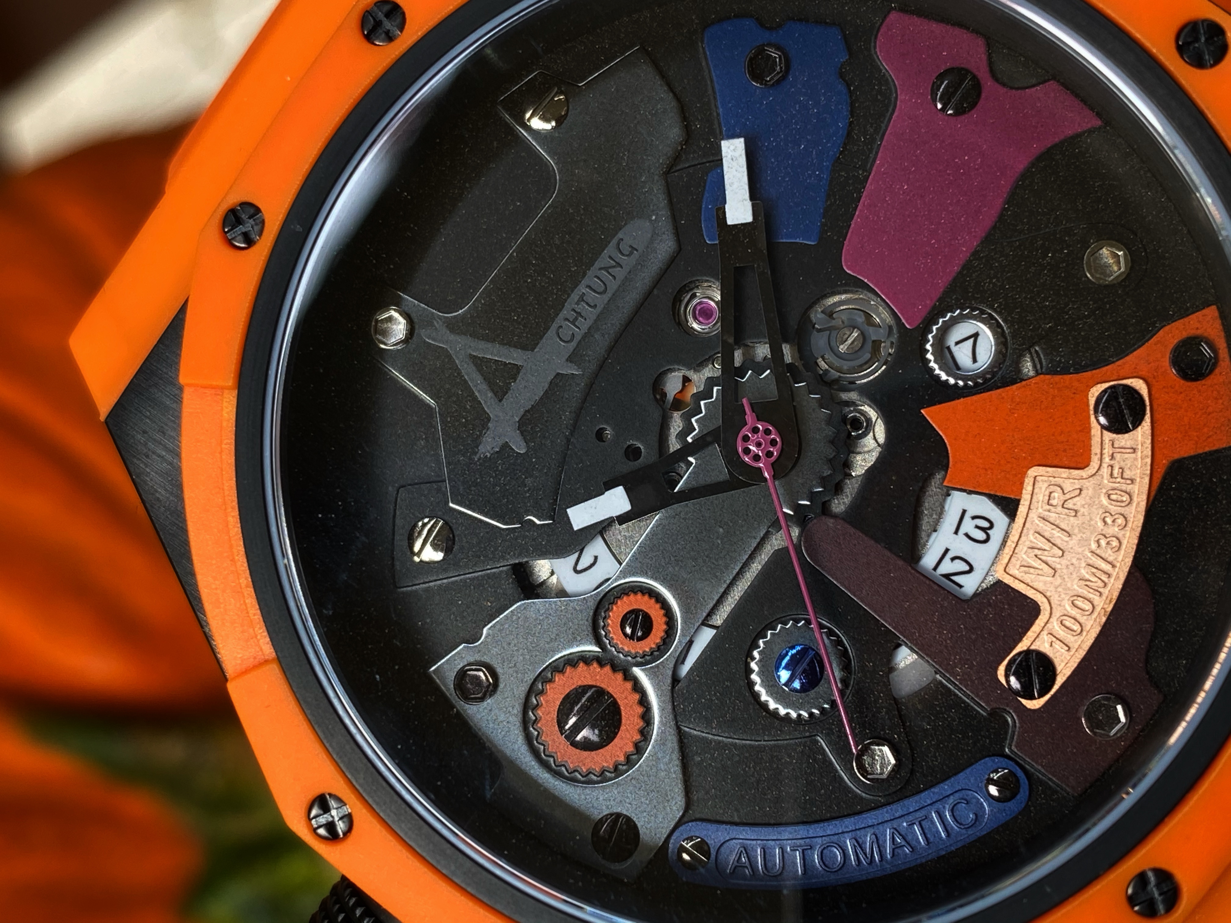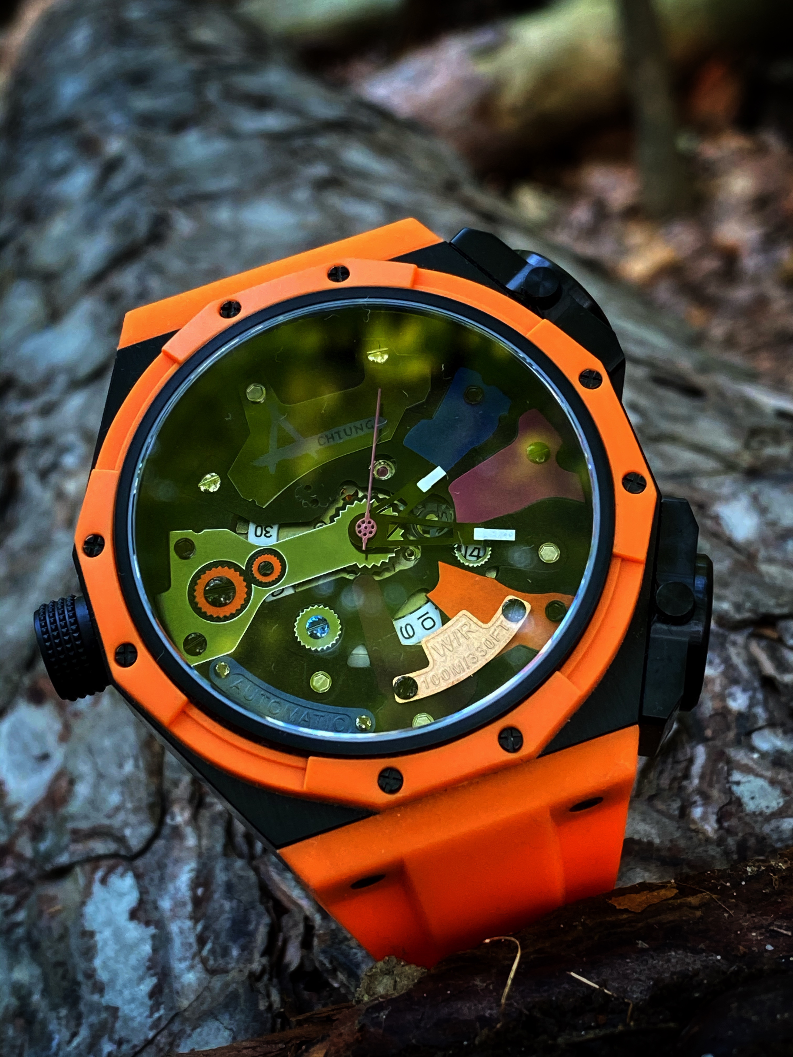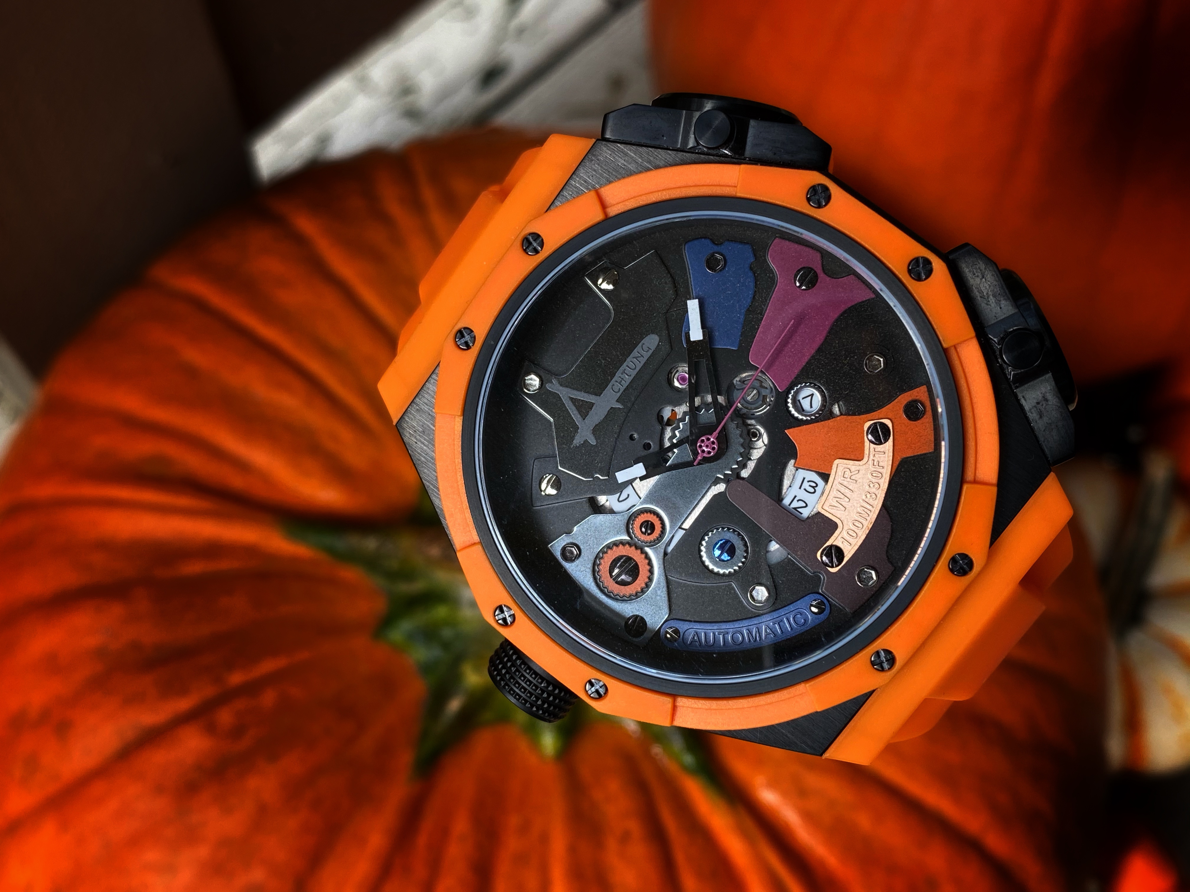 As unique as the case is on the watch, it’s the dial that really pushes the unique. You definitely get a clear view of the dial through the large sapphire crystal. The dial is where my super alloy comment comes into play. The dial reminds me of the armor on those classic robots but the exposed gears remind me of the inner mechanics that are responsible for the movements of the mecha robot. I love the colors and the textures found throughout this dial. What I like about what Achtung did with this dial is the consistency throughout the chaos. There are large, very noticeable details on the dial such as the colored metal plates, some are plain and flat, while other have a bit more detail. Found on separate individual met plates is the type of movement, the water resistance, and the name of the brand. A very unique way to display this information upon the dial. Each metal plate is held securely in place by screws which doesn’t sound like anything out of the ordinary. The gear style border around the date window was a clever way to keep the consistency flowing. Often times a date window on a dial can disrupt the overall flow of a dial. There’s another detail I want to mention that Achtung has done to help that consistent flow continue throughout this dial. It’s quirky yet I find it quite charming. I appreciate that each screw is a different color but what I appreciate more in the commitment to detail is each screw has a different head. It’s an example of how a company put thorough thought into their design on their watch.