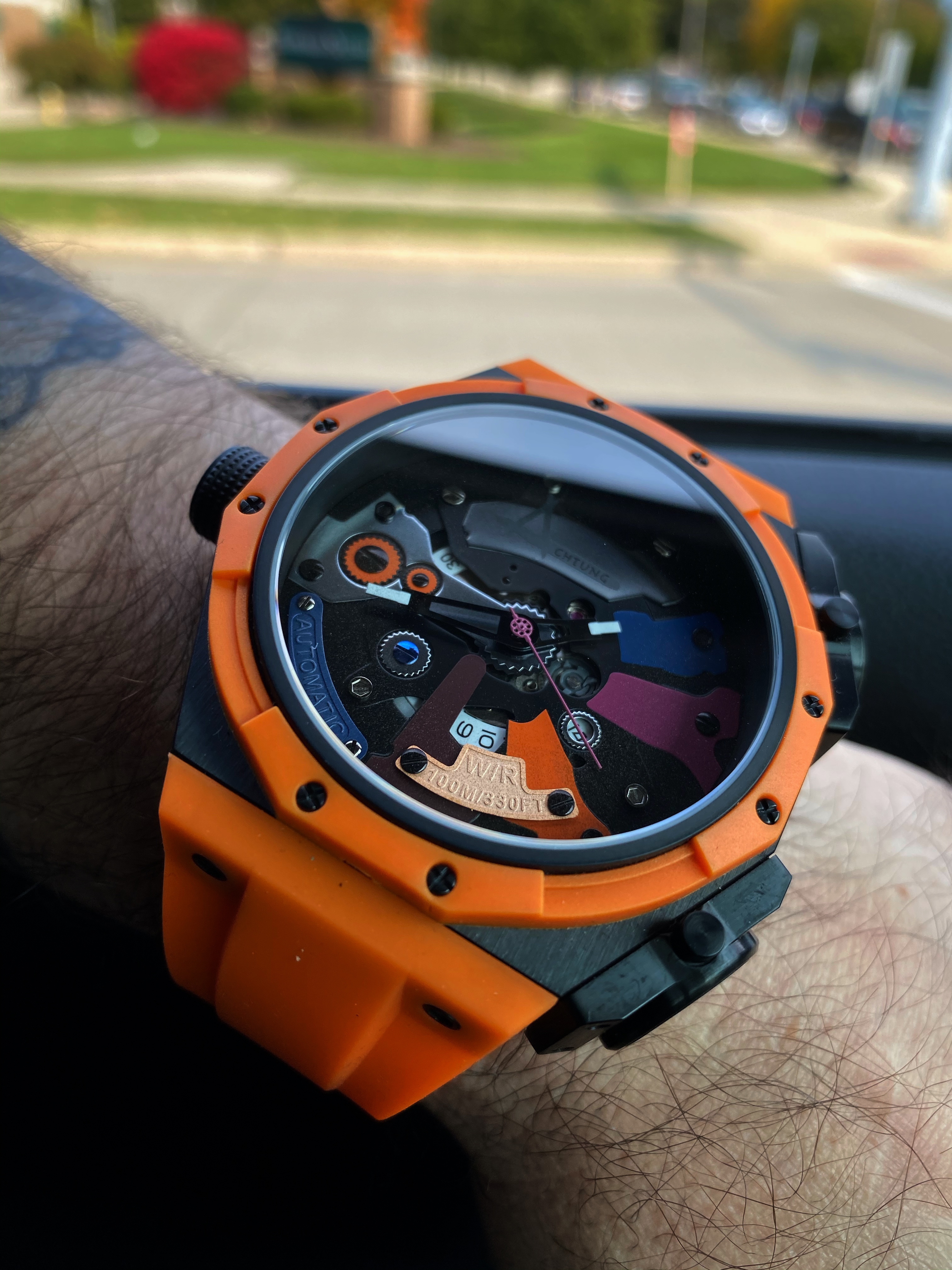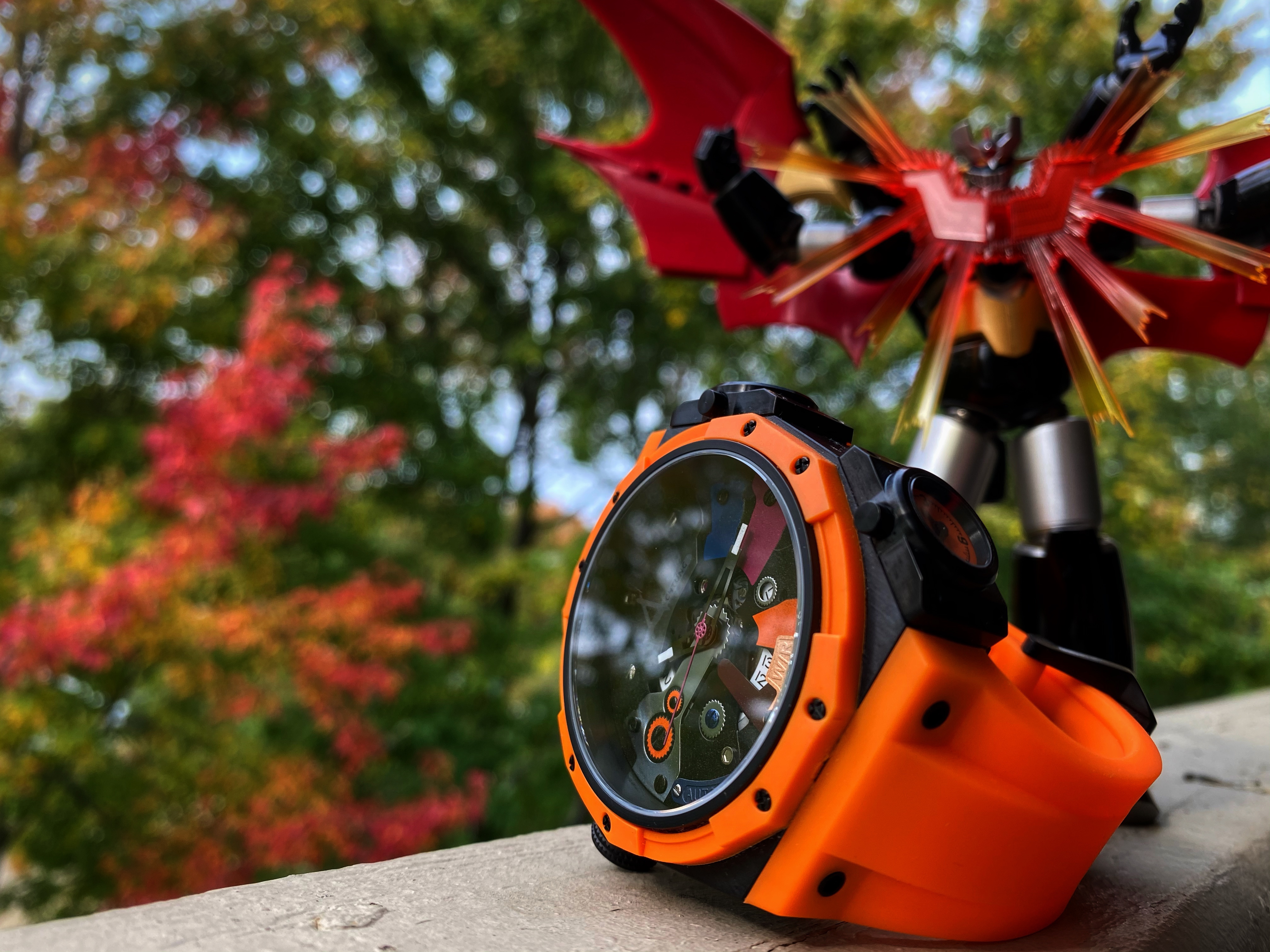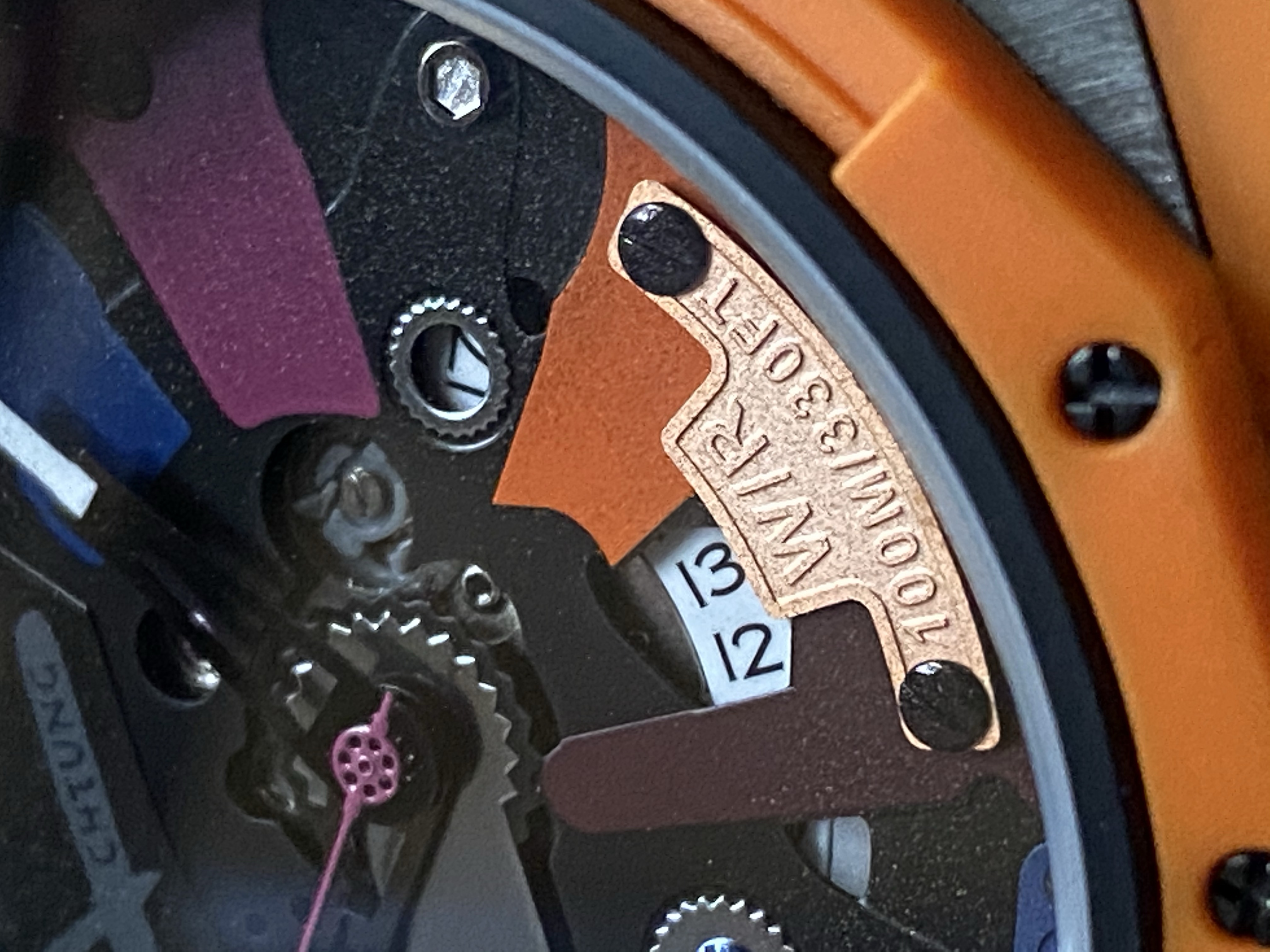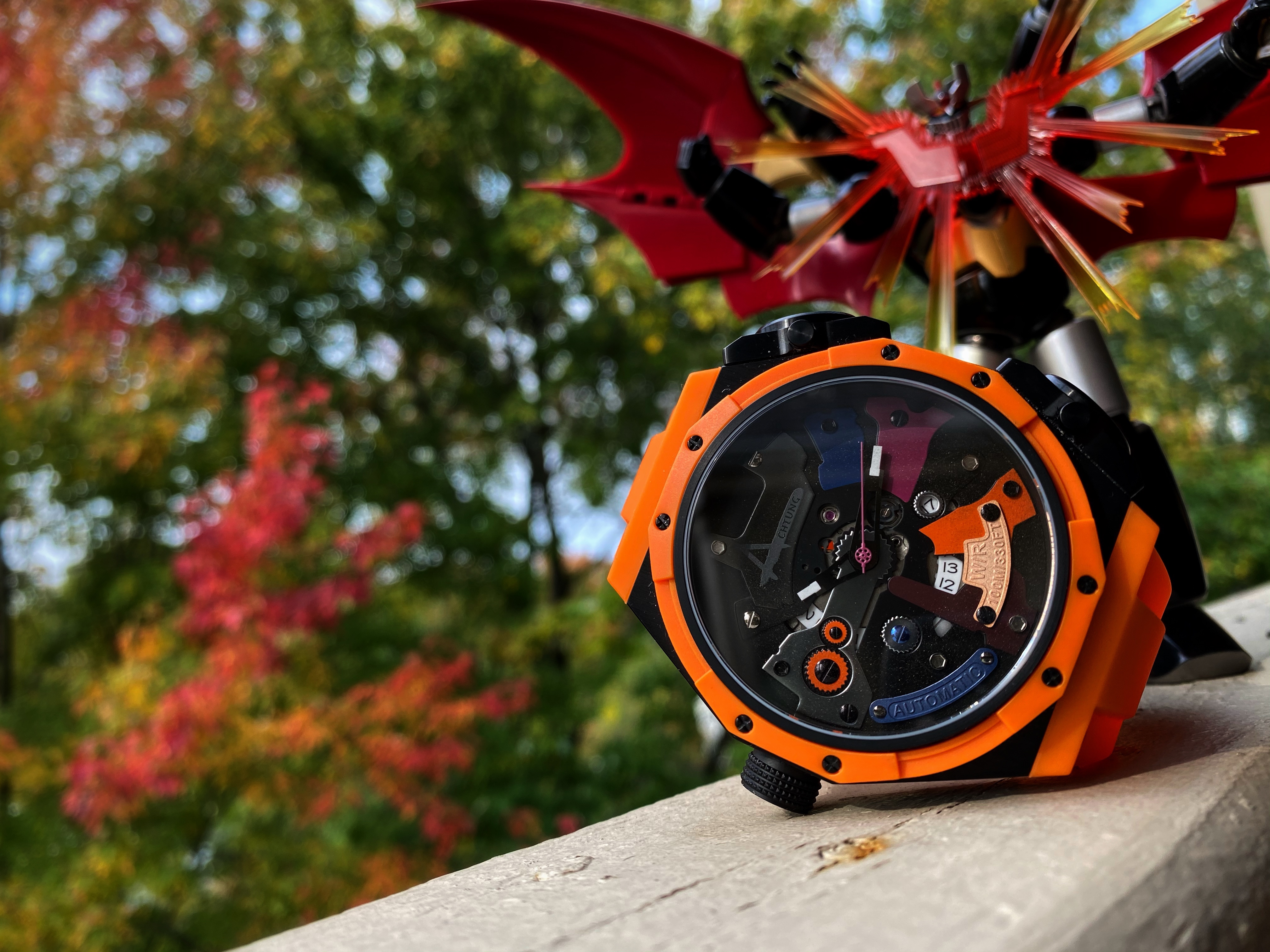 As unique as the case is on the watch, it’s the dial that really pushes the unique. You definitely get a clear view of the dial through the large sapphire crystal. The dial is where my super alloy comment comes into play. The dial reminds me of the armor on those classic robots but the exposed gears remind me of the inner mechanics that are responsible for the movements of the mecha robot. I love the colors and the textures found throughout this dial. What I like about what Achtung did with this dial is the consistency throughout the chaos. There are large, very noticeable details on the dial such as the colored metal plates, some are plain and flat, while other have a bit more detail. Found on separate individual met plates is the type of movement, the water resistance, and the name of the brand. A very unique way to display this information upon the dial. Each metal plate is held securely in place by screws which doesn’t sound like anything out of the ordinary. The gear style border around the date window was a clever way to keep the consistency flowing. Often times a date window on a dial can disrupt the overall flow of a dial. There’s another detail I want to mention that Achtung has done to help that consistent flow continue throughout this dial. It’s quirky yet I find it quite charming. I appreciate that each screw is a different color but what I appreciate more in the commitment to detail is each screw has a different head. It’s an example of how a company put thorough thought into their design on their watch.