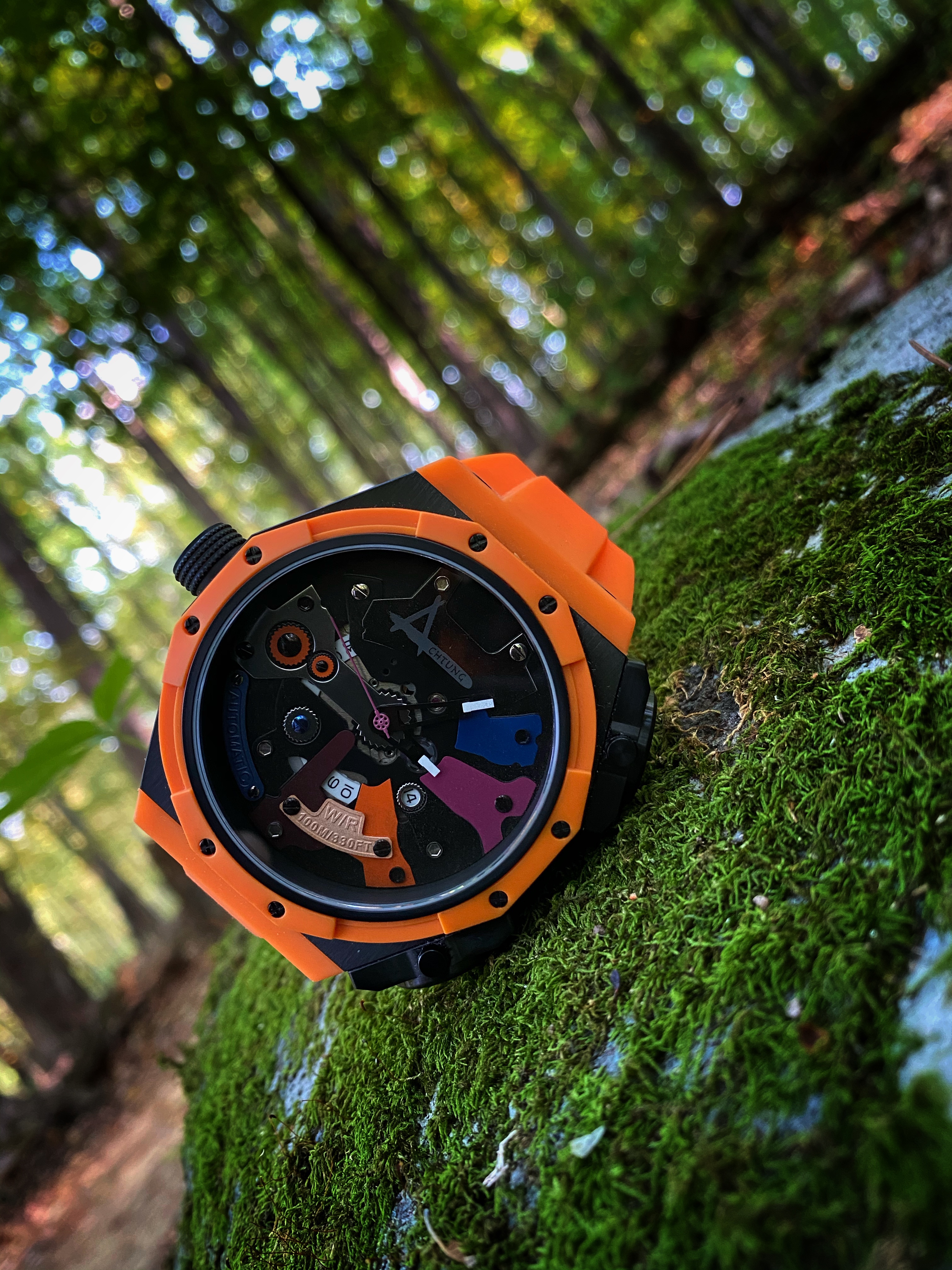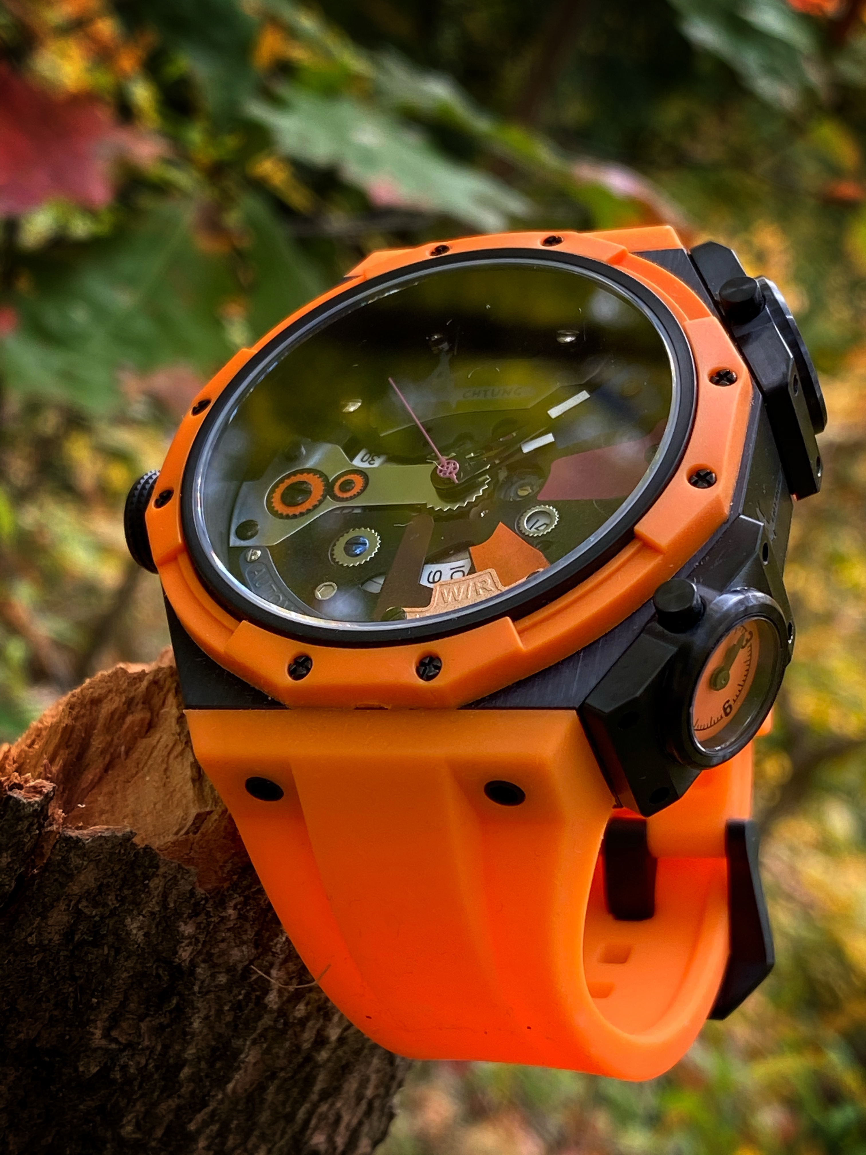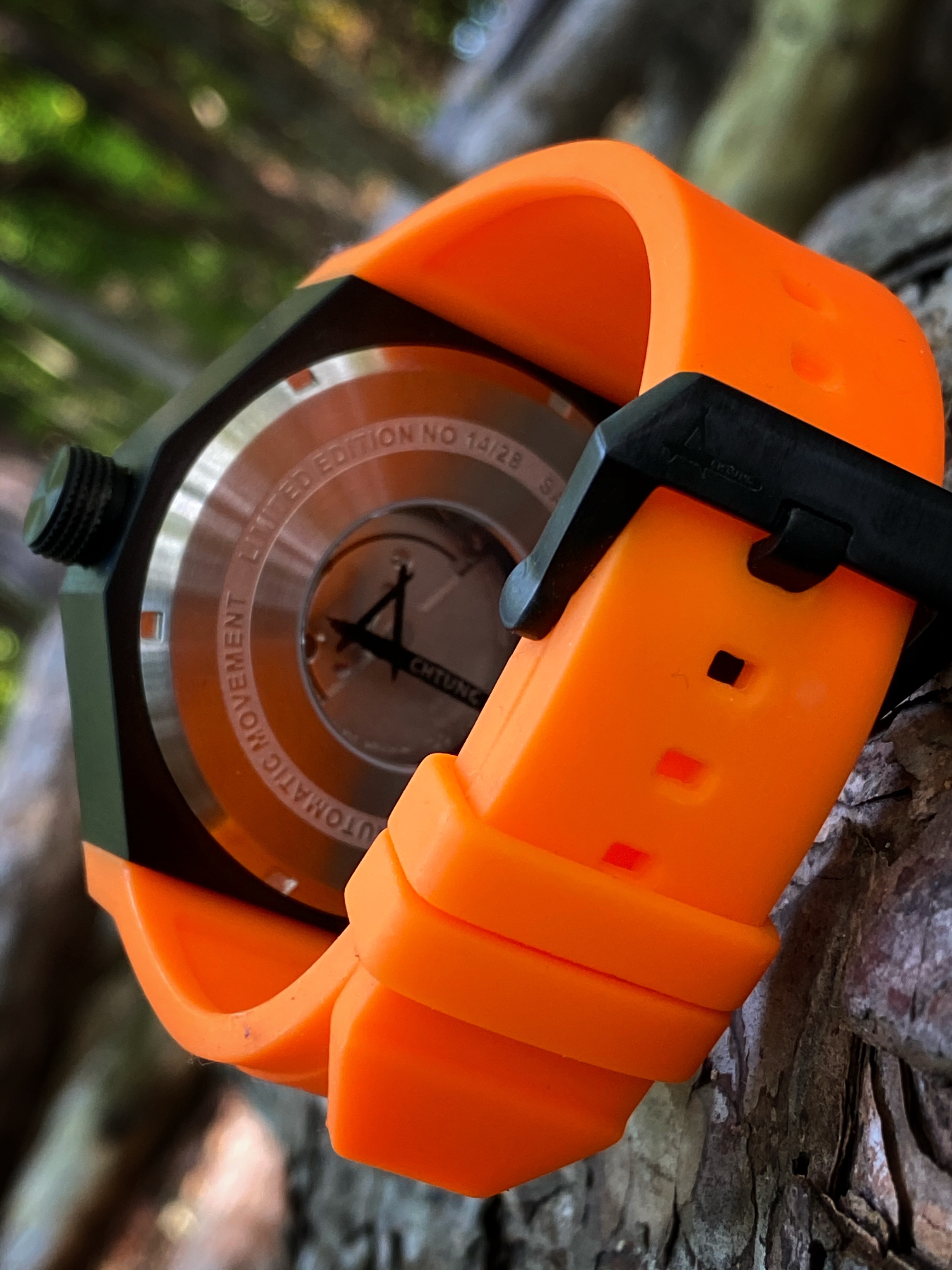 There is no denying that large 53mm watch is packed full of unique personality. It’s a limited edition watch that targets a limited demographic. Beneath the unique exterior of the Metal is the function of this watch. There wasn’t any sacrifices made in terms of function for the overall uniqueness of this watch. Winding this watch manually via the oversized crown is done with smoothness and with ease. Despite the busy and the textured dial, telling time on the Metal is done without obstruction. The large semi-skeletonized hands are easy to see for telling the time despite the lack of numerals on the dial. Even at 53mm, this watch is actually comfortable to wear. No lugs means less wrist overhang for those with smaller wrists. The silicon strap conforms to the wrist with it’s pliable soft nature. The Metal watch is priced at $664 USD. Only 28 were made of each color variation. It’s a fun and unique watch to wear while making a bold statement on the wrist. You can purchase the Metal via https://achtungtime.com/collections/all/products/achtung-metal-orange