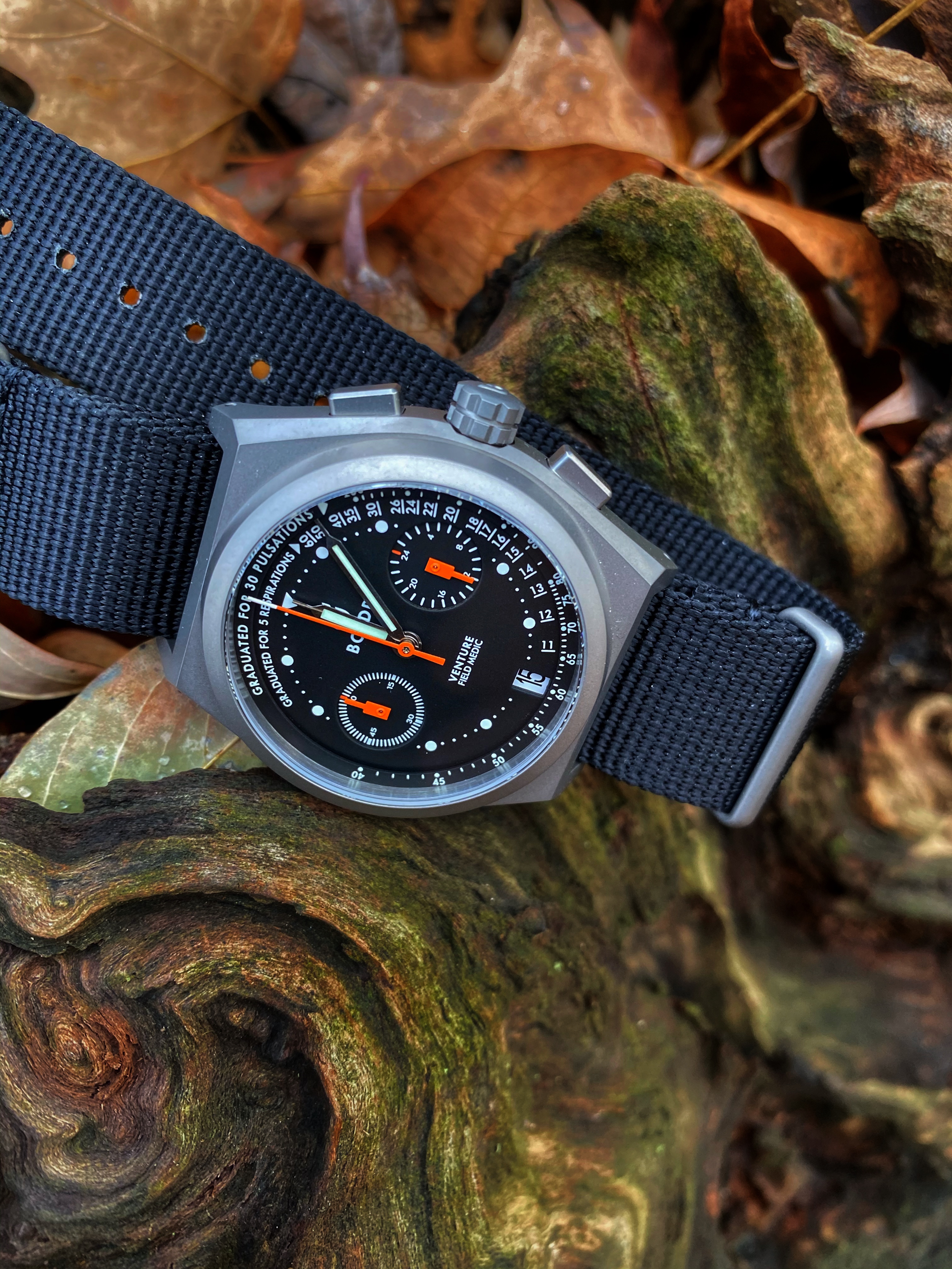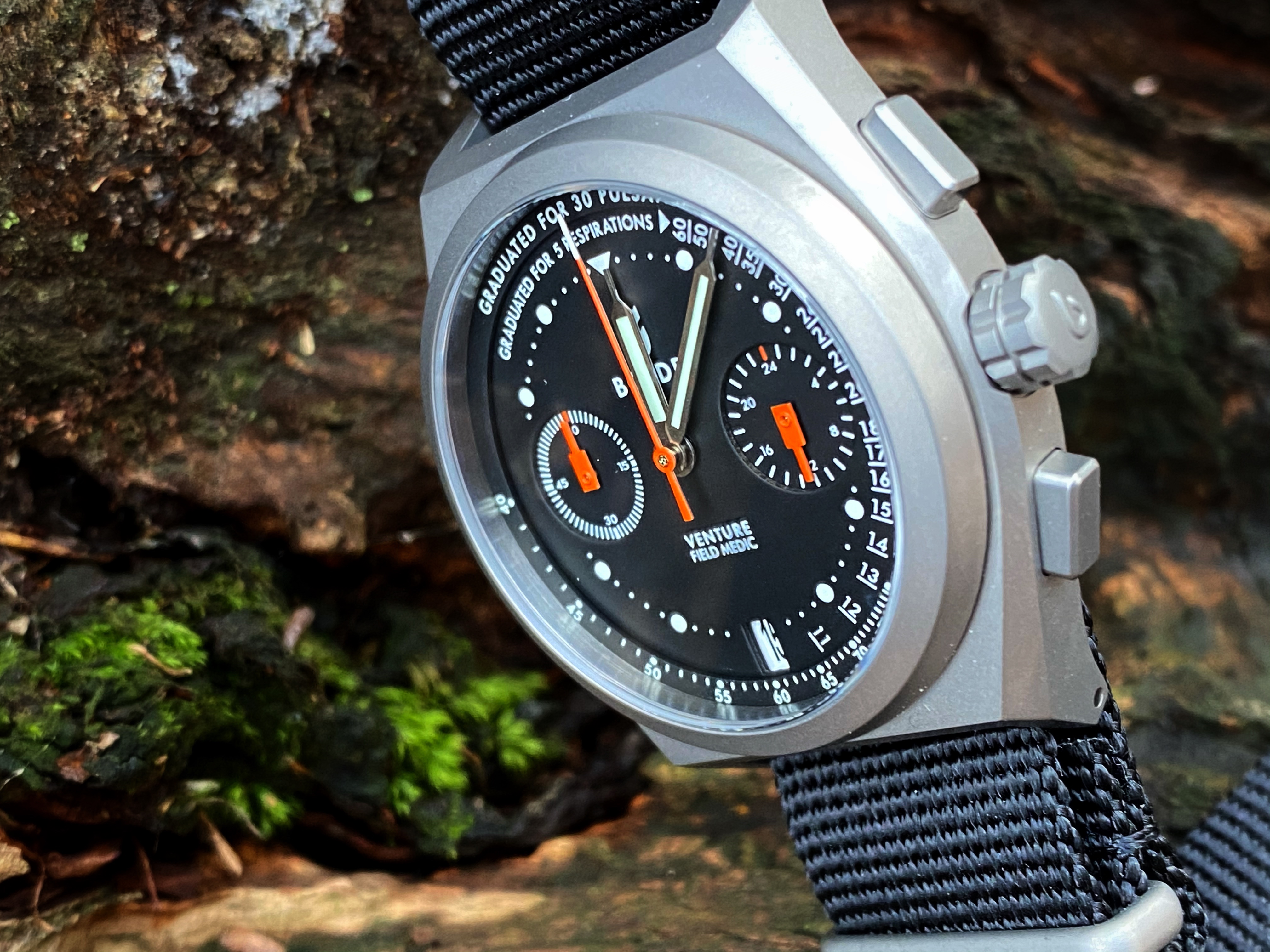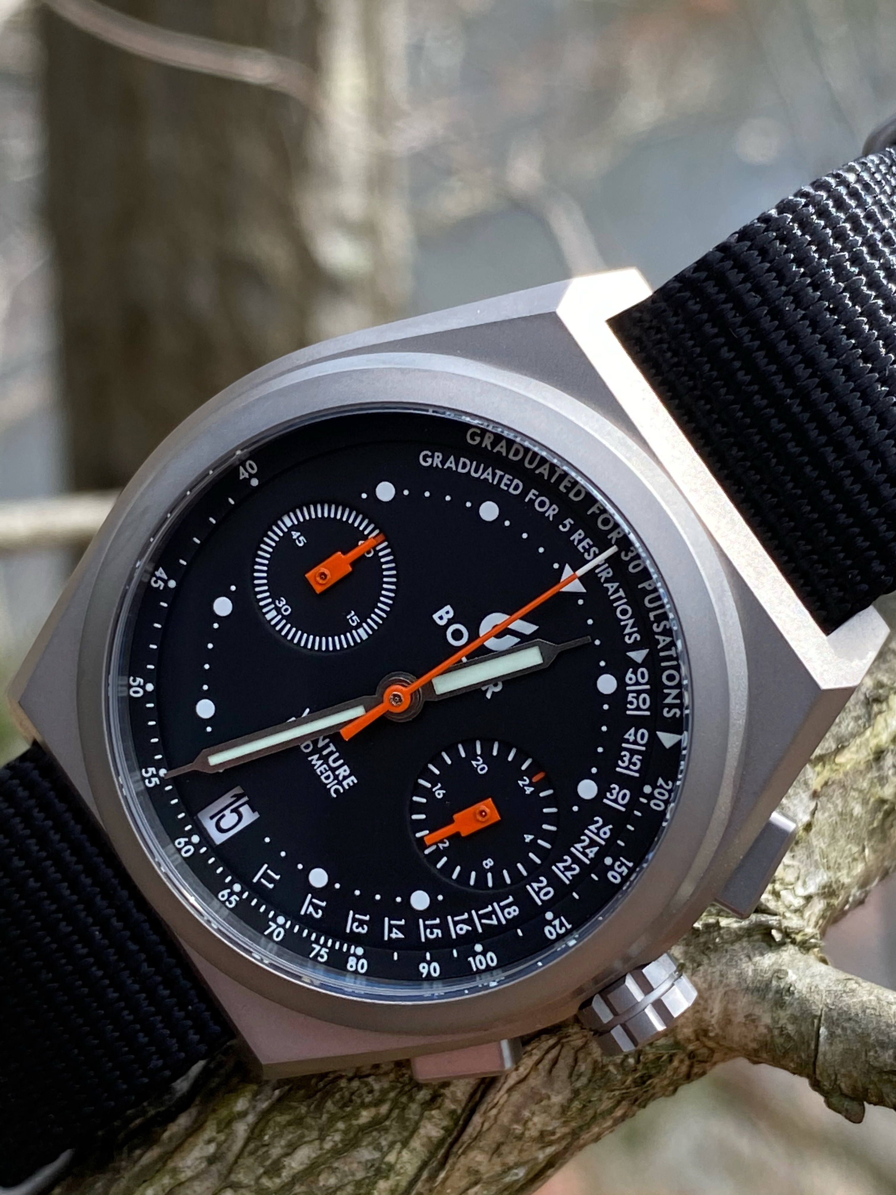 The Field Medic is a well executed piece that is an example of a quintessential tool watch. A watch that can be relied upon in the field, whether you are a first responder, a nurse, a respiratory therapist or a person interested in tracking your vital signs during exercise. It’s a handy tool to have strapped to your wrist. The Field Medic is a well designed and thought out watch that functions without flaw and wears without physical obstruction. It retains a relatively compact size at 38mm x 12.2mm teamed with the lightweight titanium allowing the watch to be worn with comfort in all environments and weather conditions. The 44mm lug to lug measurement allows the watch to hug the wrist without overhang. This can be seen quite apparently by the lug design alone due to the “under-mount”/recessed lug style. It handled itself perfectly during a thunderstorm with pea sized hail and massive wind gusts and it also handled itself in doors when taking vital signs on a patient. I know that it would increase the price of this piece but I would love to see a mechanical version of this watch someday. The Field Medic is a nice value at $299 usd. This would make a good gift option for the healthcare worker in your life especially with Christmas/holidays approaching.