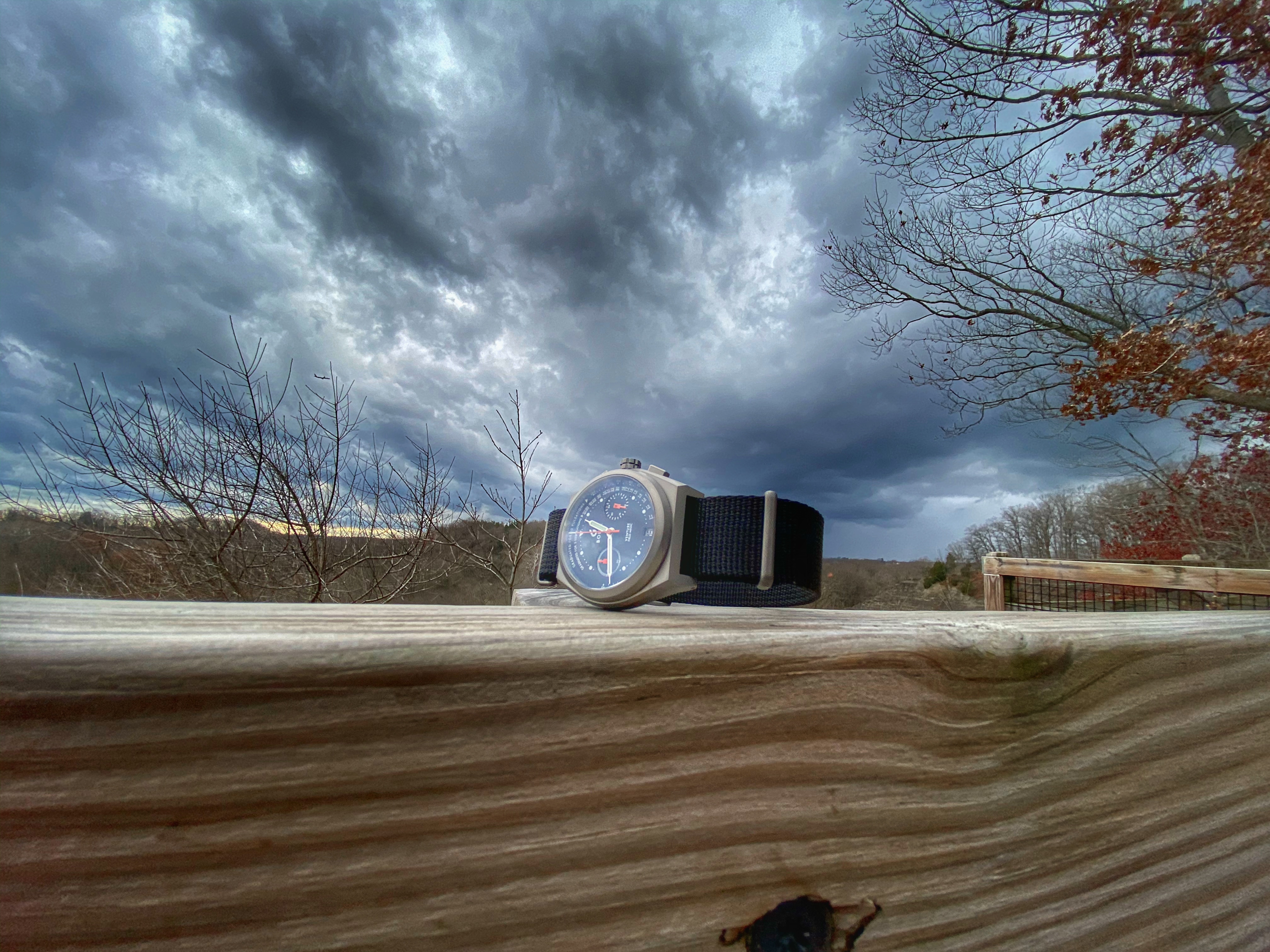 One of the days I was wearing the Field Medic on a hike the weather dramatically changed from partly sunny to cloudy with 70mph wind gusts, with pea sized hail changing over to rain, thunder and lightning. Though I was phased by this because I had to take evasive action to avoid the falling trees and tree limbs, the Field Medic handled itself un-phased. The lugless case design allows the watch to hug the wrist without any overhang whatsoever. This detail also allows the FM to wear slightly smaller than what the dimensions state. The screw down crown and the button pushers don’t interfere with wrist range of motion nor do they dig into the posterior side of the hand. Comfort is important but function is even more important and the crown and pushers function with precision. The size and the design of the crown allows the wearer easy grip/operation for unscrewing/screwing, and for setting the time. I find it frustrating and an inconvenience when a crown is designed undersized. You should never have to struggle to grip/operate a crown or a bezel, no matter where you are using your watch or in whatever conditions.
