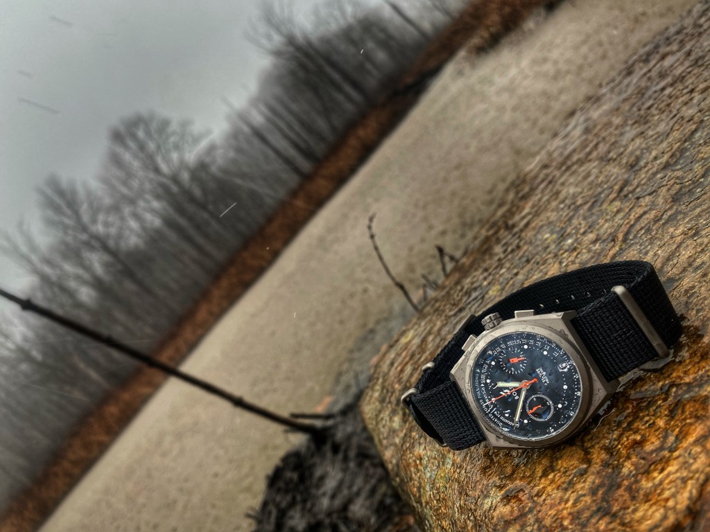 If I’m going on a longer mile count hike I try to only travel with essential and purpose driven gear. I don’t want to expel energy unnecessarily by carrying unneeded gear. Energy conservation and pacing techniques are as important as what I carry with me. The Field Medic watch in very lightweight and very compact. It comes in at 38mm x12.2mm with a titanium case which means the FM is compact and lightweight. The watch easily gets lost on the wrist with prolonged wearing. What I mean by lost is that this watch is so lightweight and comfortable that you lose track of it until you actually need to rely on it. That is a great detail for a watch to have especially when you are in an environment when the temperatures are extreme. When you are layered up to protect yourself from the cold, a lightweight, compact watch is definitely your friend. I typically will wear my watch around the outside of my jacket to limit exposing any skin to the bitter cold. The FM comes on a nato style strap and is long enough to strap it on the outside of a jacket. The flip side of the cold coin is heat and wearing a oversized, heavy watch isn’t ideal. Again, the weight and size of the FM makes it an ideal watch no matter what the temperature is.