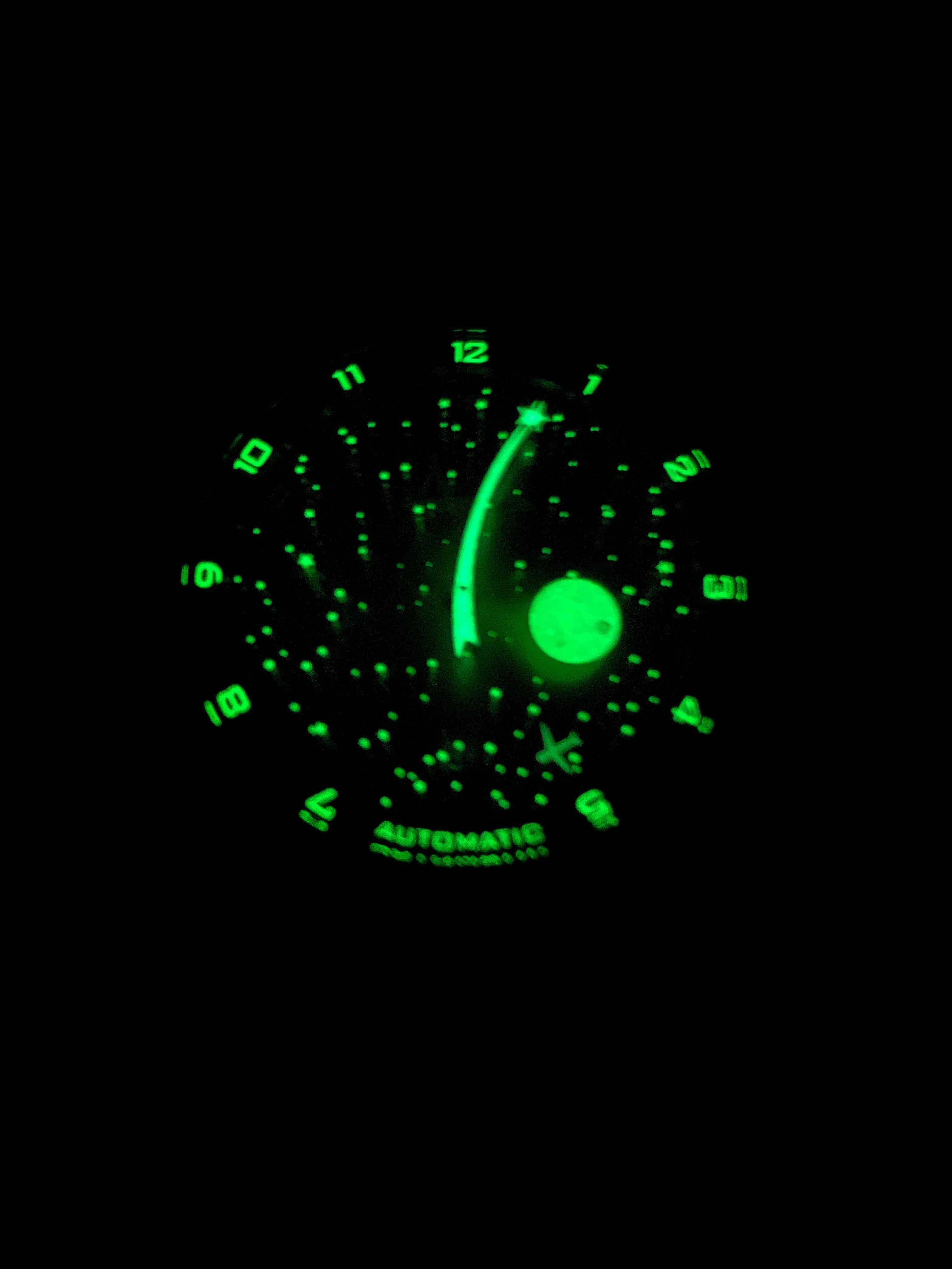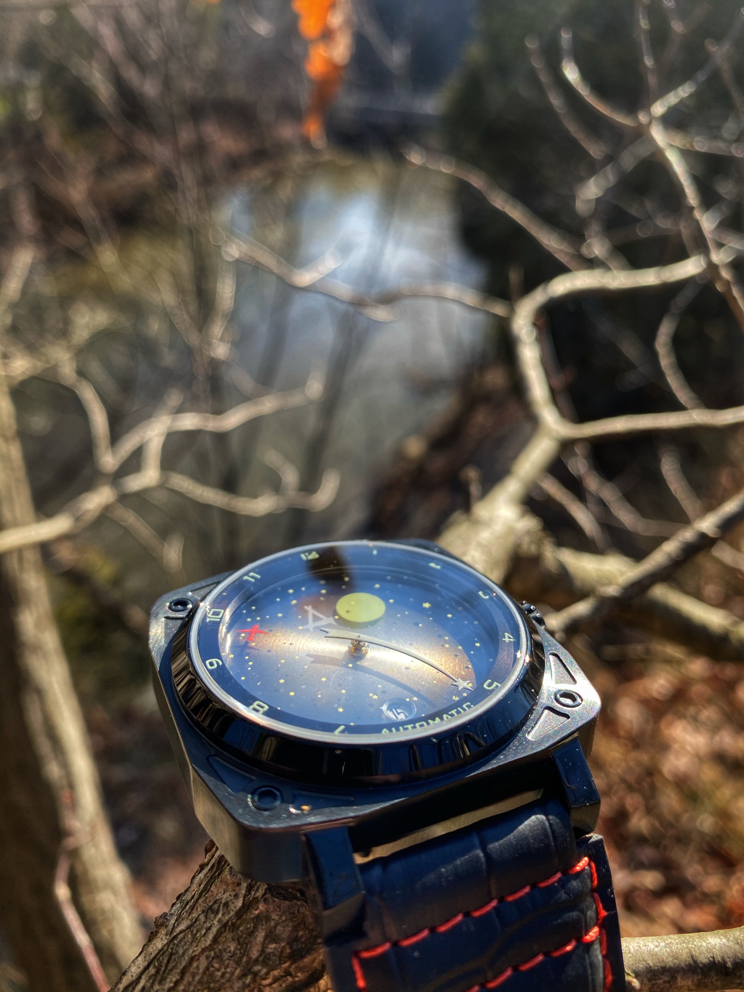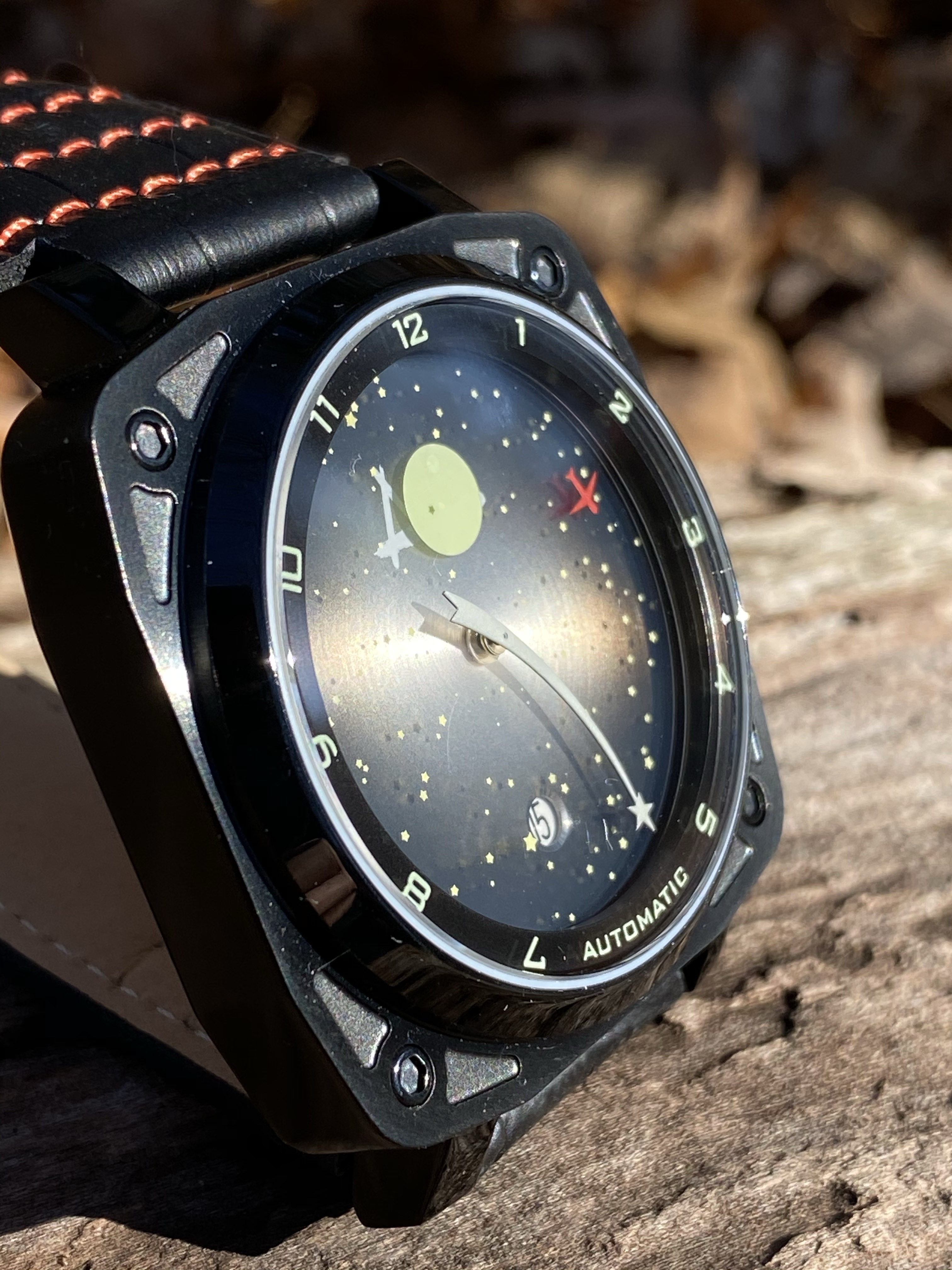 The Galaxy’s dial is one that I could not keep my eyes off of, especially at night. I would charge it up fully with a flashlight before going to bed. While laying in bed, in a completely darkened room, I would admire the brightly glowing mini galaxy on my wrist! One thing that was a surprise to me about this watch was how many complements it received from random people. The average person doesn’t typically notice a watch someone is wearing. Normally it’s only other watch enthusiasts that take notice of a watch on a strangers wrist. People would comment first on the case shape and but when they would get close enough to notice the dial is when I would get comments like “Wow that’s cool but how do you tell the time?” These conversations would always turn into a mini tutorial of how the watch actually functions as a time telling device. I didn’t mind whatsoever as I love talking about watches with anyone that is interested.