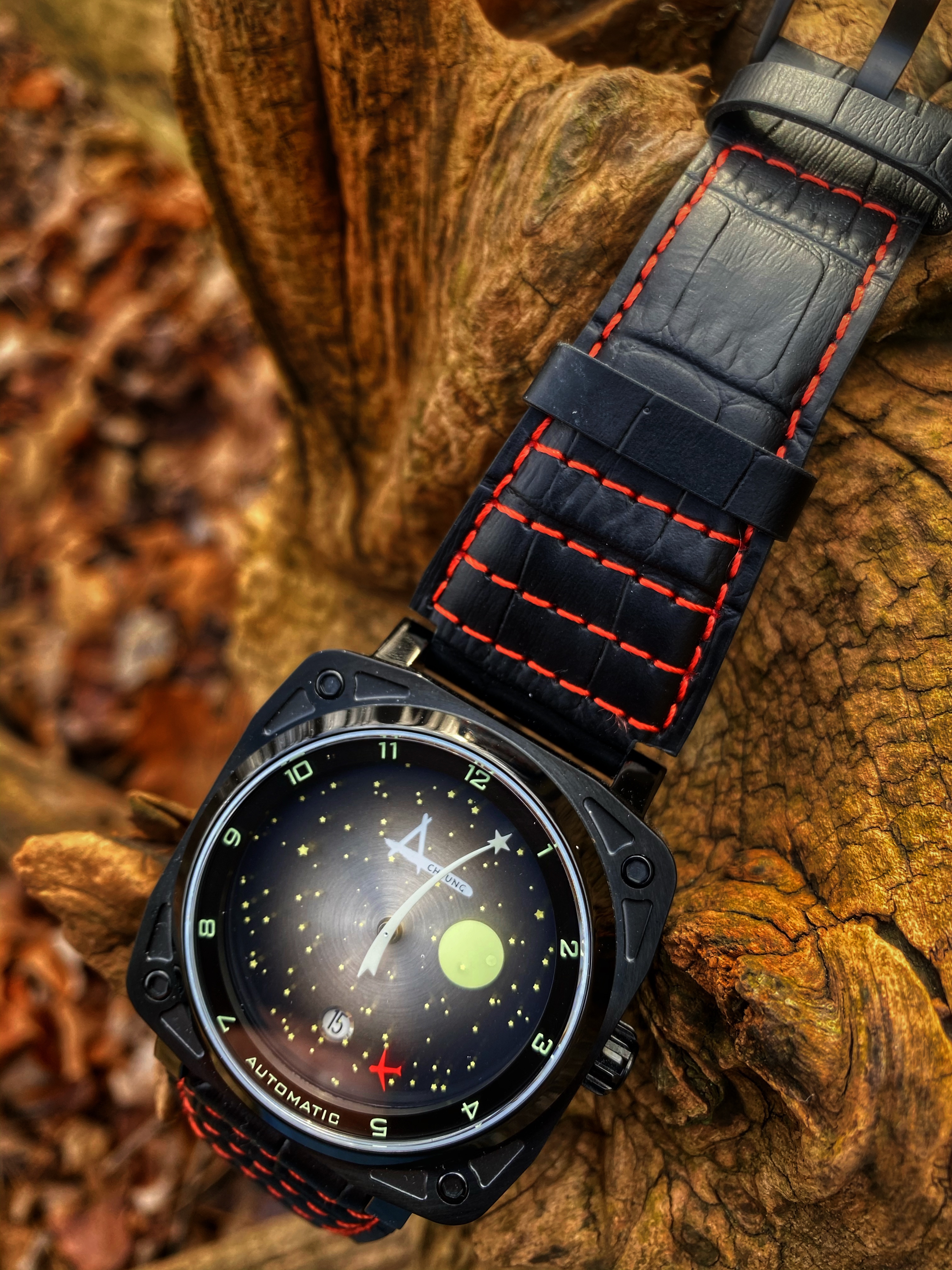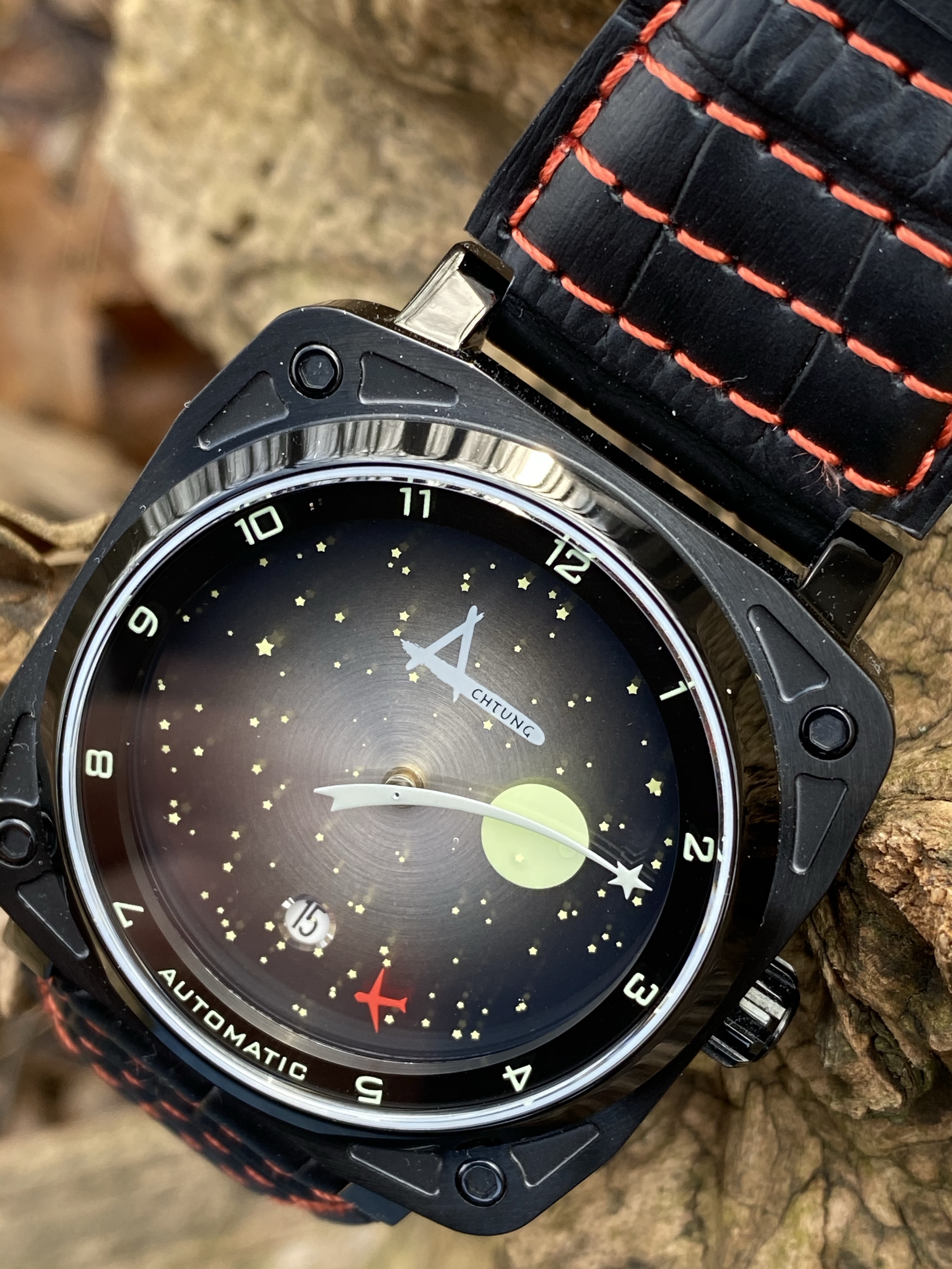 Unconventional time telling. The Achtung Galaxy’s dial is anything but conventional and that’s one of the reasons why it caught my attention. The Galaxy’s theme is centered around space, astronomical centered to be exact. Drawing inspiration from the moon and stars, Achtung designed a rather unique dial. I was intrigued by the overall design and was quite curious on how the time display is read. There isn’t a traditional hour, minute and second hand layout here on the Galaxy. Instead, what we have here in terms of time telling layout is a moon, a plane and a shooting star. “That’s no moon” actually Ben, this time it is a moon. The moon is the “head cheese”, as it’s main responsibility is for pointing to the hour. I was pleasantly surprised that there wasn’t much of a learning curve here once you understand what the key “players” are responsible for in terms of reading the time. The red plane is the pilot of telling the minutes. Next is “le petit prince” shooting star is the second hand. The shooting star is the most “traditional” display in the sense that it’s an actual hand centered on the central axis point of the dial. The tail of the star has a good amount of curvature which plays well with the rest of the dial. The amount of devotion that Achtung is quite apparent with the unique design uniformity that is found throughout this dial. In terms of functional details, this dial received some very cool lume treatment that glows bright like the night sky in the country. The Galaxy is just as legible in the daytime as it is at night, perhaps more so at night 🤔