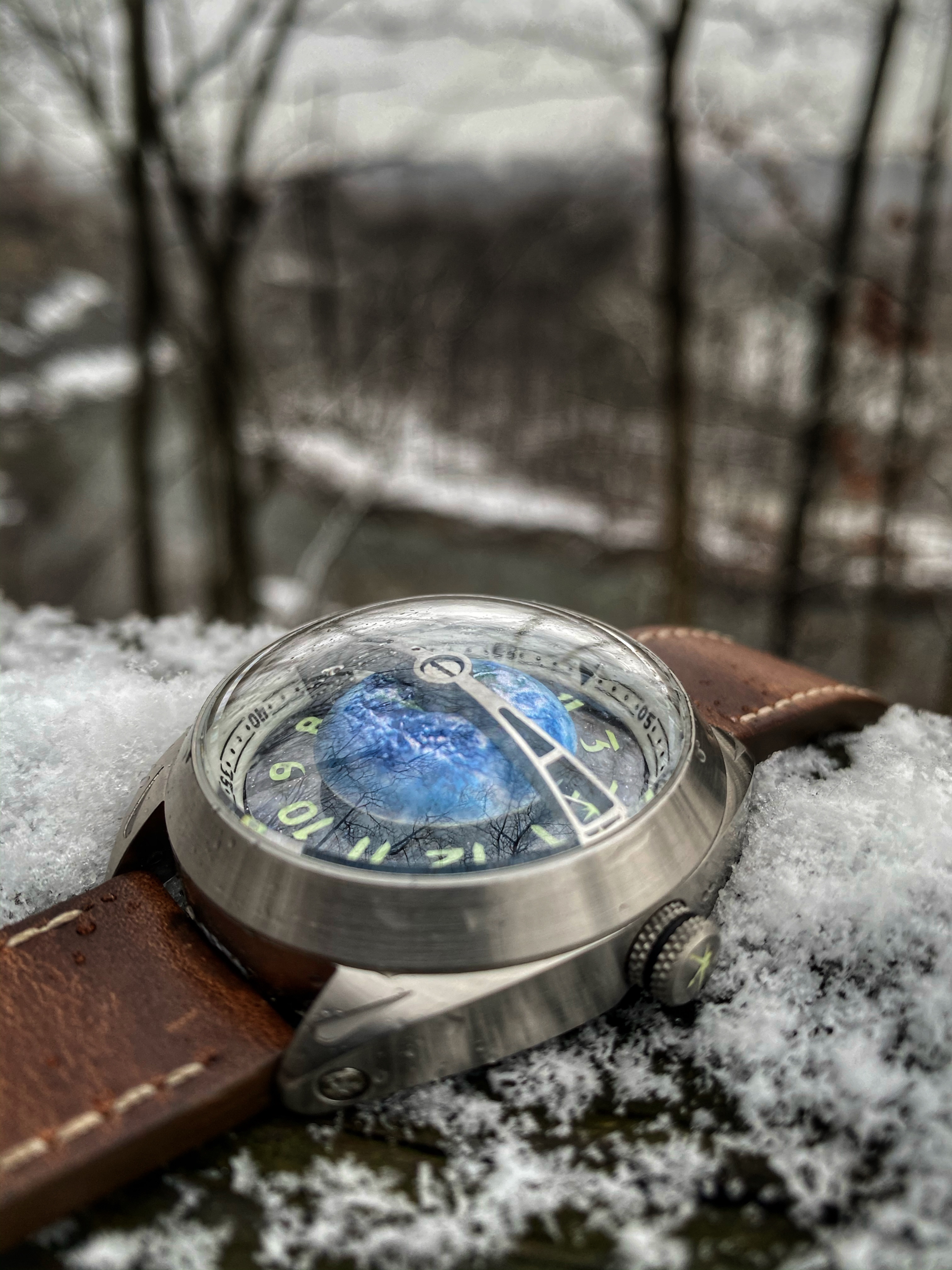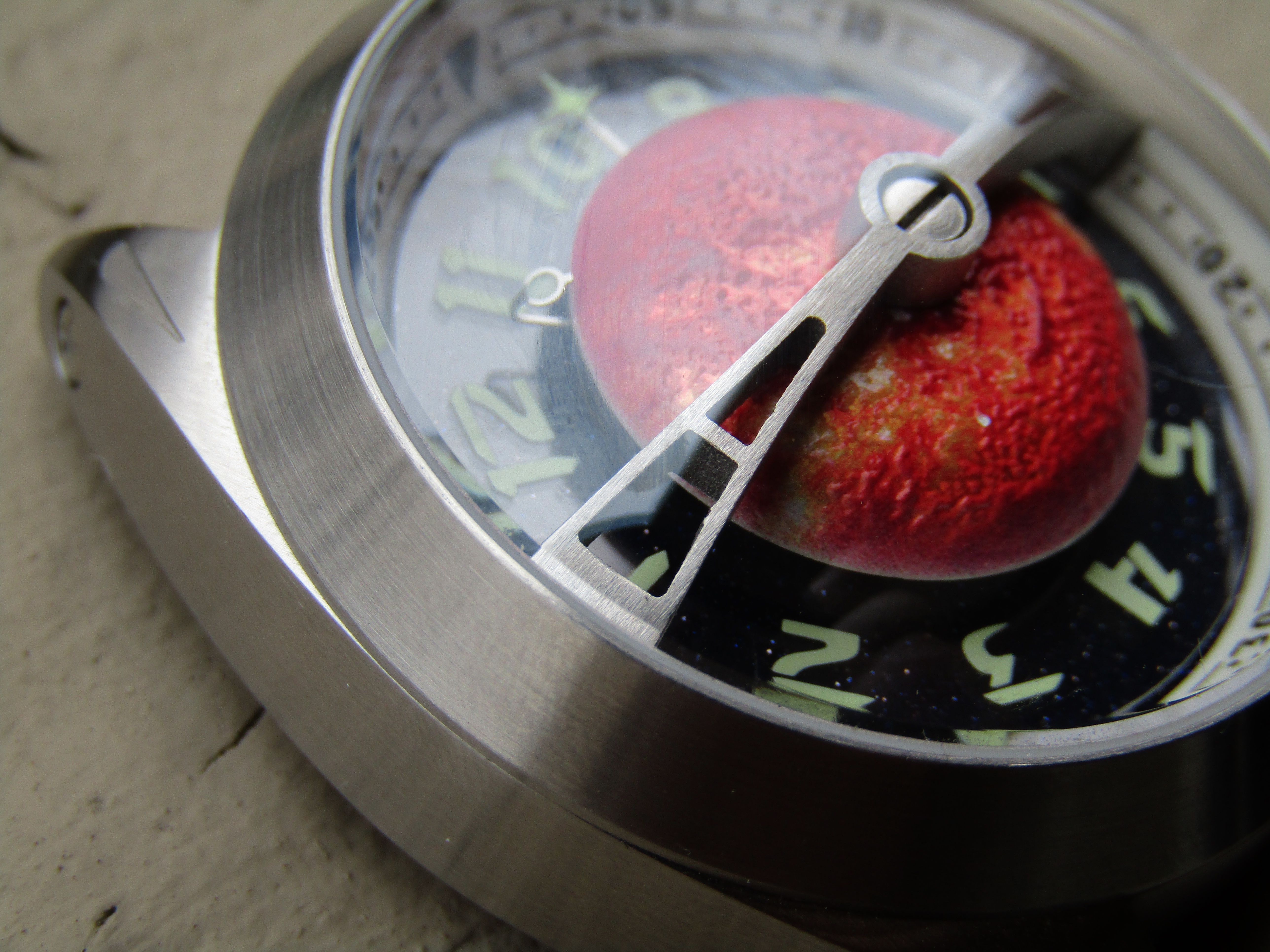 Kaal has done a thorough job of committing to the theme of the Multiverse through the precise execution of these details. The “northern star” tip of the minute hand is an example of the details I am referring to. I like that Kaal made the the tip on the minute hand to resemble a glistening star instead of going with the traditional star ⭐️ shape. The prototype version is an all white star but the production pieces will feature a red outlined star which will allow for greater visibility/legibility. Kaal is also shortening the stem on the minute hand to only allow the star itself to be seen. They are also increasing the size of the star from 3.28mm to 5mm, again this will allow for a much greater legible minute hand. The minute hand isn’t the only hand to receive a size upgrade either. The “orb” or as I like to refer to it as, the satellite second hand size is being increased from 1.4mm to 1.8mm. The satellite second hand orbits around the 3D part of the dial, which is either the earth, moon or sun depending upon the version you chose.