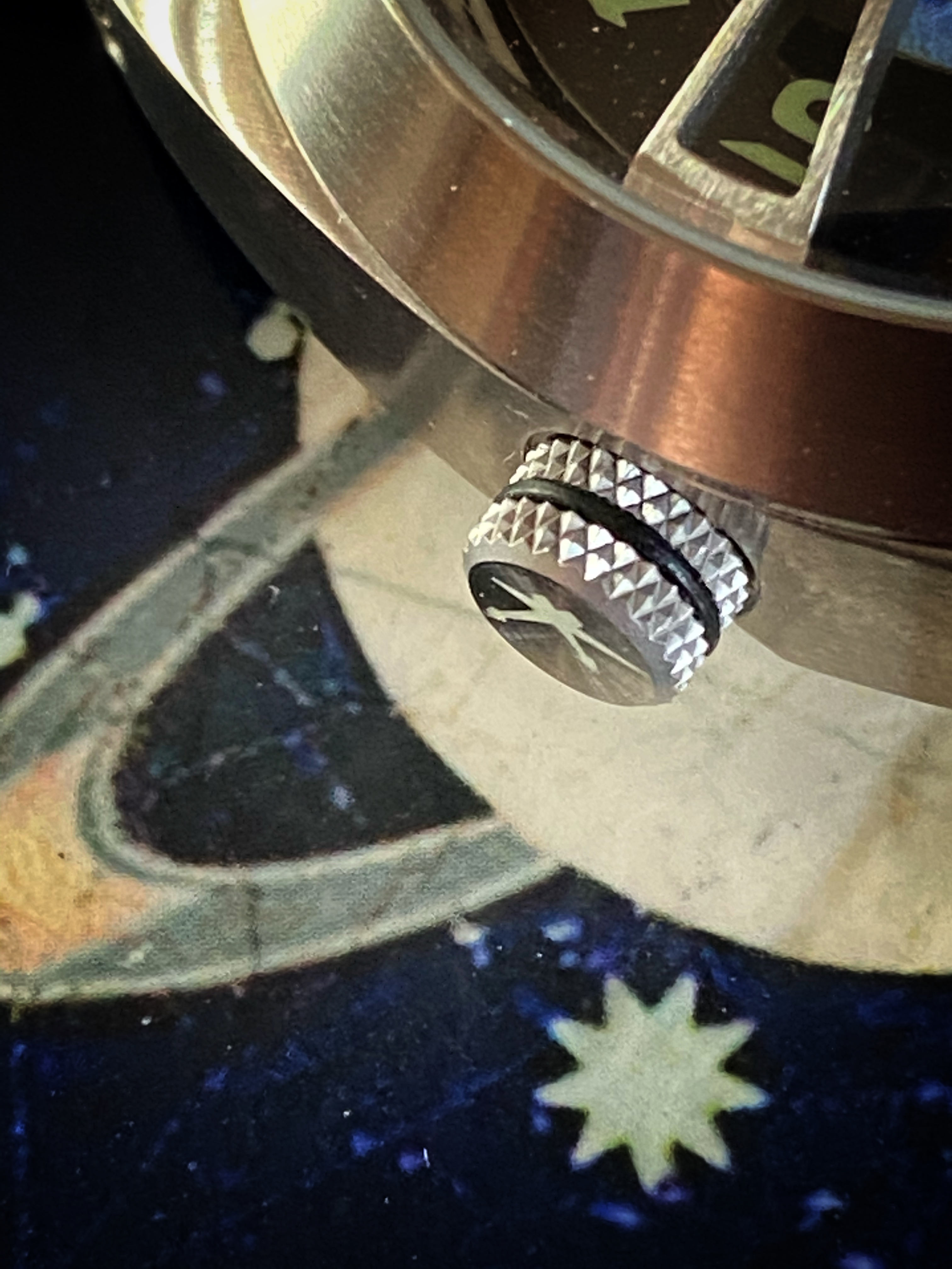 The screw down case back isn’t the end of the fine details that we have seen throughout this watch. It features some nicely raised planetary details that are not only consistent with the Multiverse’s theme, but they are extremely well executed. Sometimes engraved or raised details on a case back can have some sharp edges to them, but that is not the case here. The solar system found on this case back is done smoothly and accurately, but the sun is not the center this time. A small, sapphire crystal porthole is the center of attention on the Multiverse’s case back. A porthole that gives you a small glimpse of the Seiko NH35, Automatic movement with it’s 24 jewels and it’s 41 hour power reserve. Now you know that it being an automatic movement it is wound by the rotation of the weighted rotar and it can also be wound via the crown. The Multiverse features a knurl edged crown that is extremely easy to grip and operate. This crown is a push pull style crown that operates with buttery smooth movement. Setting the time and winding the watch is done with ease and without any of that annoying extra wobble that can plague some watches. The knurl edges is done very well which adds a nice flare of detail to the side of the case which you can notice is void of any crown guards. Adding a bit more detail to this side of the case is the inclusion of the Kaal logo that is etched on the crown itself.